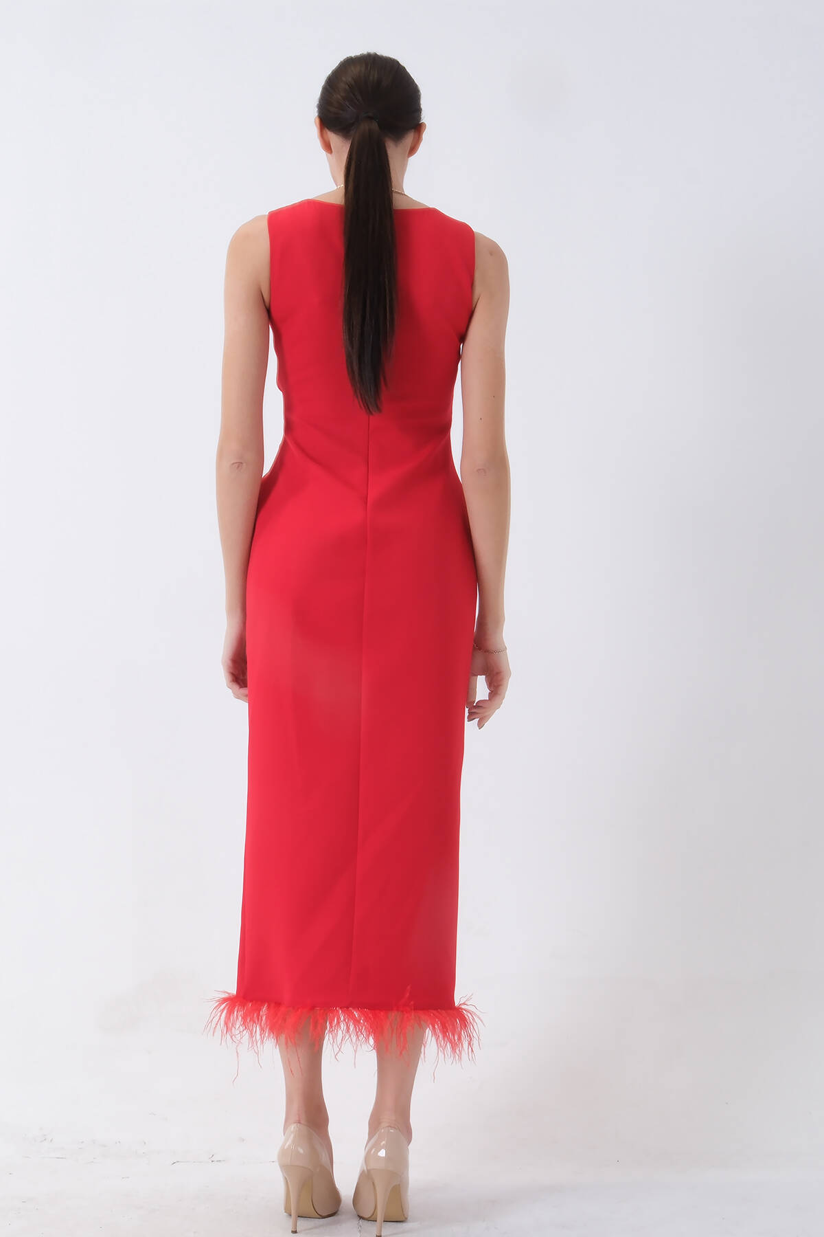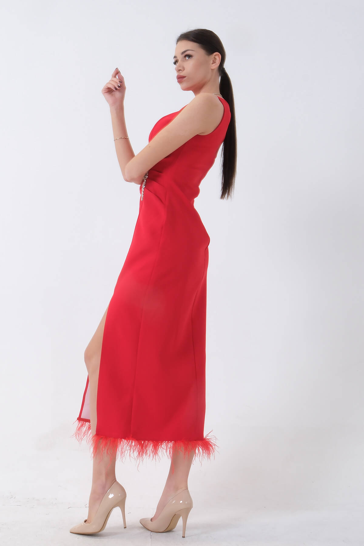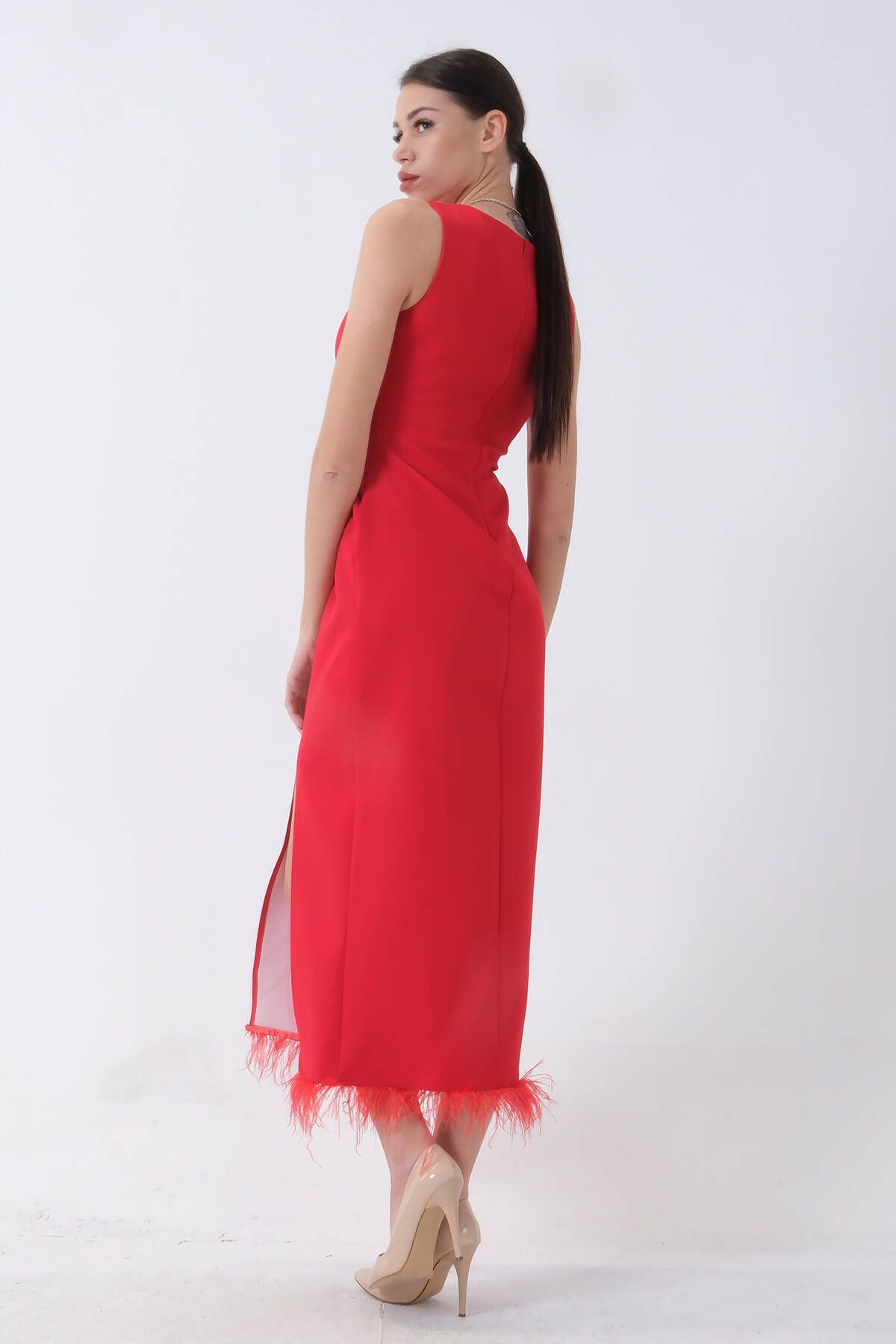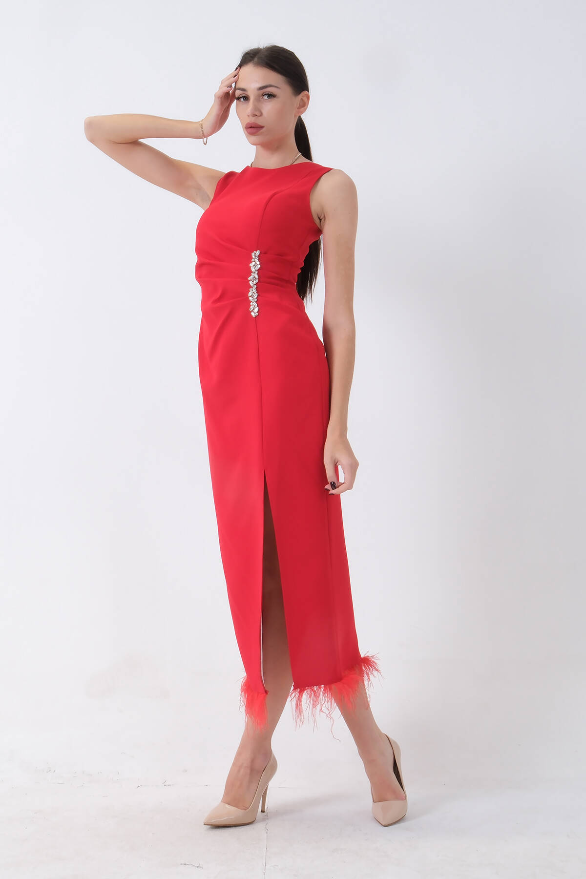 Kırmızı Önü Taş Detaylı Yırtmaçlı Tüy Detaylı Abiye 9705402.08