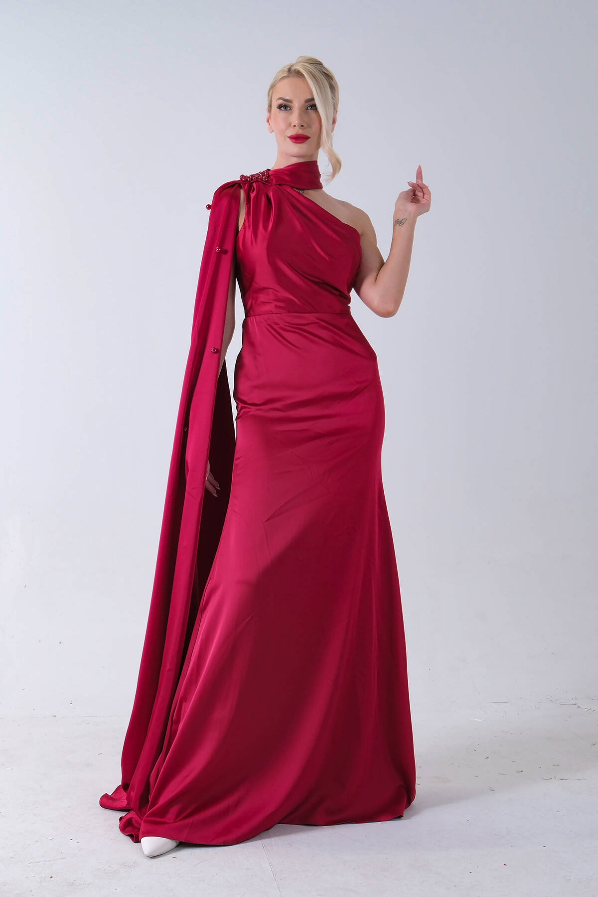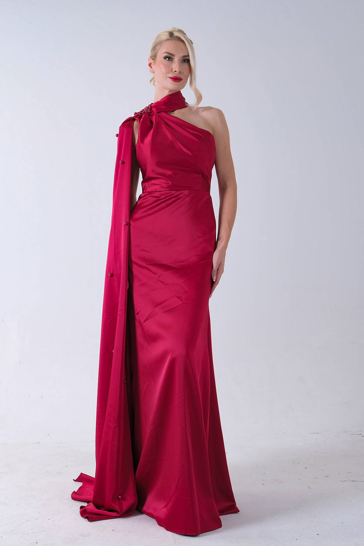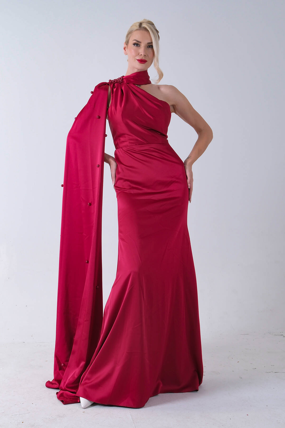 Kırmızı Yaka Kuşak Detaylı Tek Omuz Abiye 0801099.08