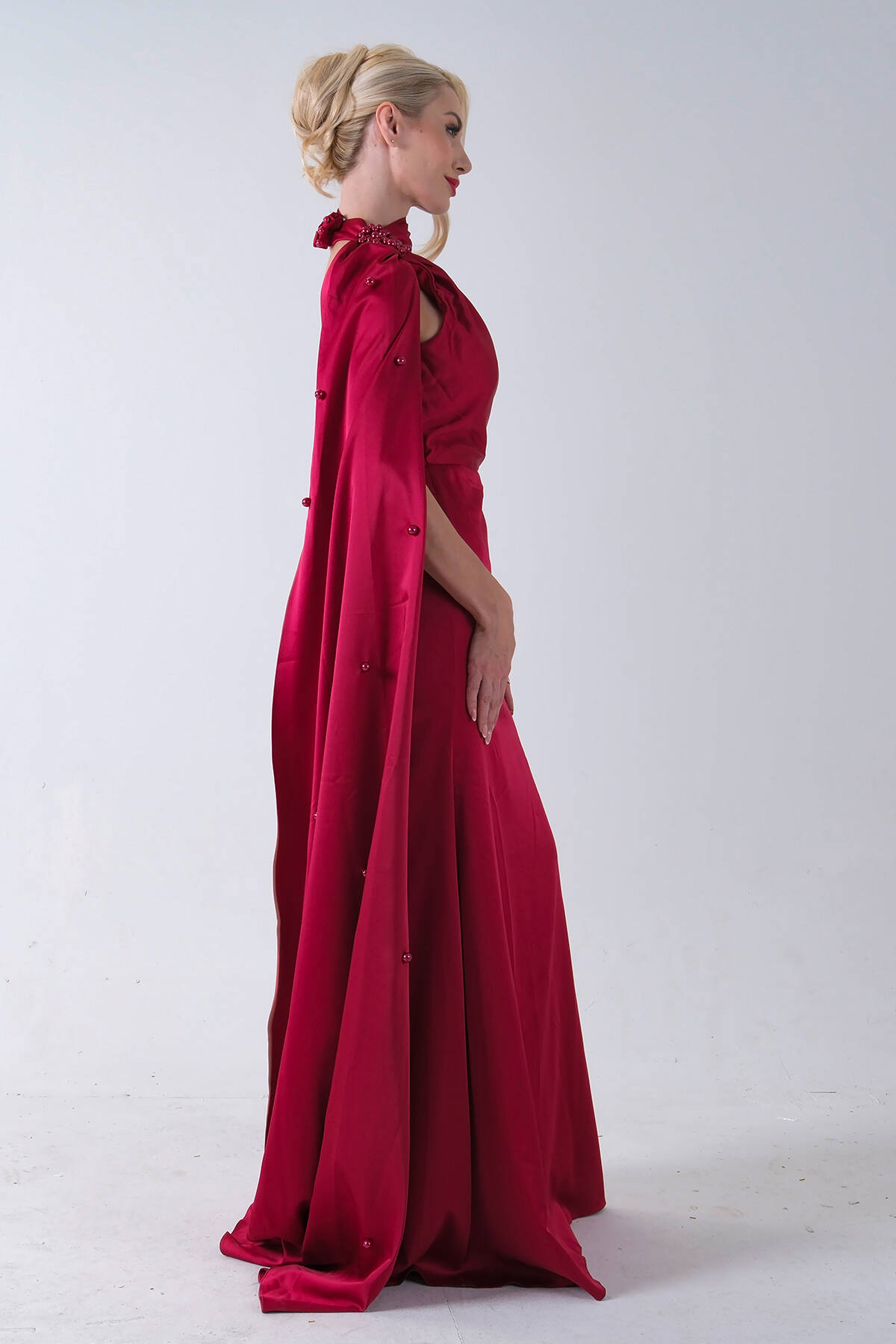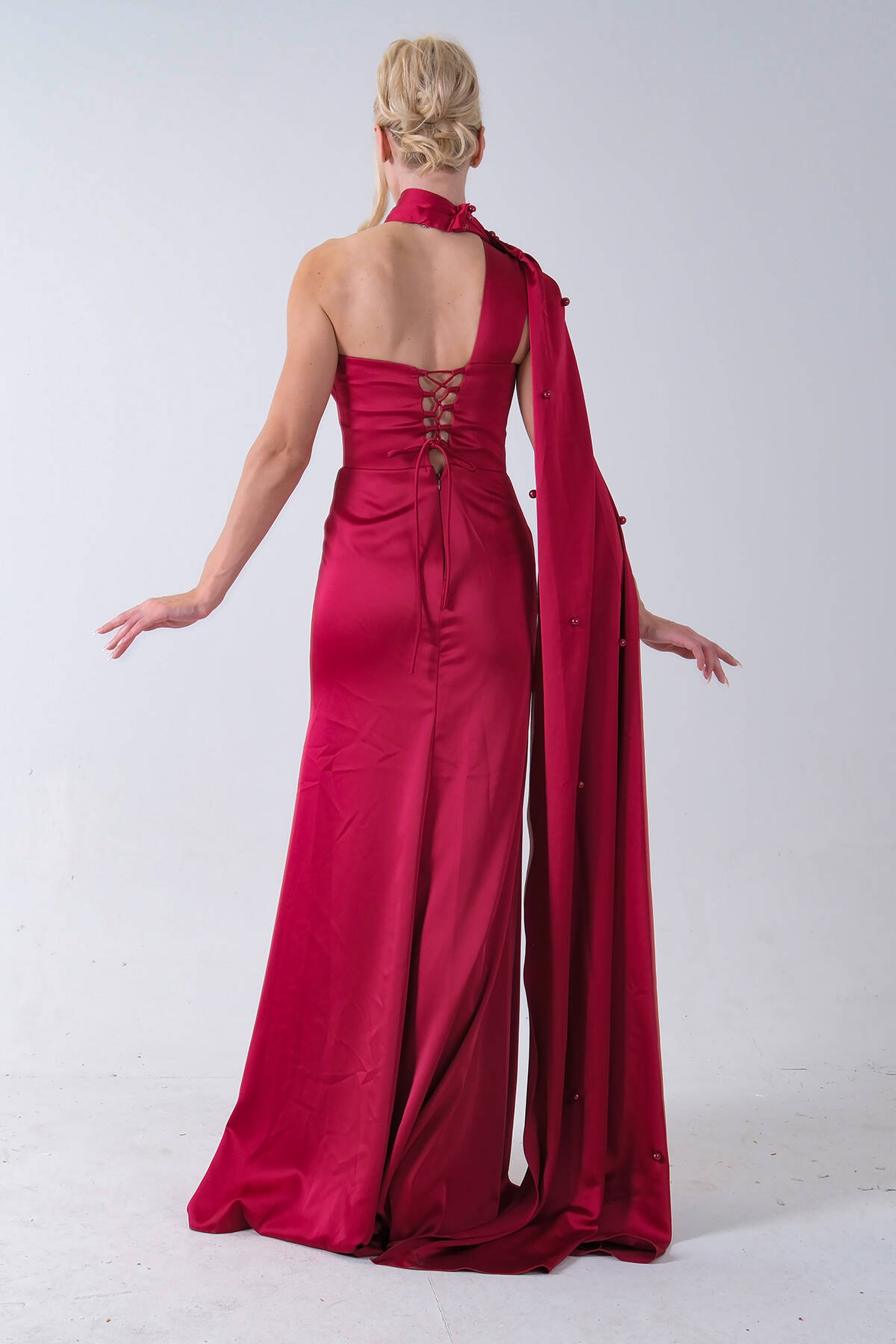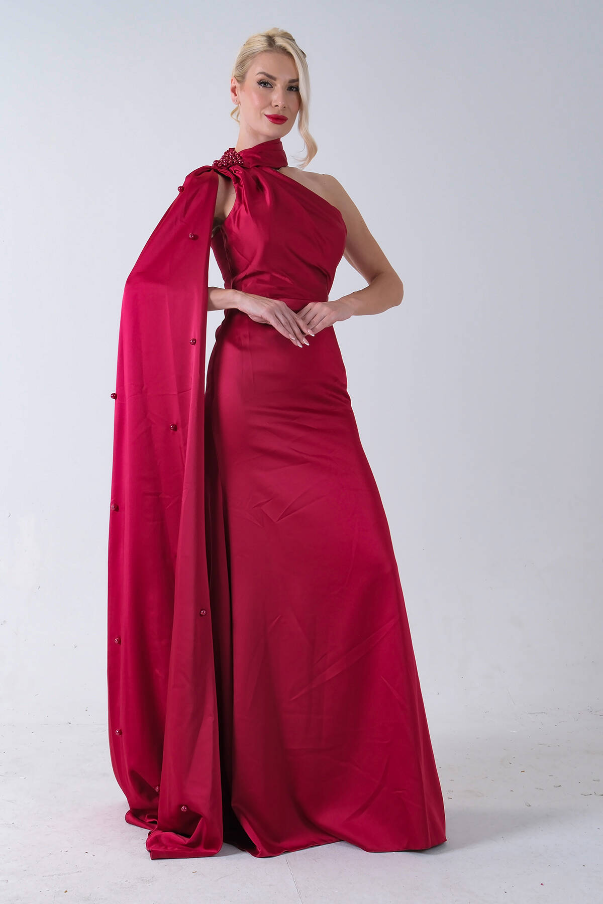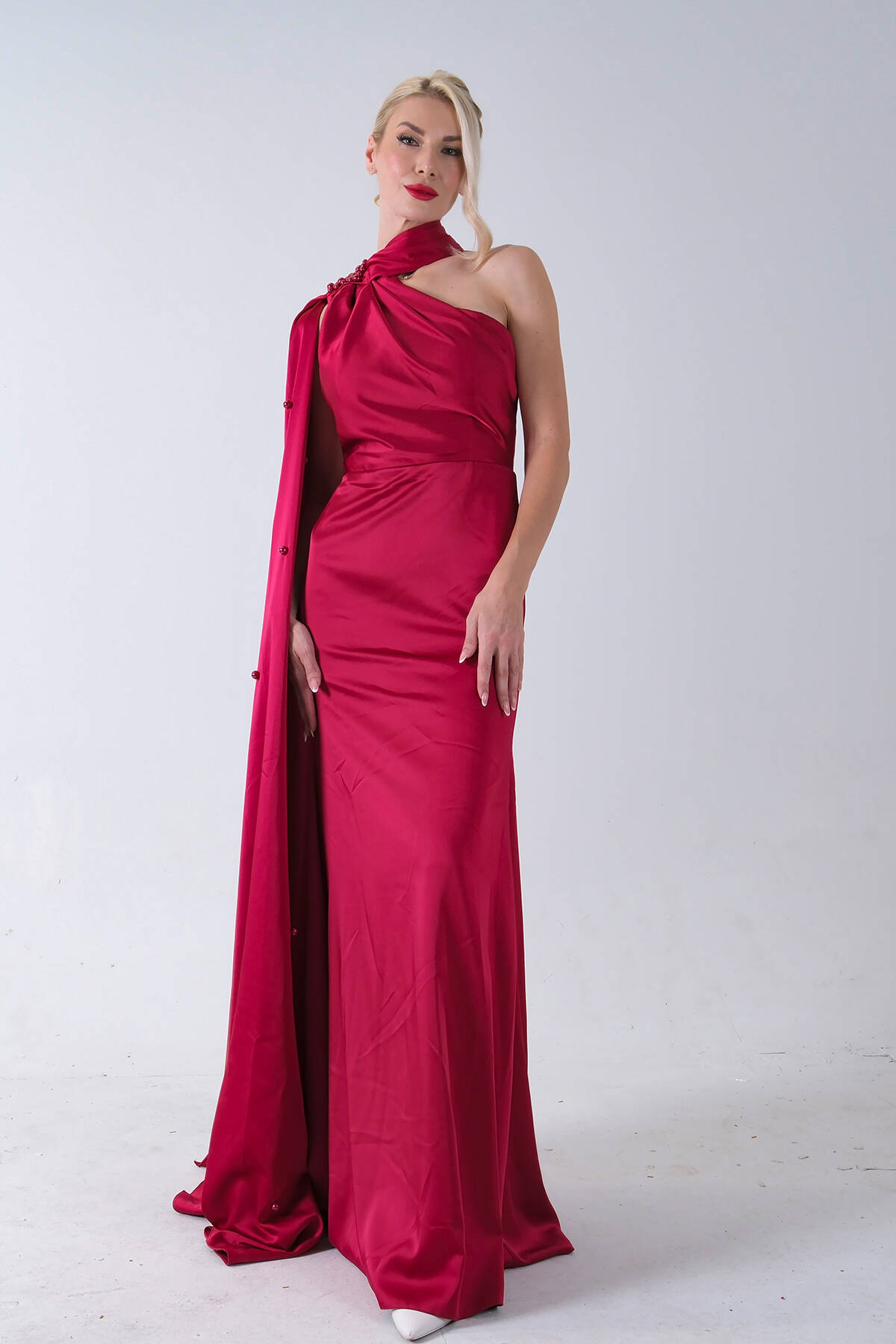 Kırmızı Yaka Kuşak Detaylı Tek Omuz Abiye 0801099.08