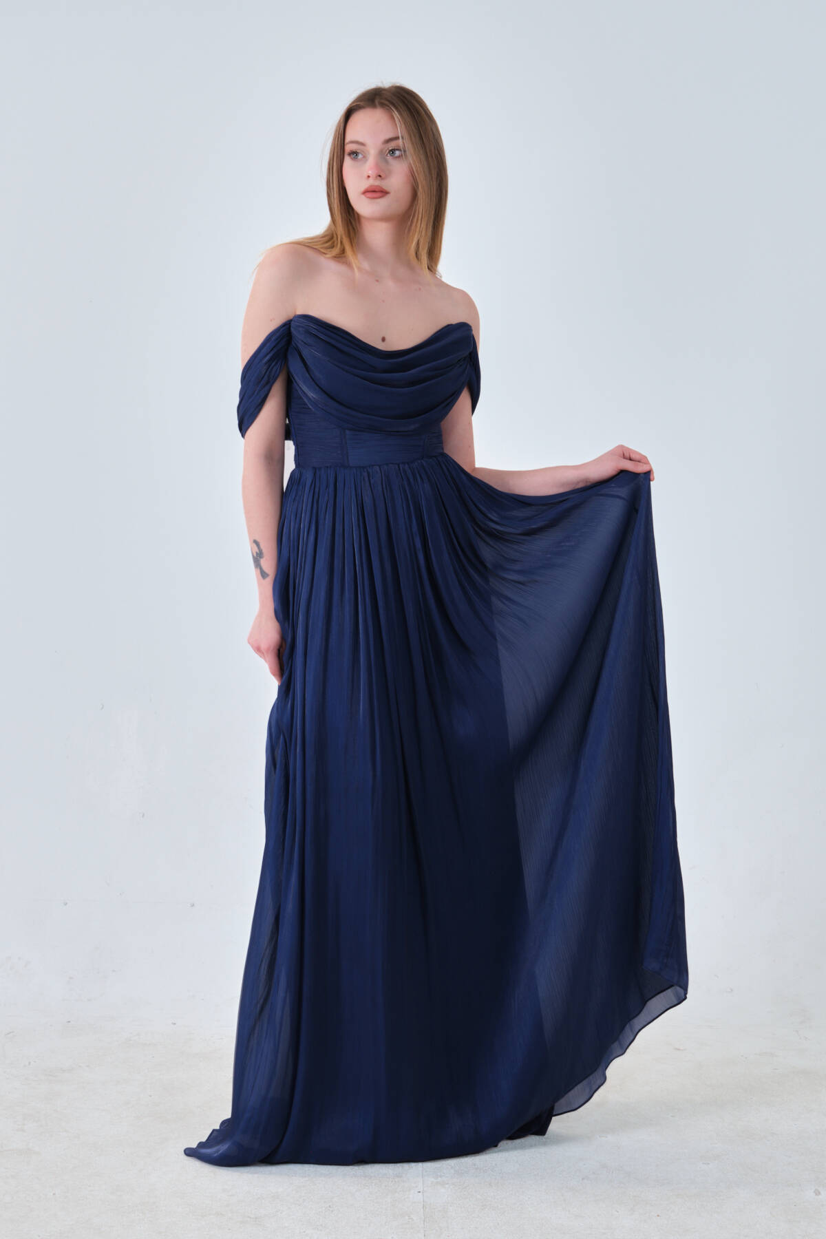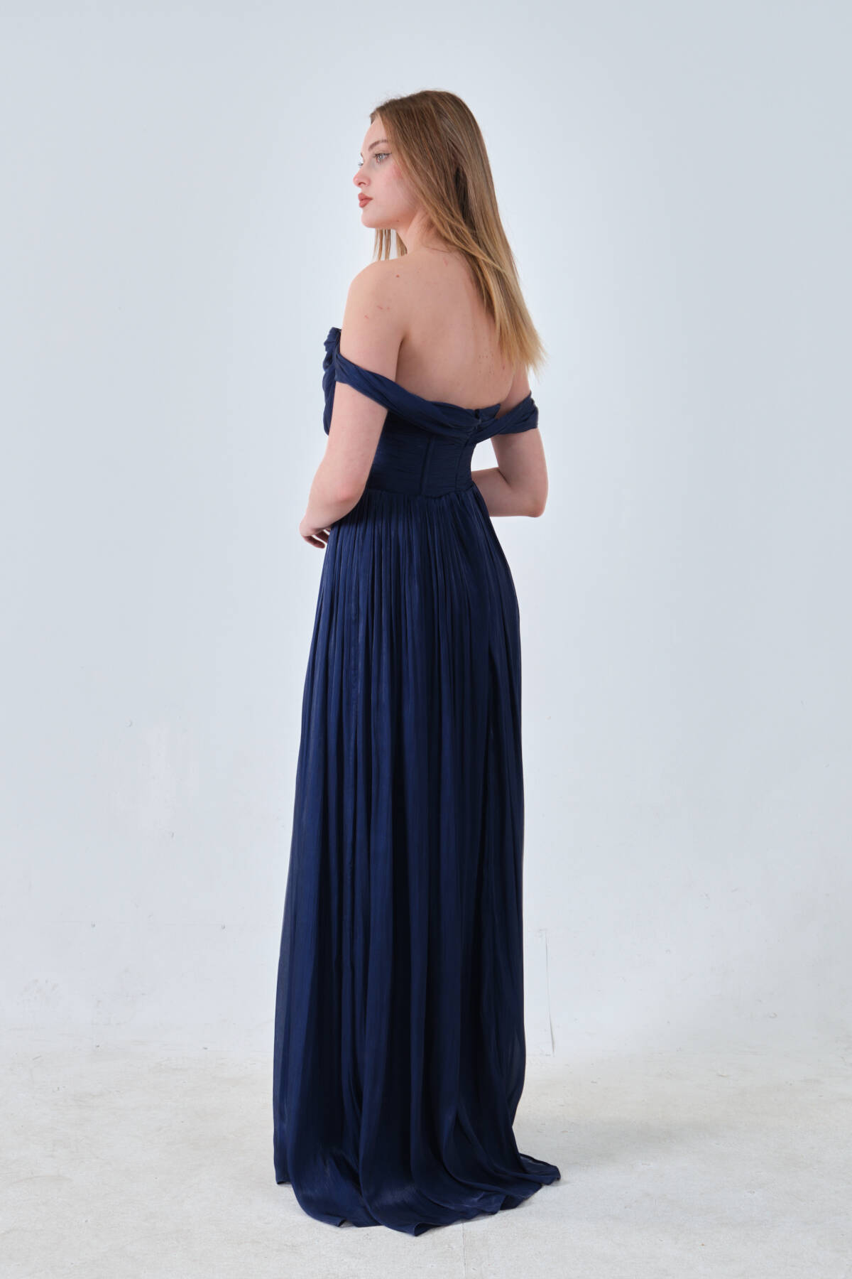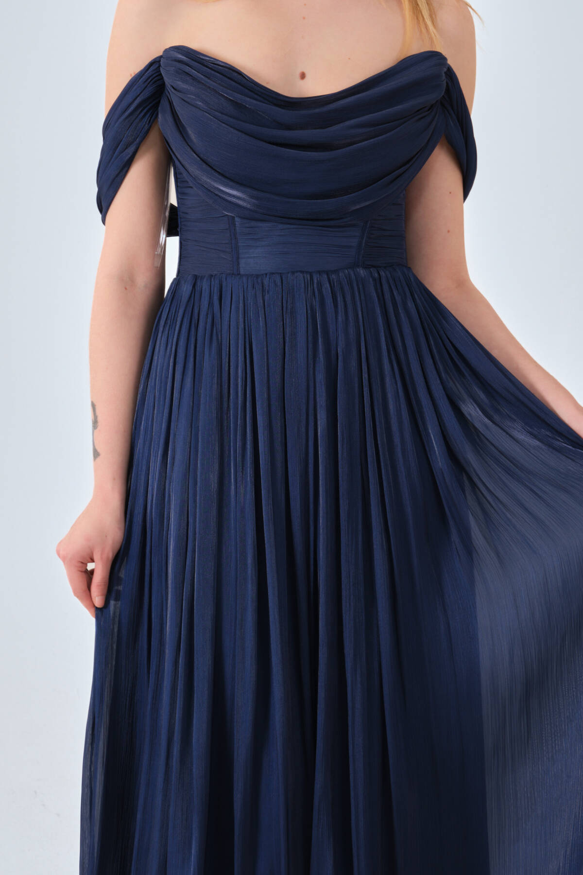 Lacivert Drape Yaka Detaylı Şifon Straplez Abiye 08011861.02