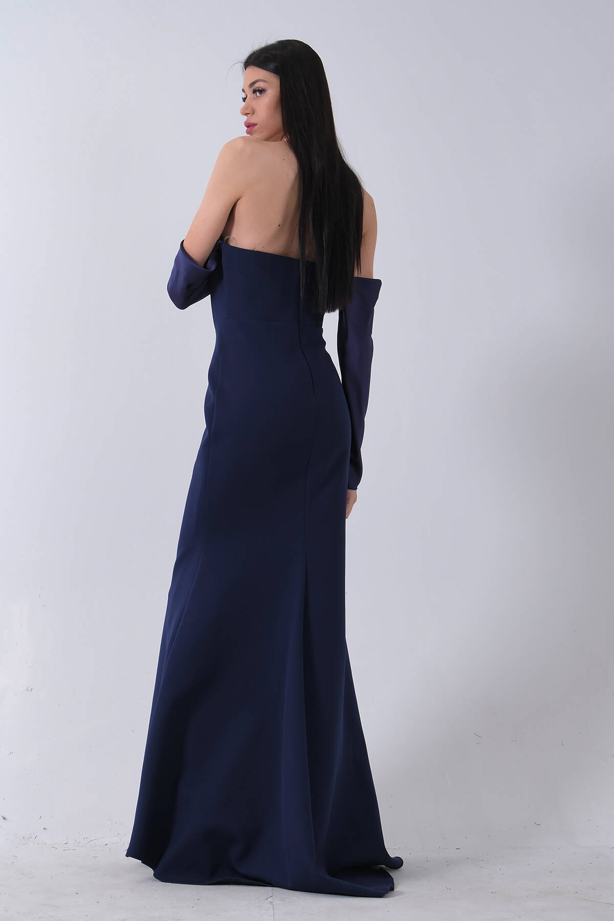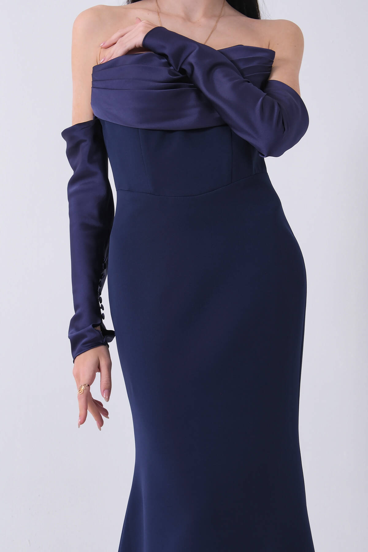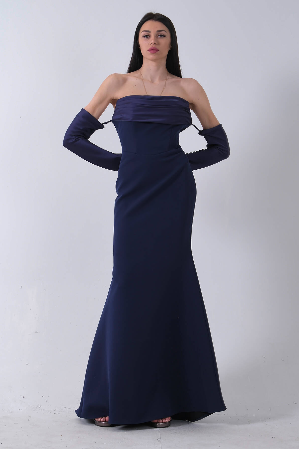 Lacivert Drapeli Düğme Detaylı Uzun Abiye 9705361.02