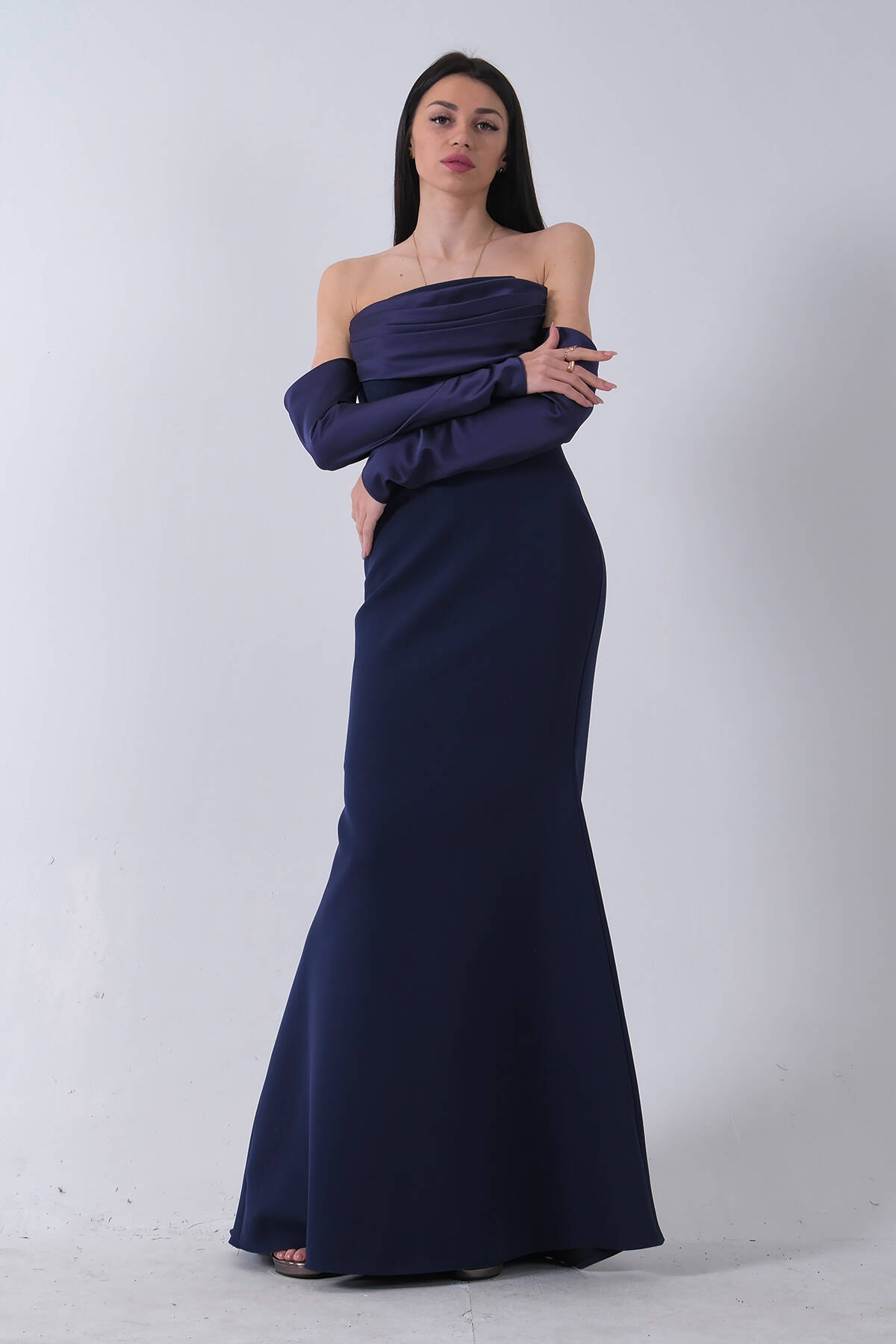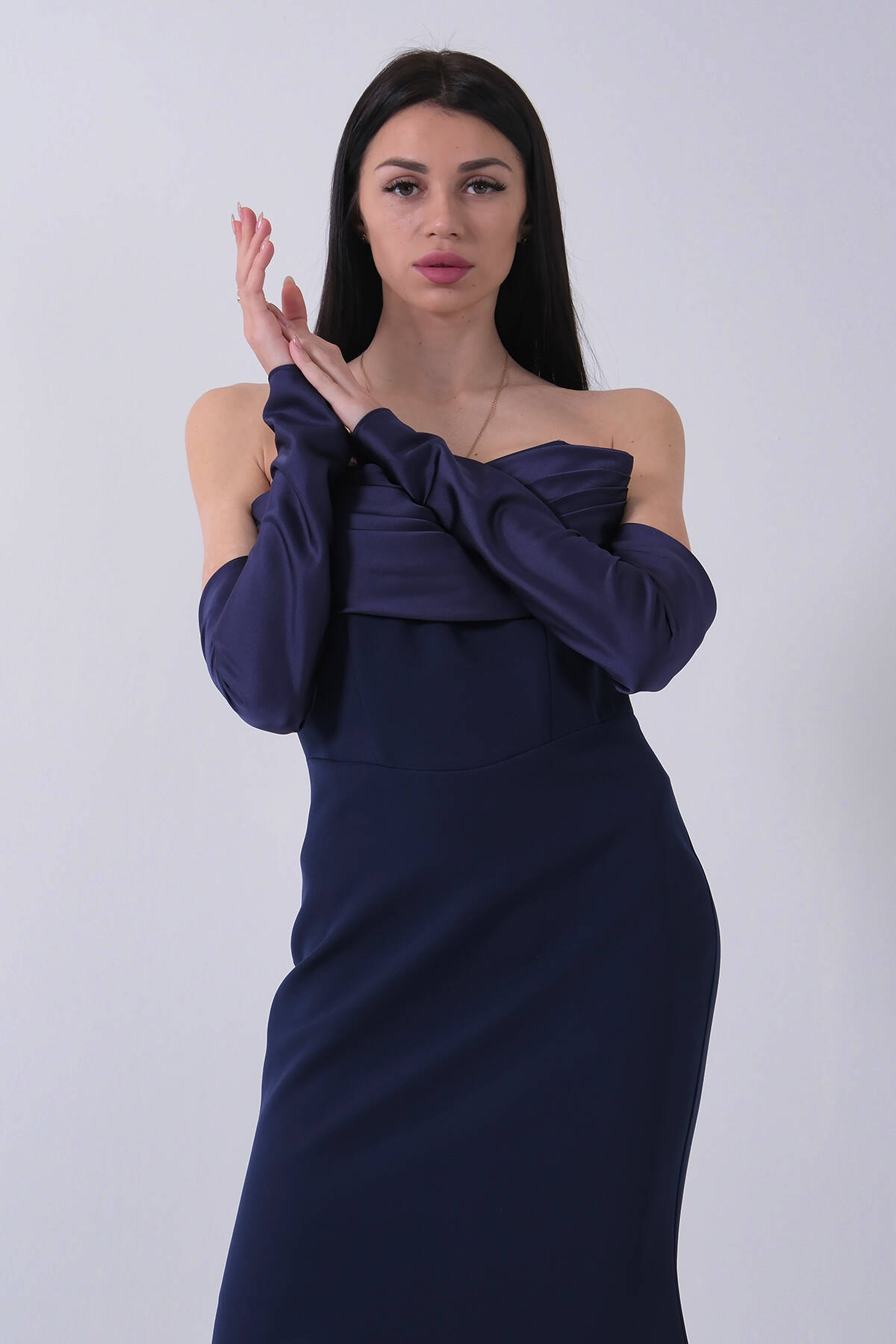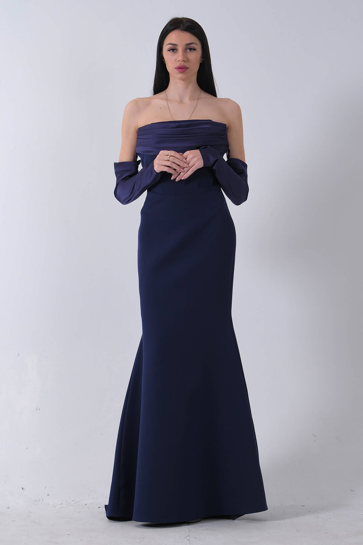Lacivert Drapeli Düğme Detaylı Uzun Abiye 9705361.02