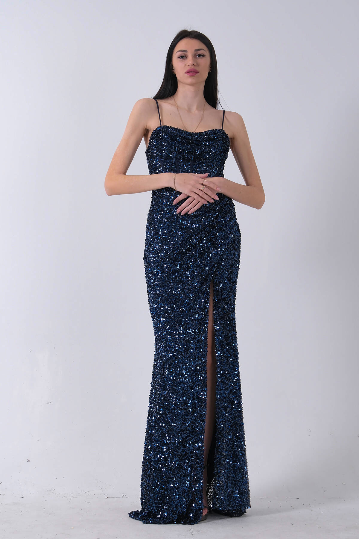 Lacivert Drapeli Parlak Pul Payetli Askılı Abiye 9705539.02