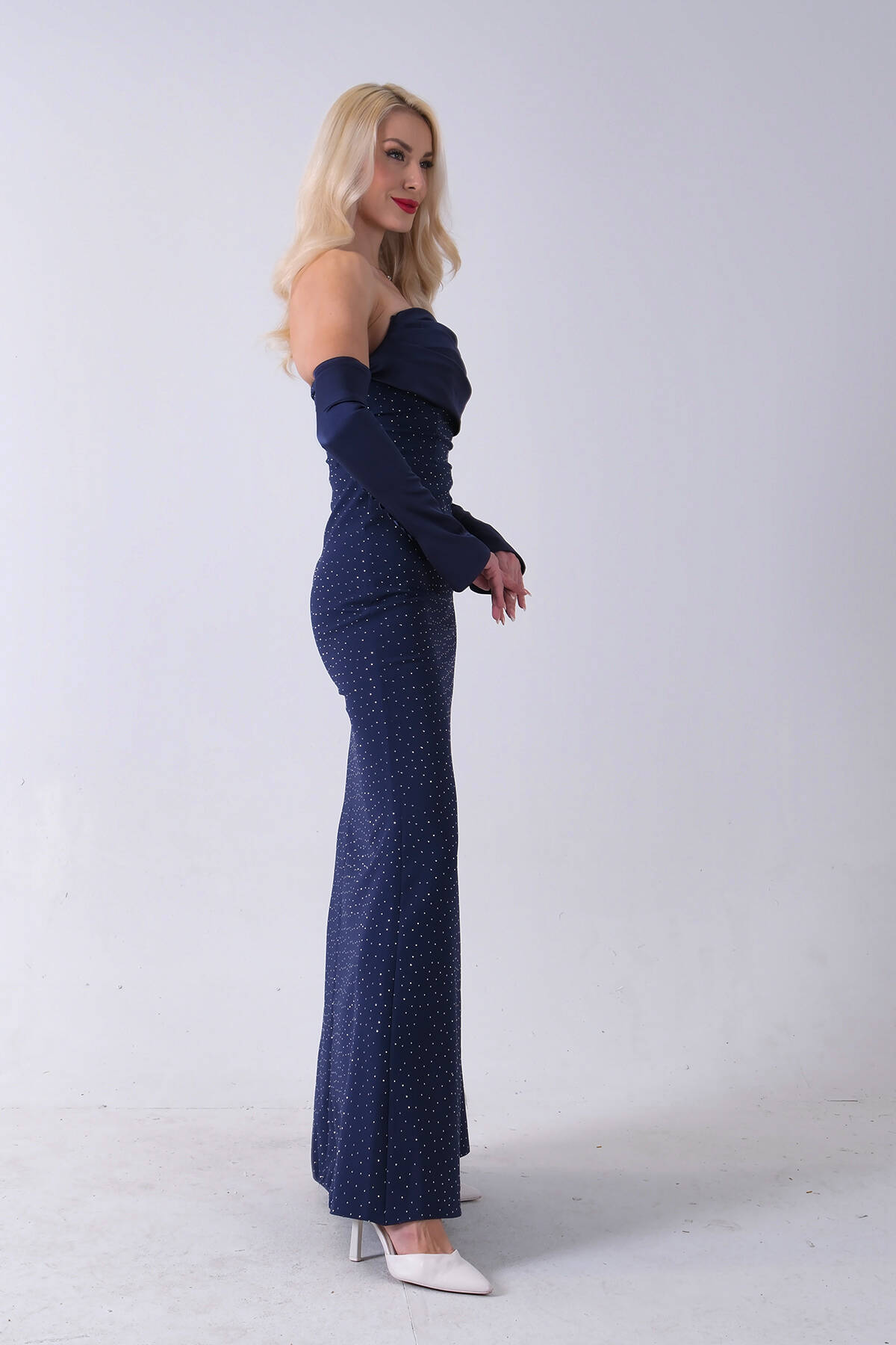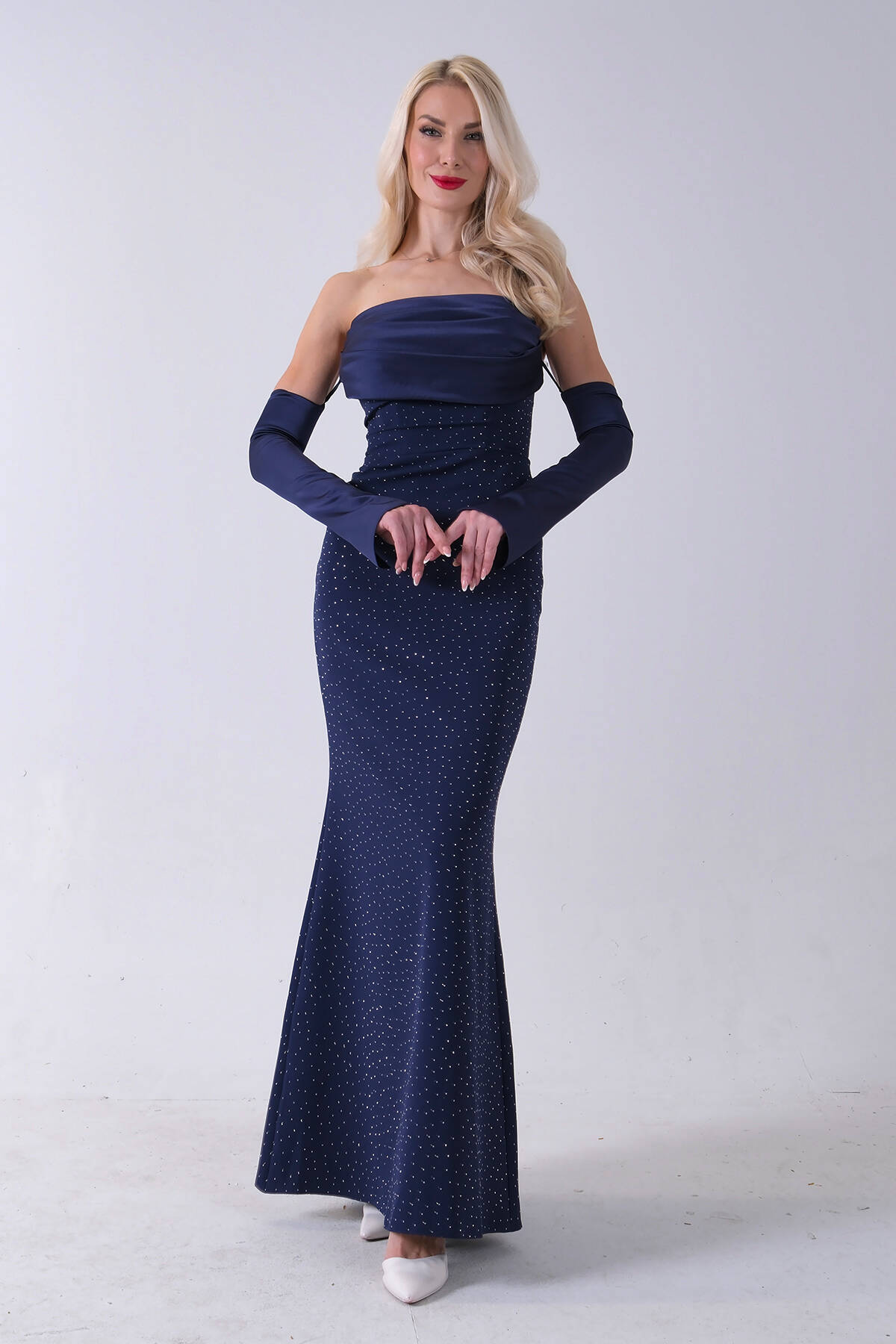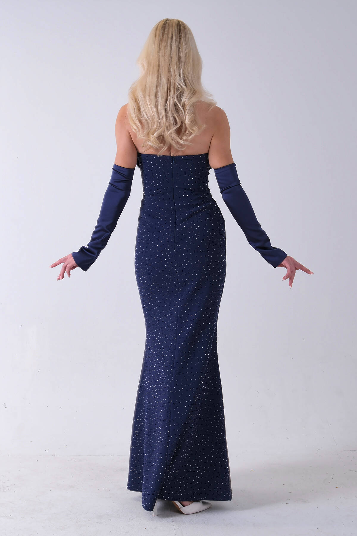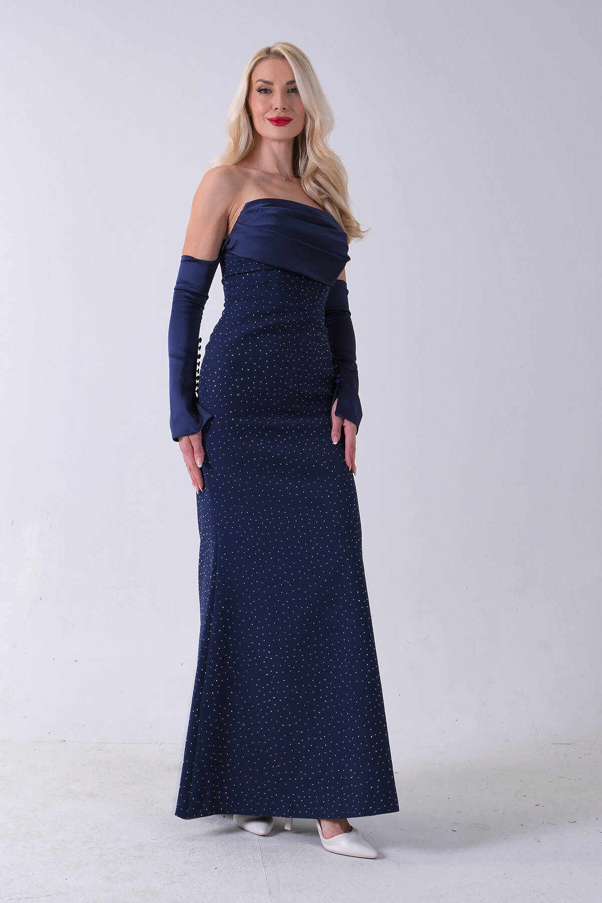 Lacivert Drapeli Üzeri Işıltı Nokta Detaylı Kollu Abiye 0802502.02