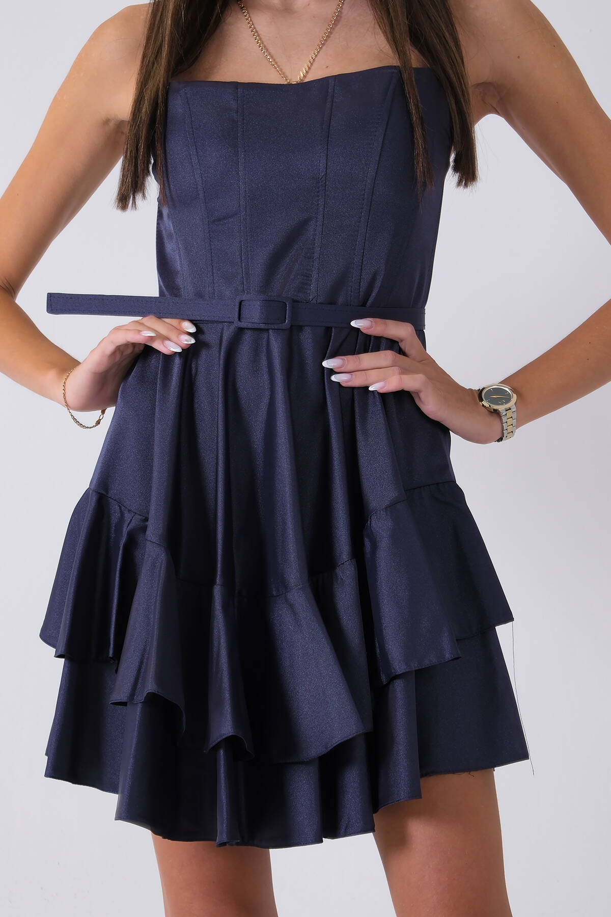 Lacivert İp Askılı Bel Kemer Bağlamalı Mini Boy Abiye 0802004.02