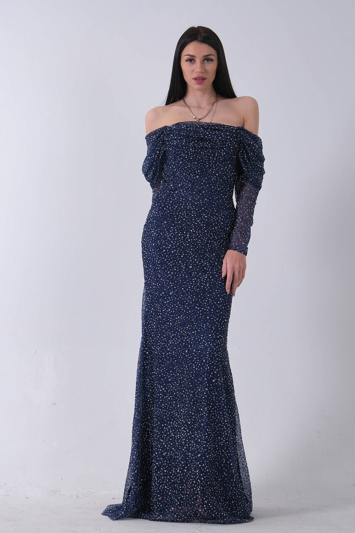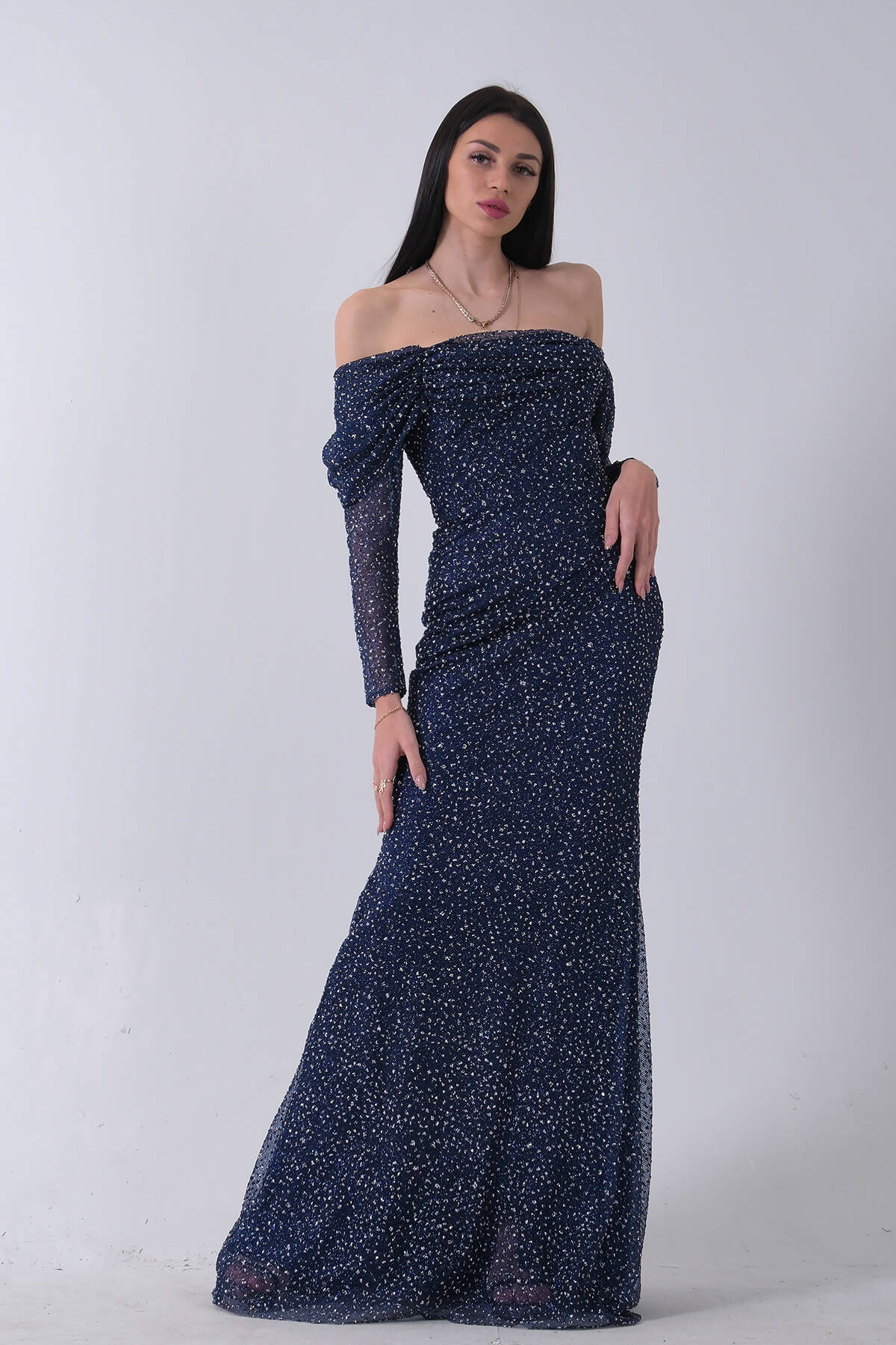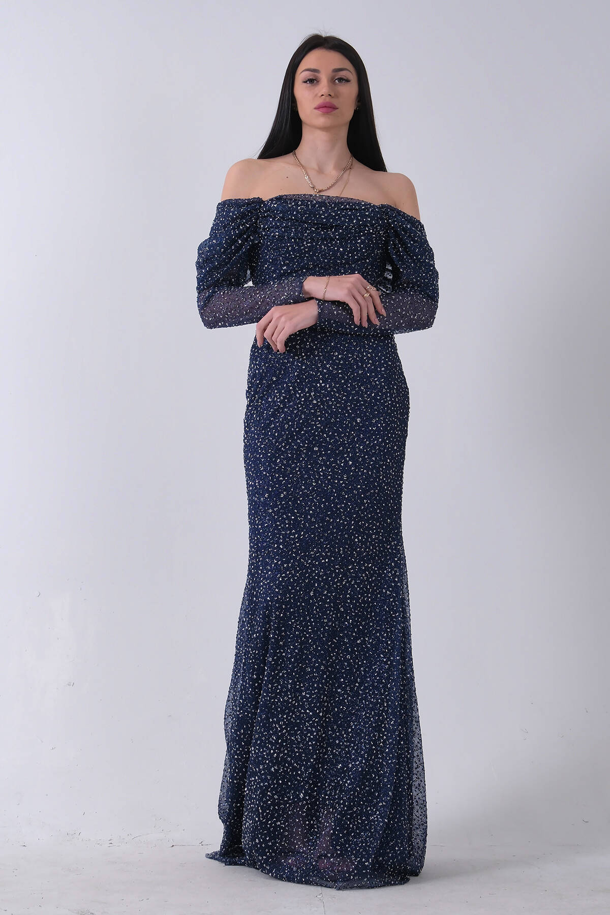 Lacivert Kayık Yaka Simli Uzun Kol Abiye 9705266.02