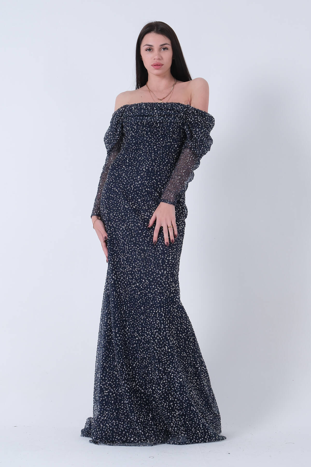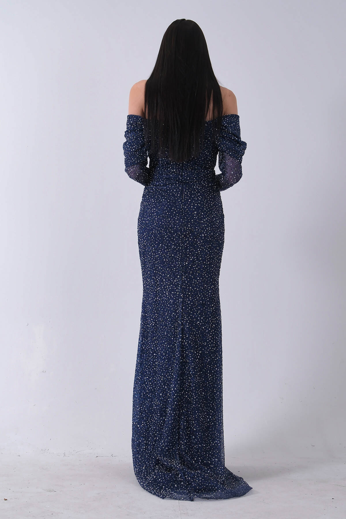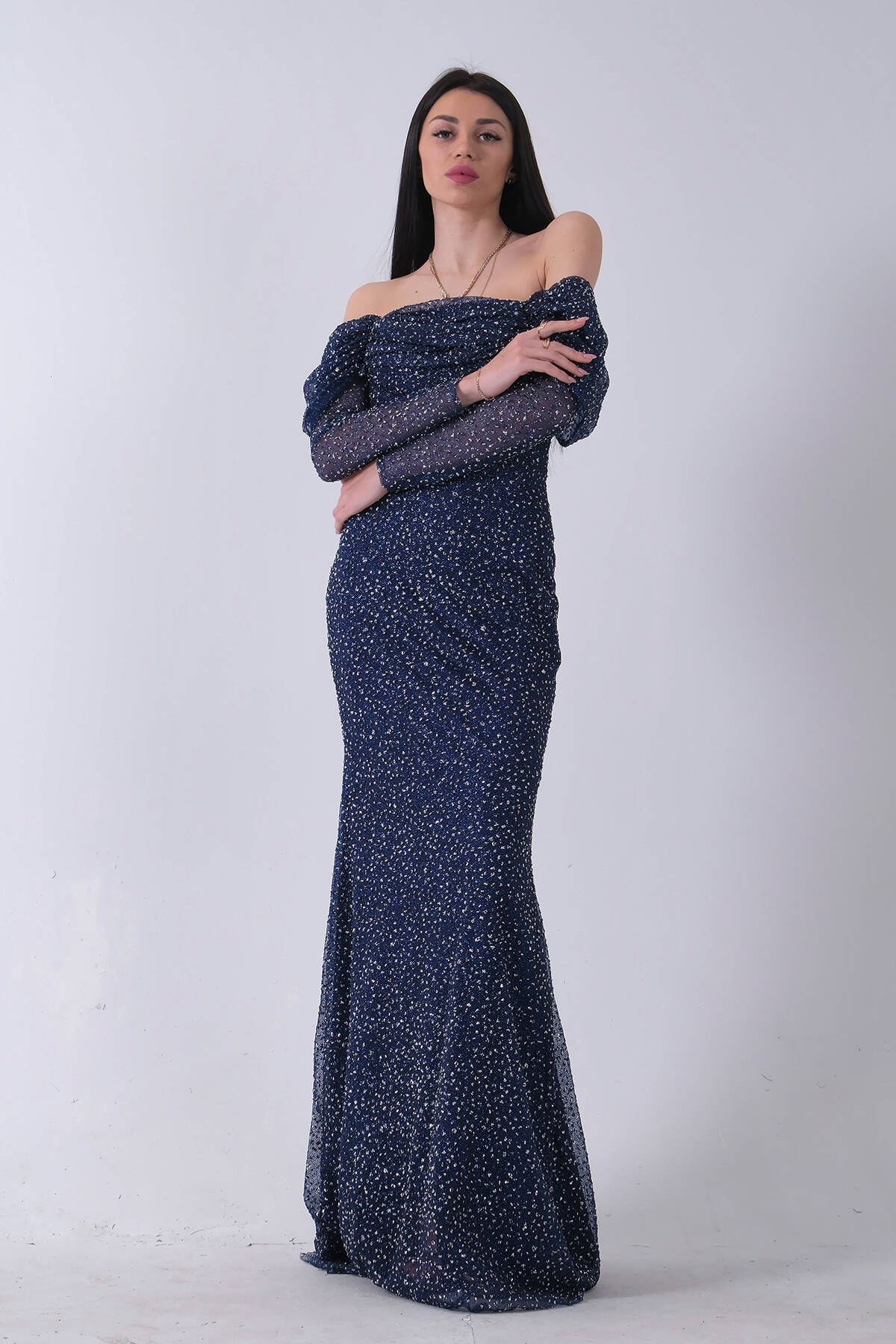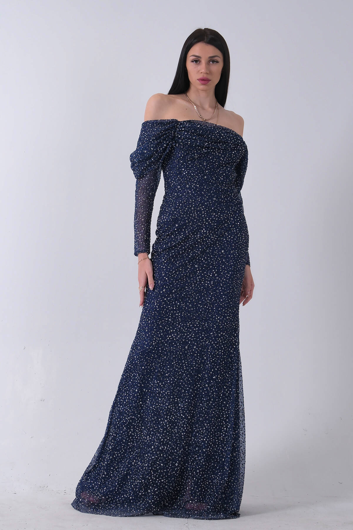 Lacivert Kayık Yaka Simli Uzun Kol Abiye 9705266.02