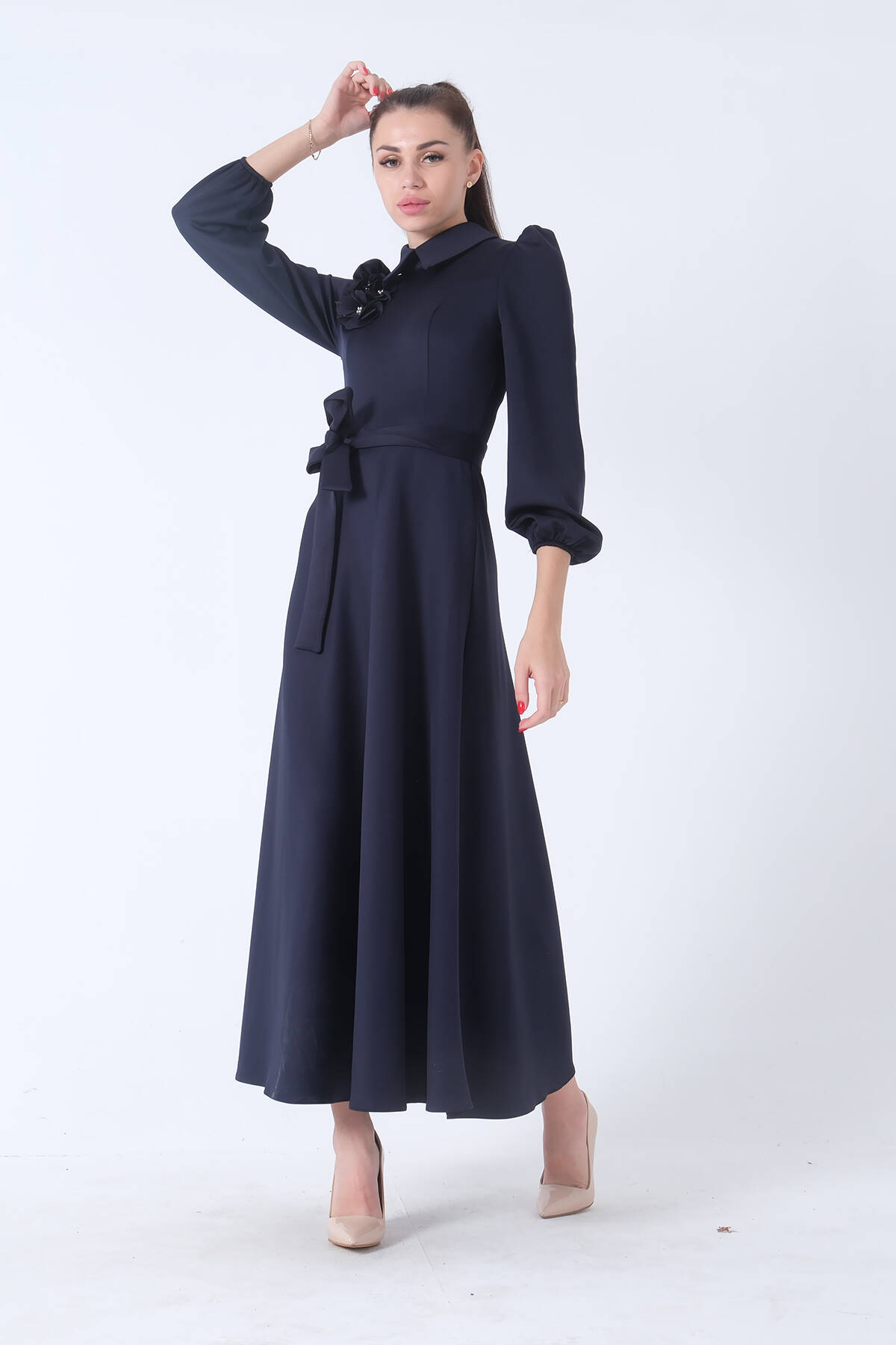 Lacivert Kemer Bağlamalı Kloş Elbise 4593260.02