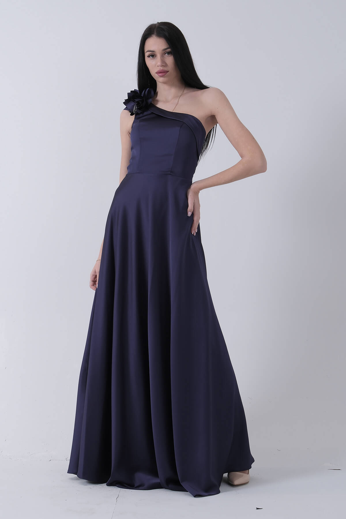 Lacivert Omuz Çiçek ve Taşlı Tek Omuz Abiye 0801010.02