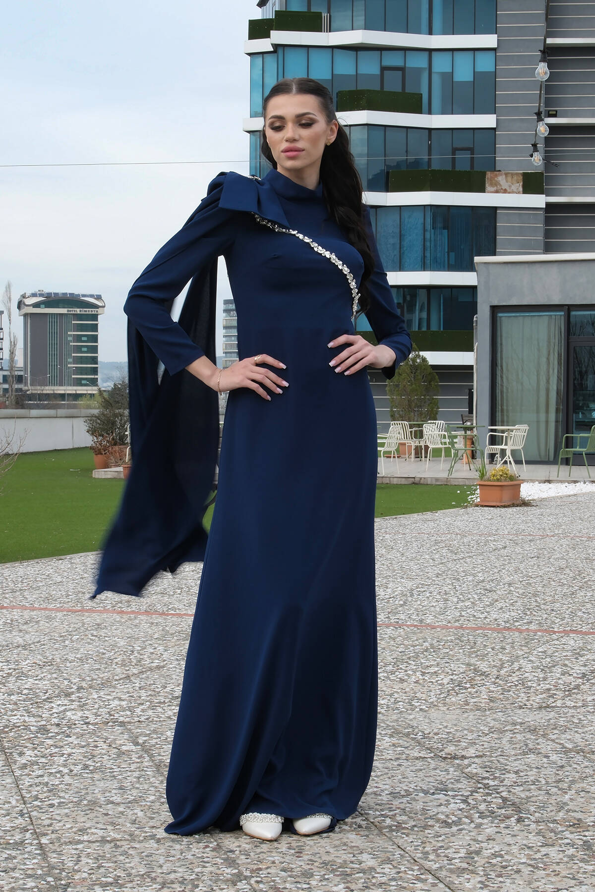 Lacivert Omuz Taş Detaylı Kuşaklı Bisiklet Yaka Tesettür Abiye 0801026.02