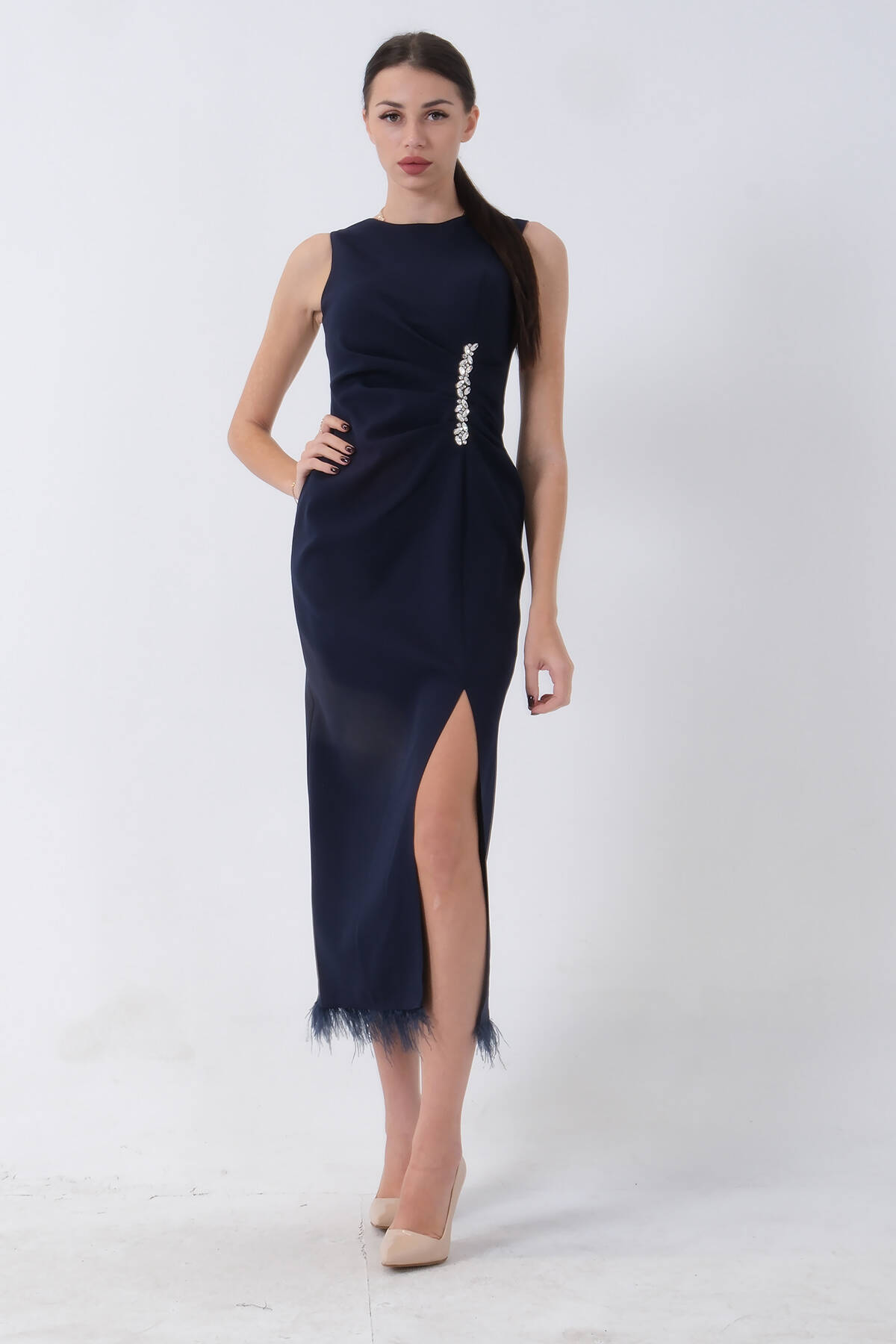 Lacivert Önü Taş Detaylı Yırtmaçlı Tüy Detaylı Abiye 9705402.02