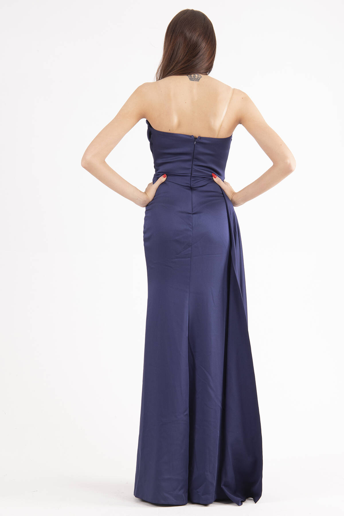 Lacivert Straplez Drape Detaylı Yırtmaçlı Saten Kumaş Abiye Elbise 1607209.02