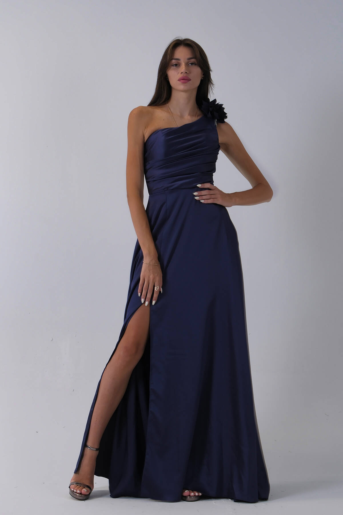 Lacivert Tek Omuz Çiçek Detaylı Saten Yırtmaçlı Abiye 0801041.02
