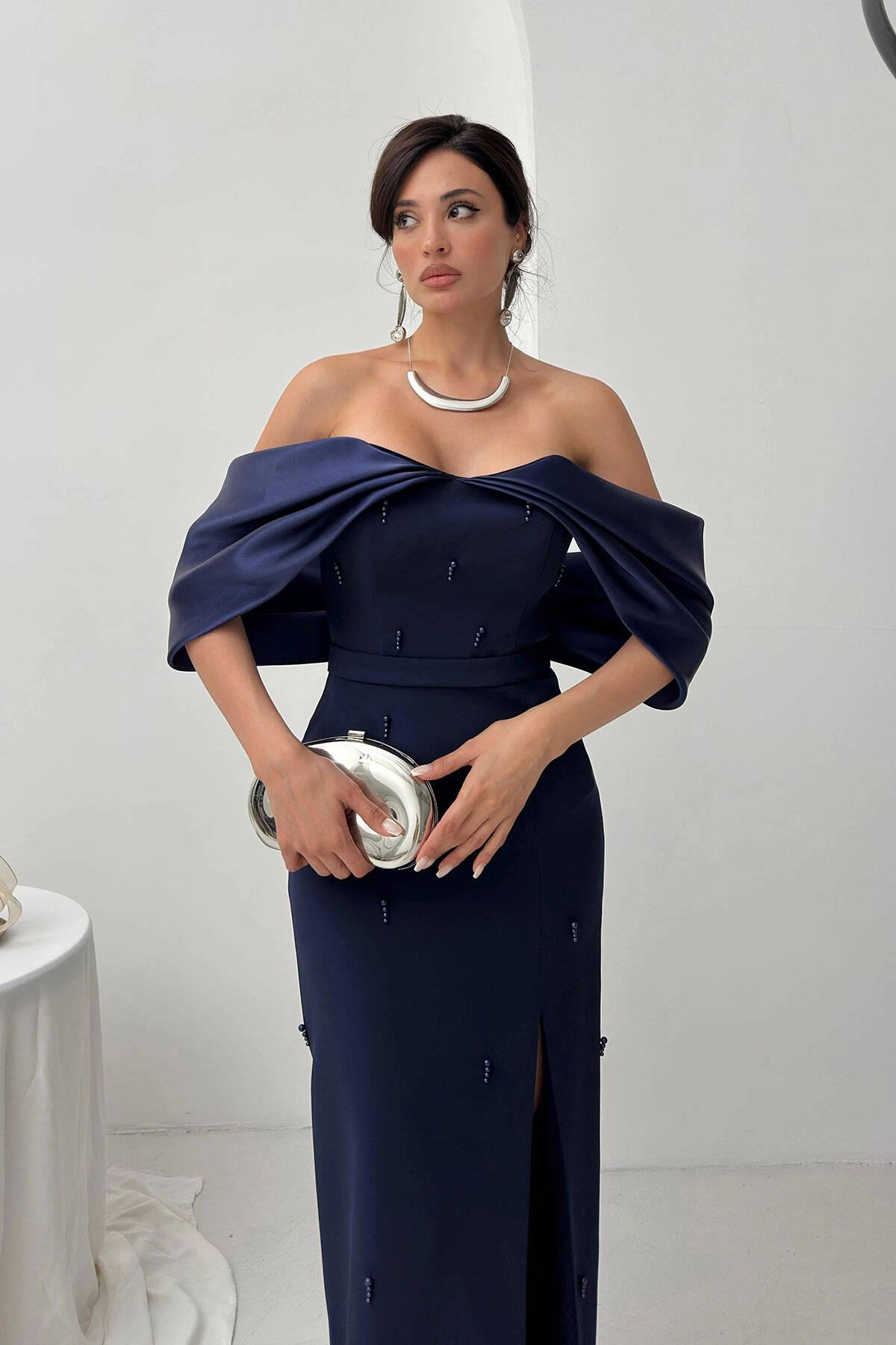 Lacivert Üzeri Taş İşlemeli Yırtmaç Detaylı Düşük Omuz Abiye 0801091.02