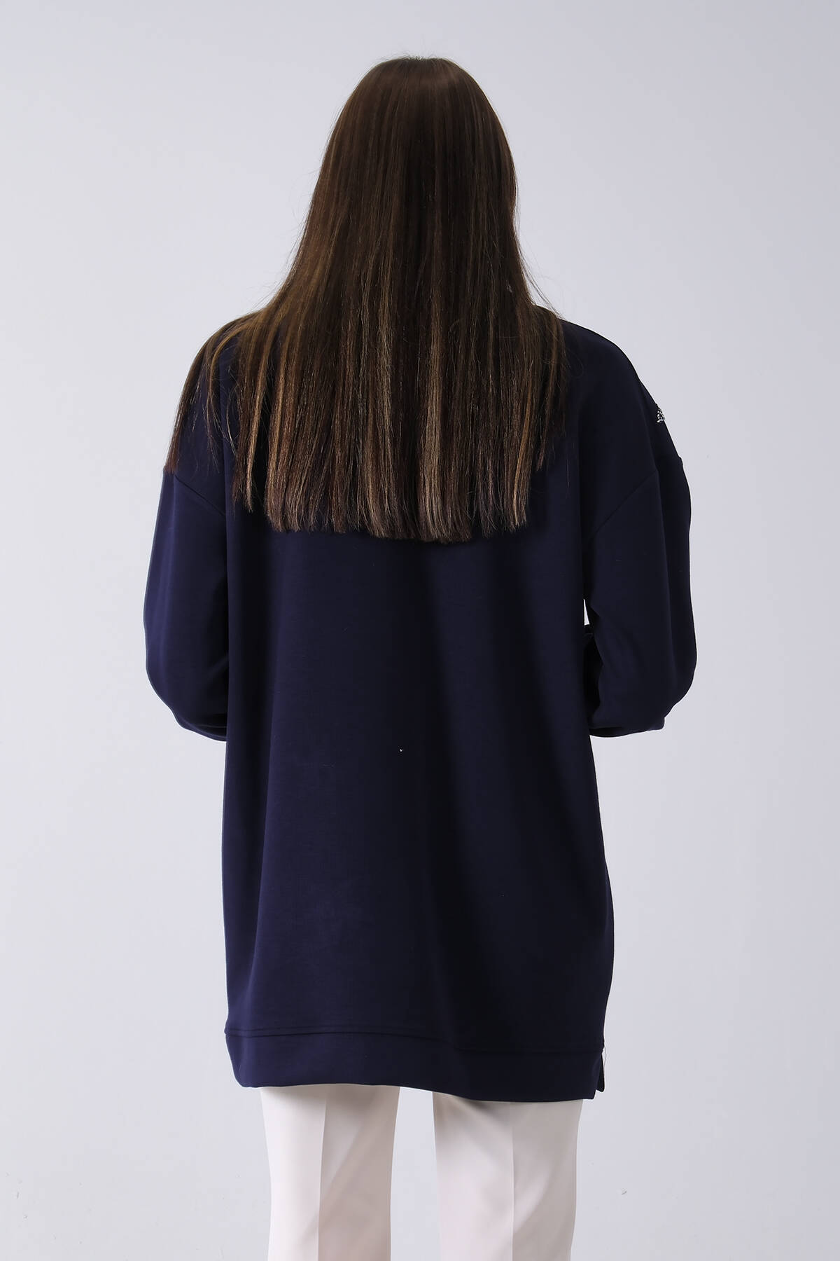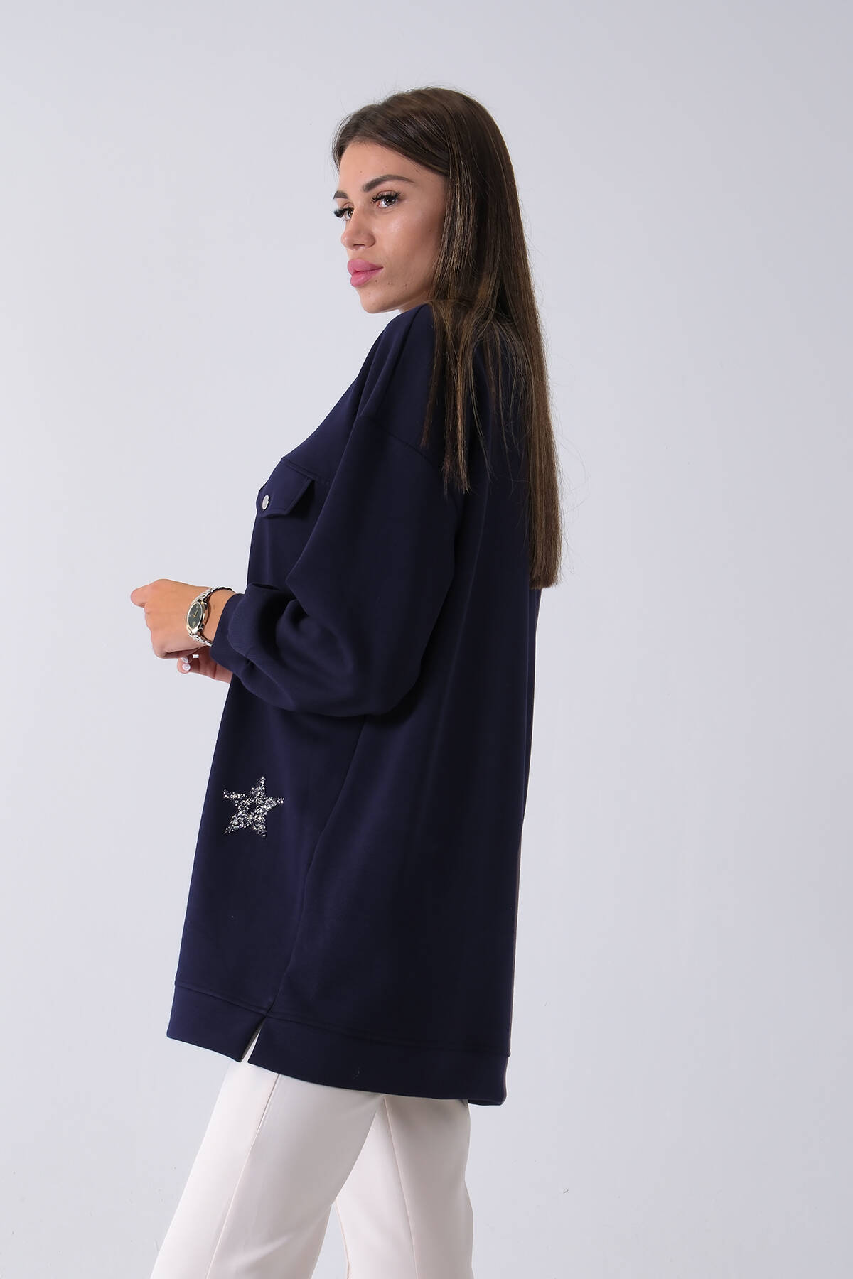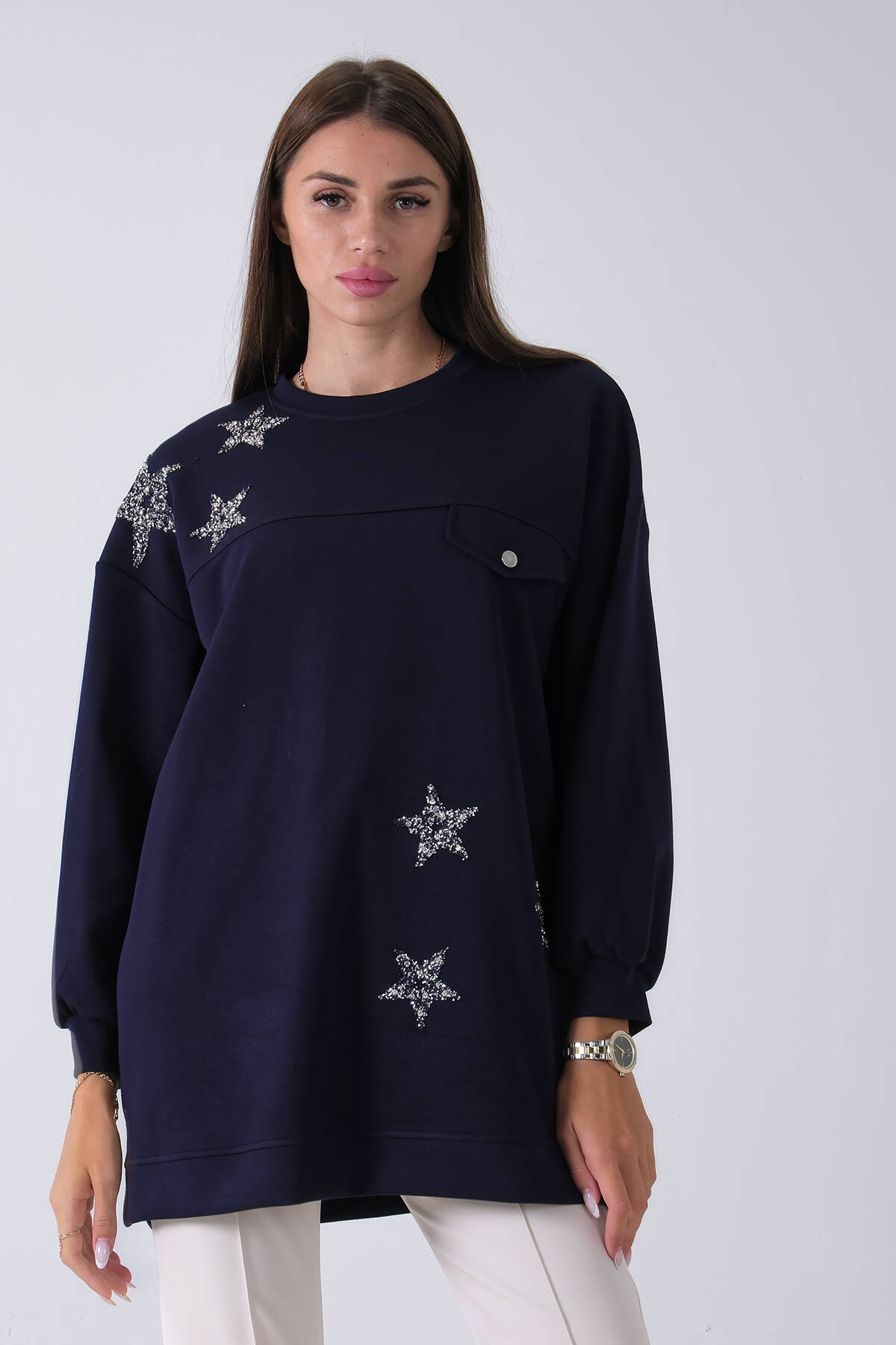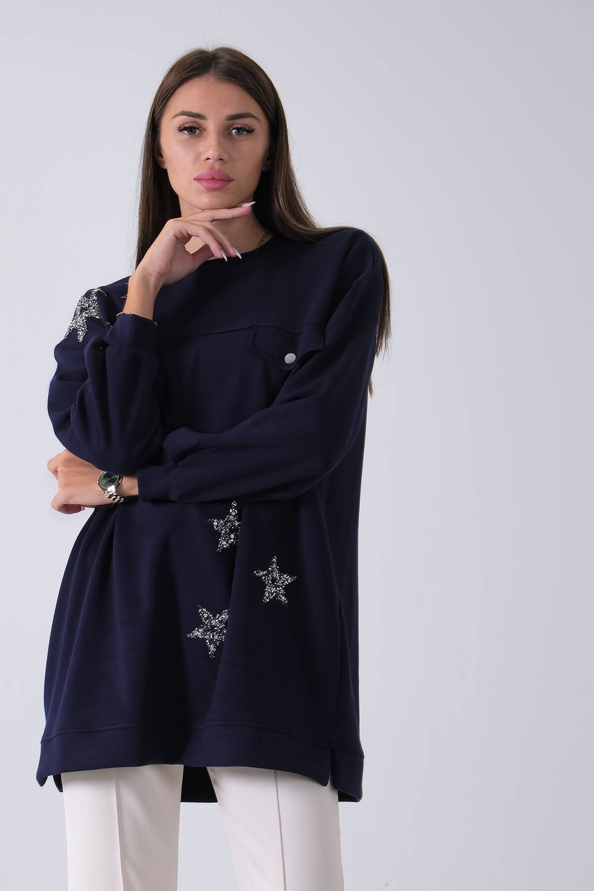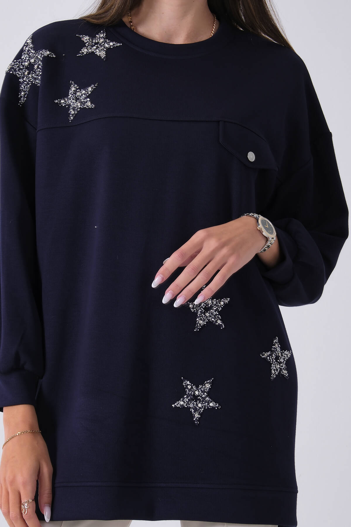 Lacivert Üzeri Yıldız Desenli Taş İşlemeli Cep Görünümülü Tunik 940170258.02