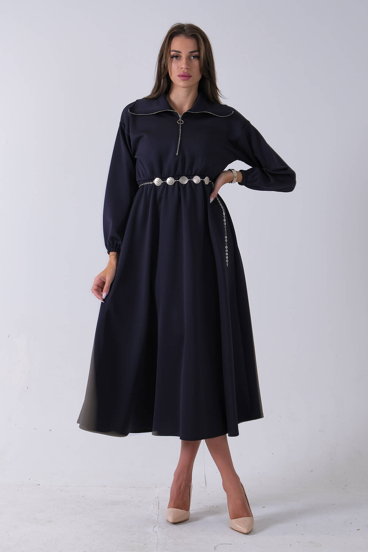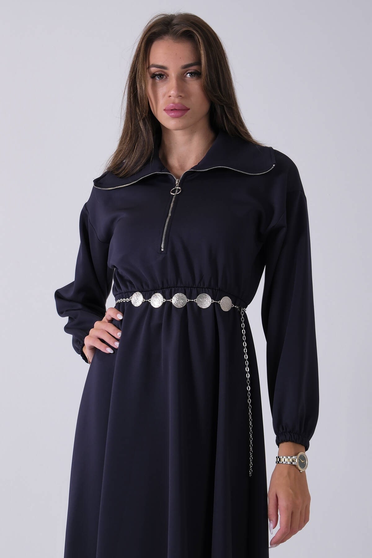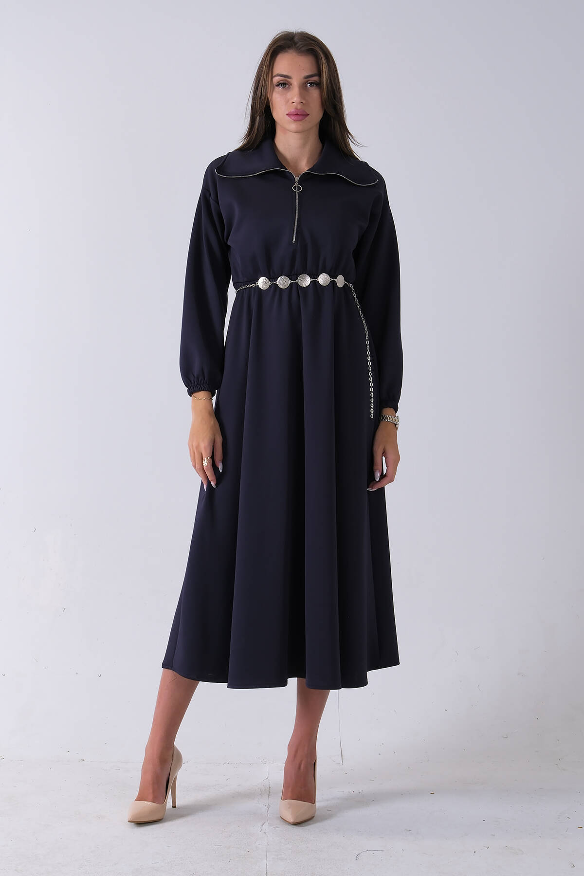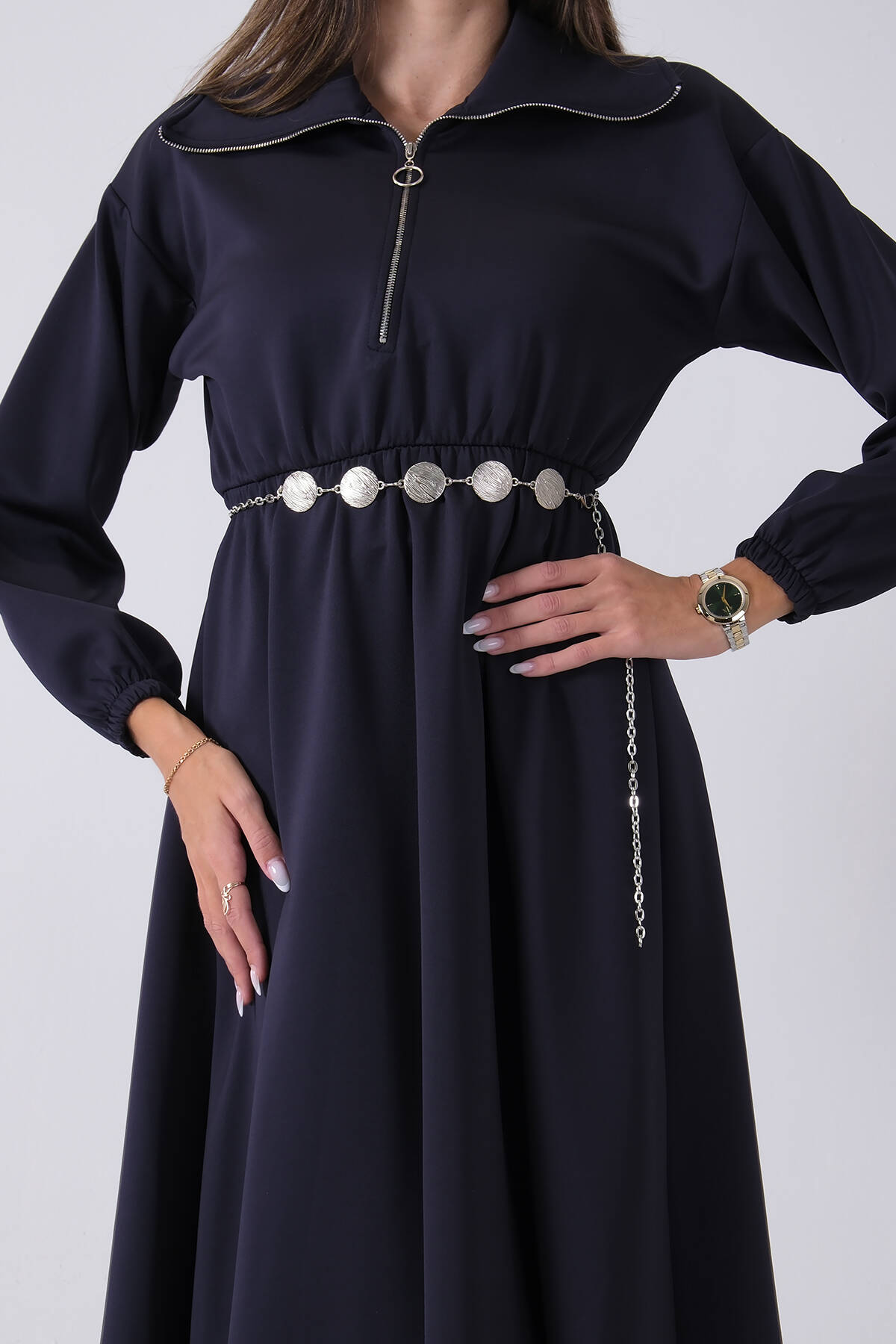 Lacivert Yaka Fermuar Detaylı Bel ve Bileği Lastikli Kemerli Scuba Elbise 4593455.02