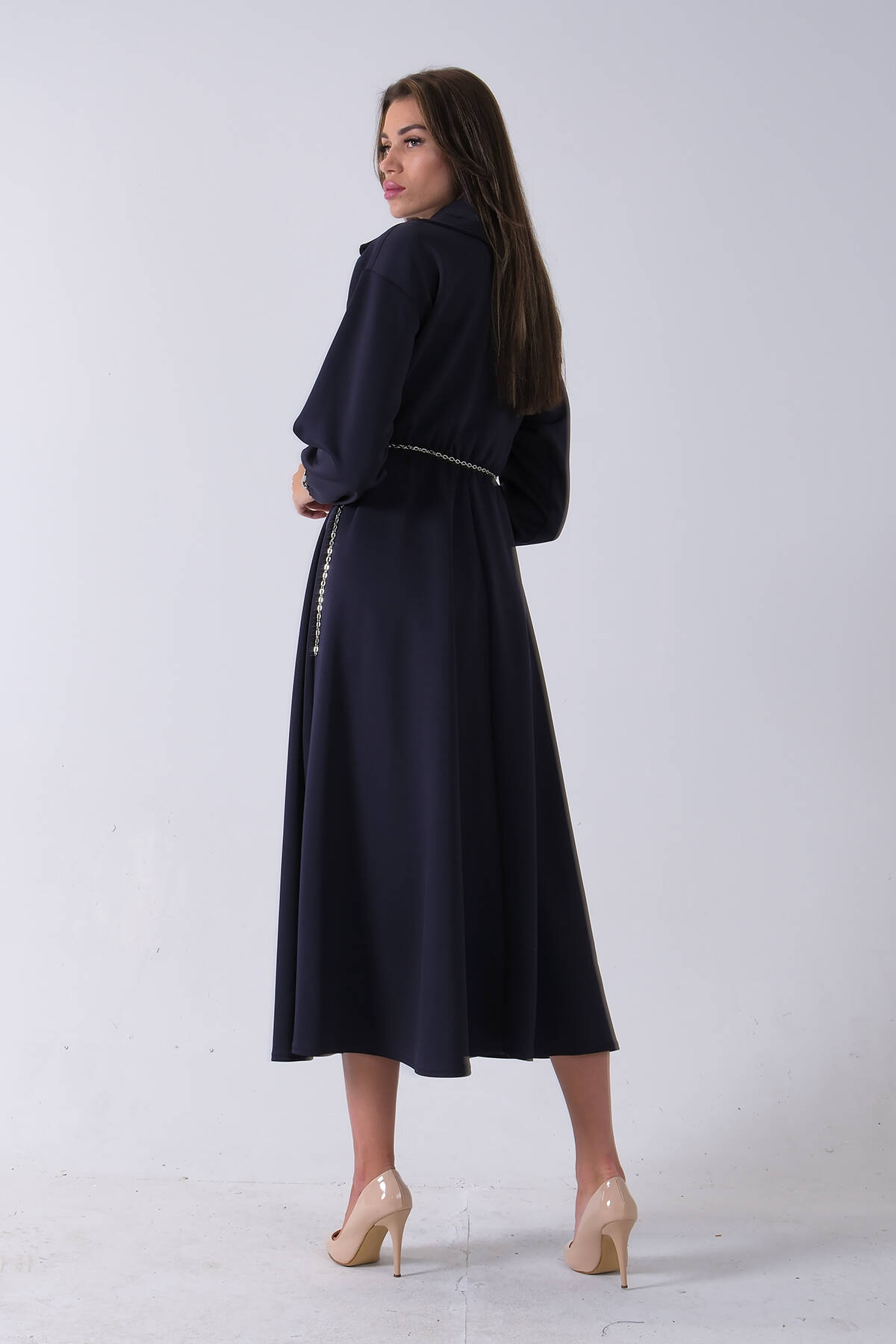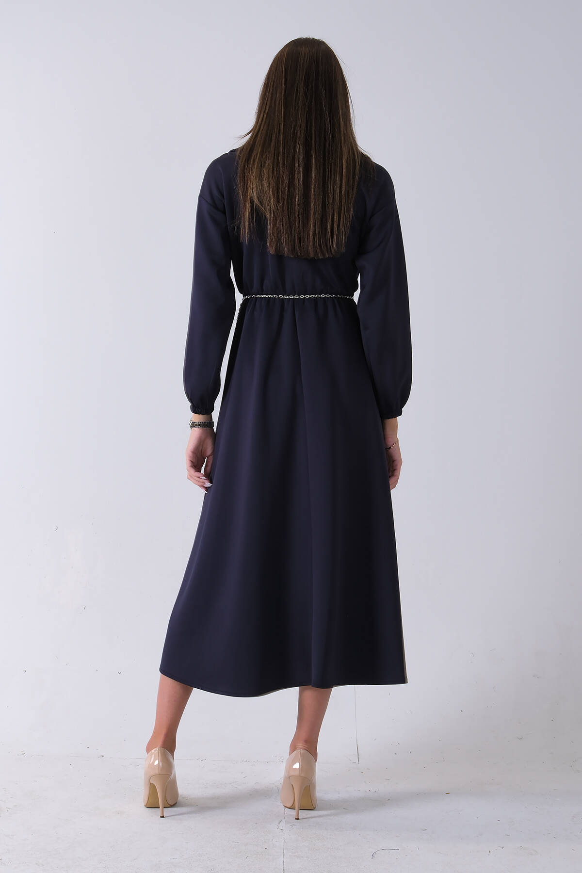 Lacivert Belden Bağlamalı Bisiklet Yakalı Bileği Lastikli Tesettür Elbise 4571579.02