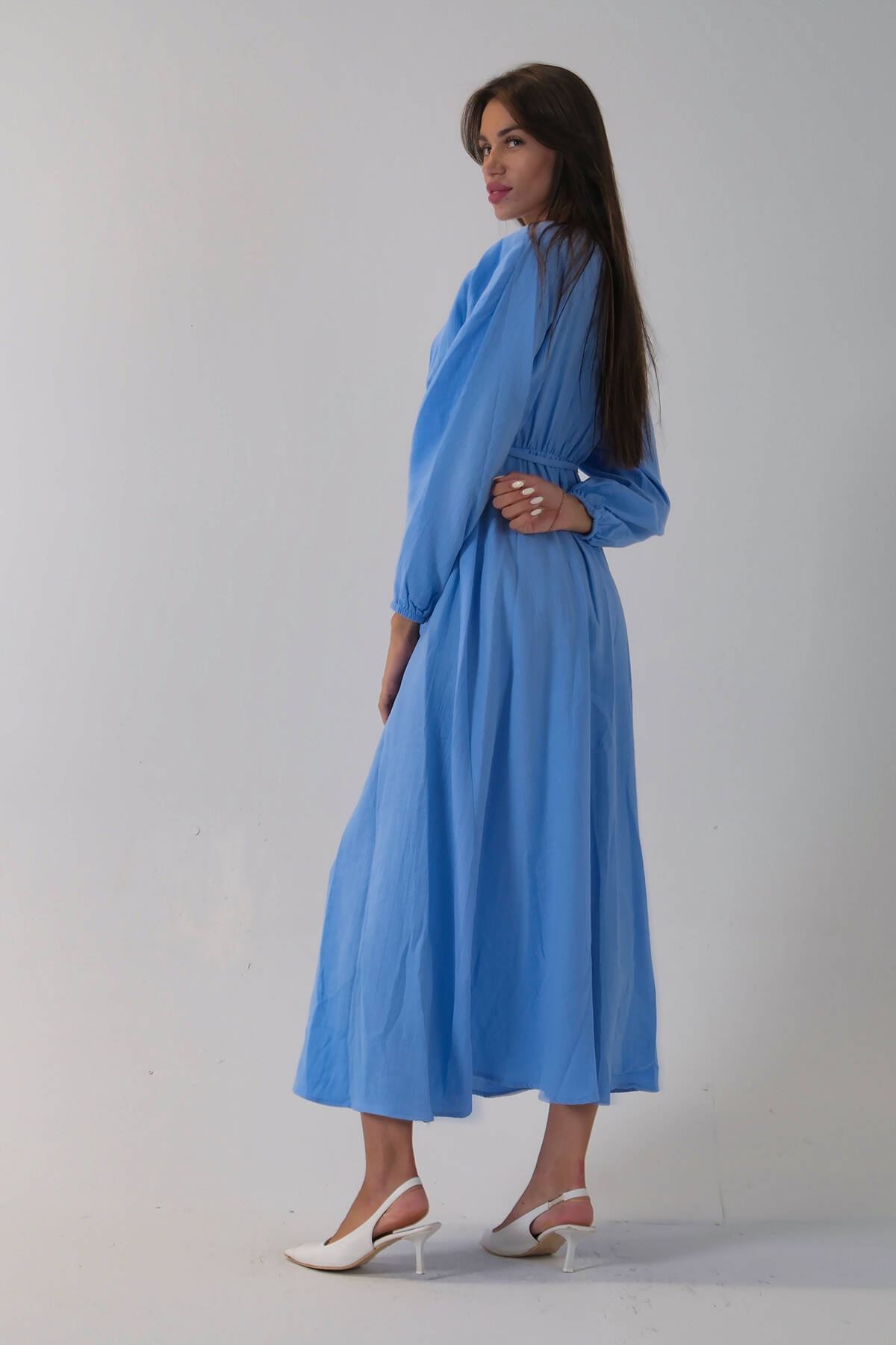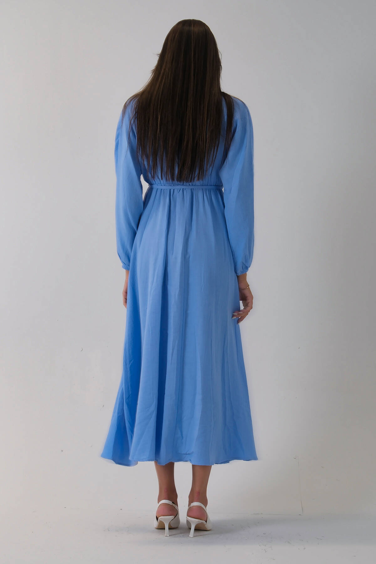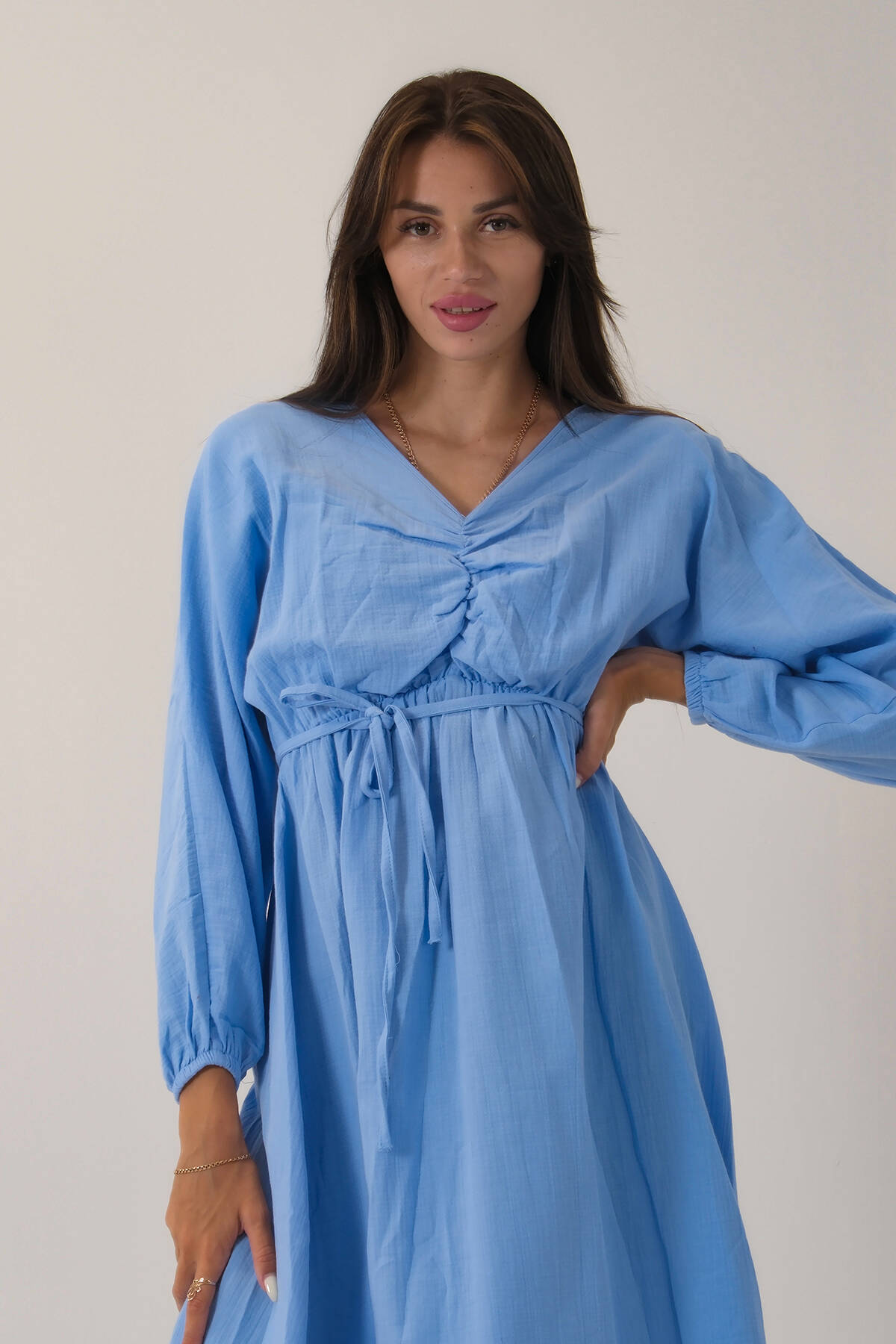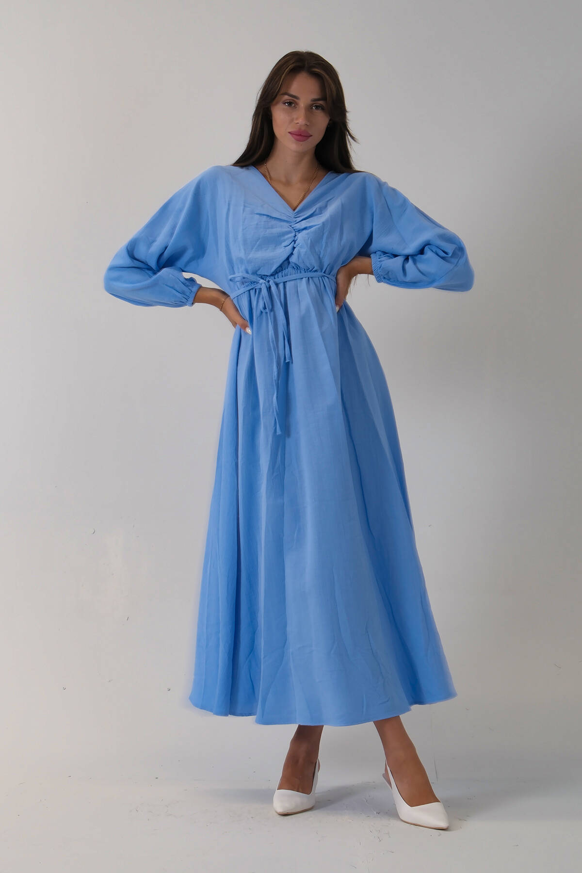 Mavi Beli Lastik Büzgülü V Yaka Bağlamalı Elbise 4593437.16