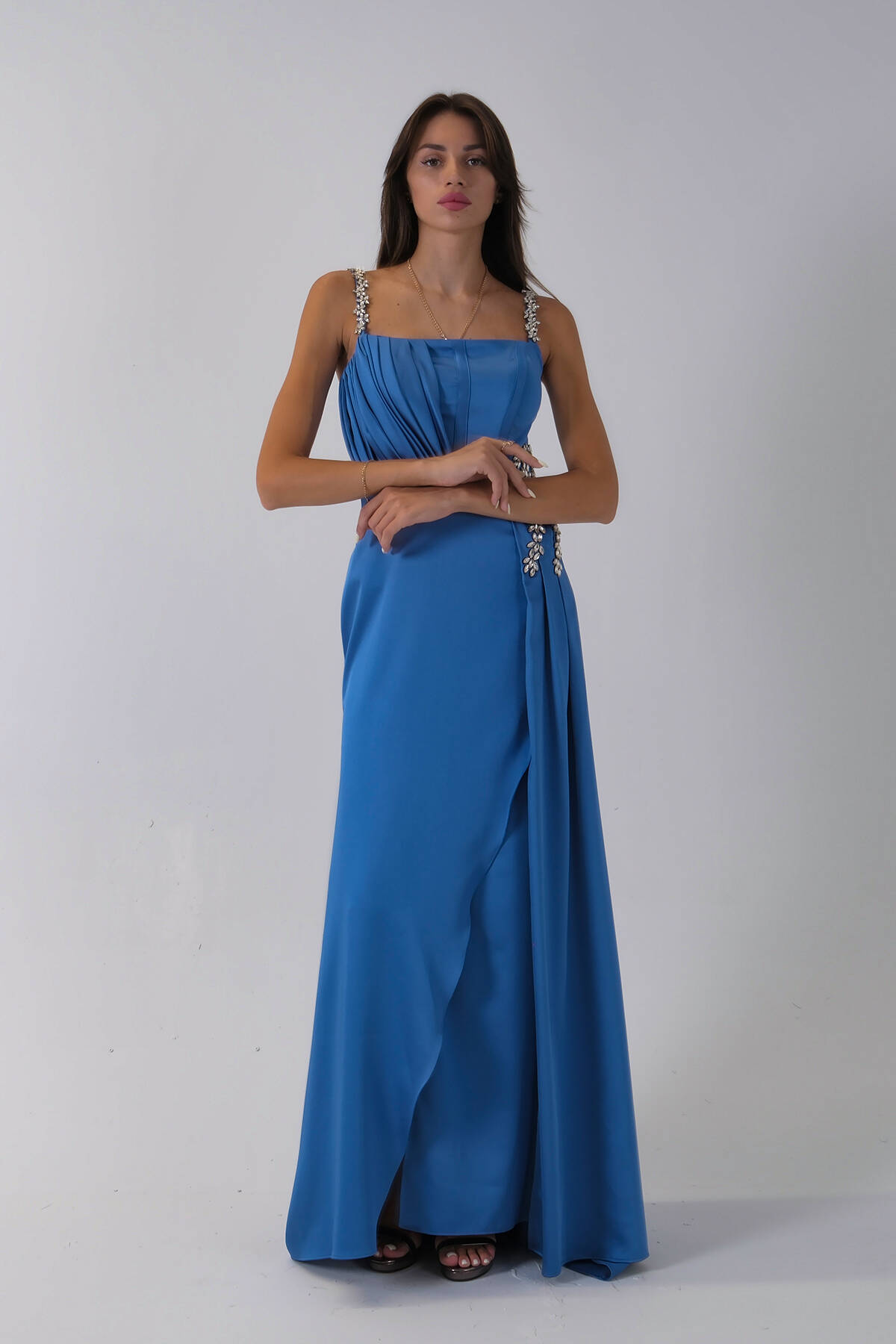 Mavi Beli ve Askısı Taş İşlemeli Yırtmaç Detaylı Abiye 0801033.16