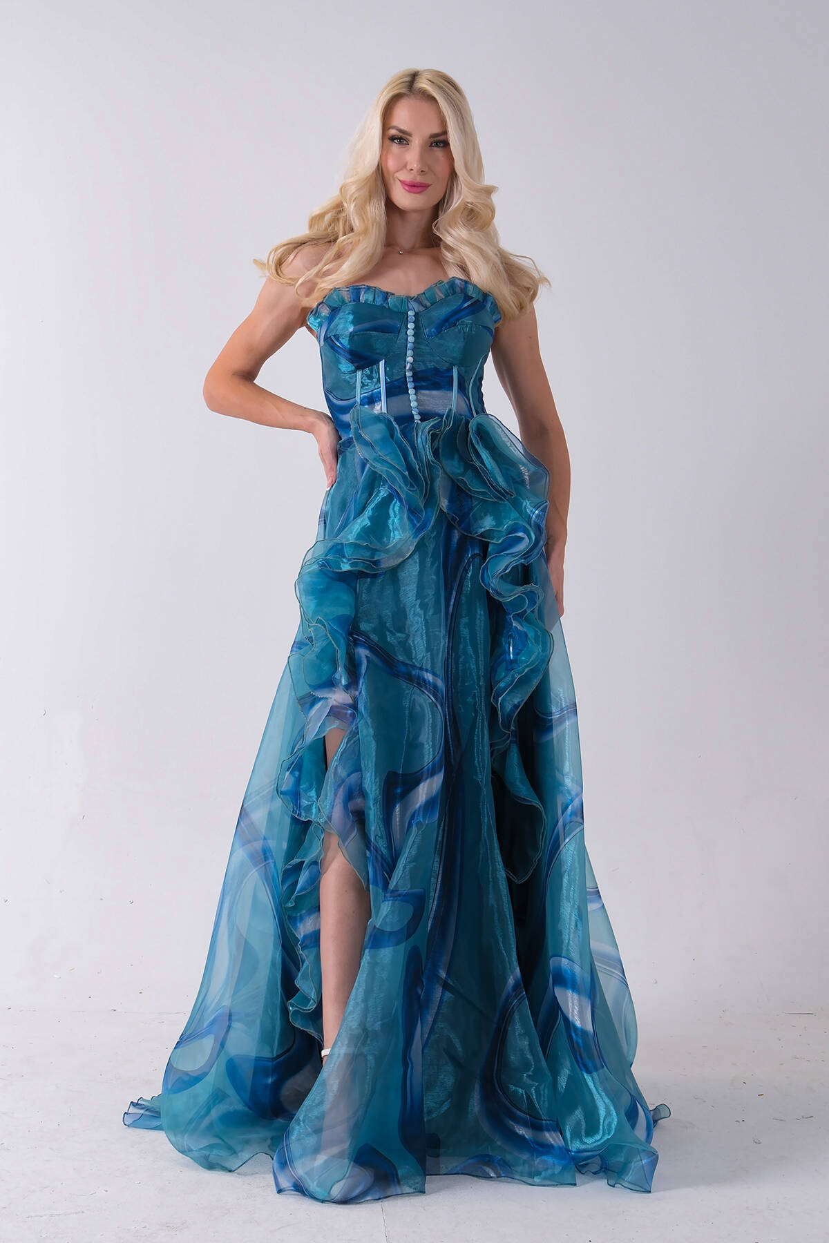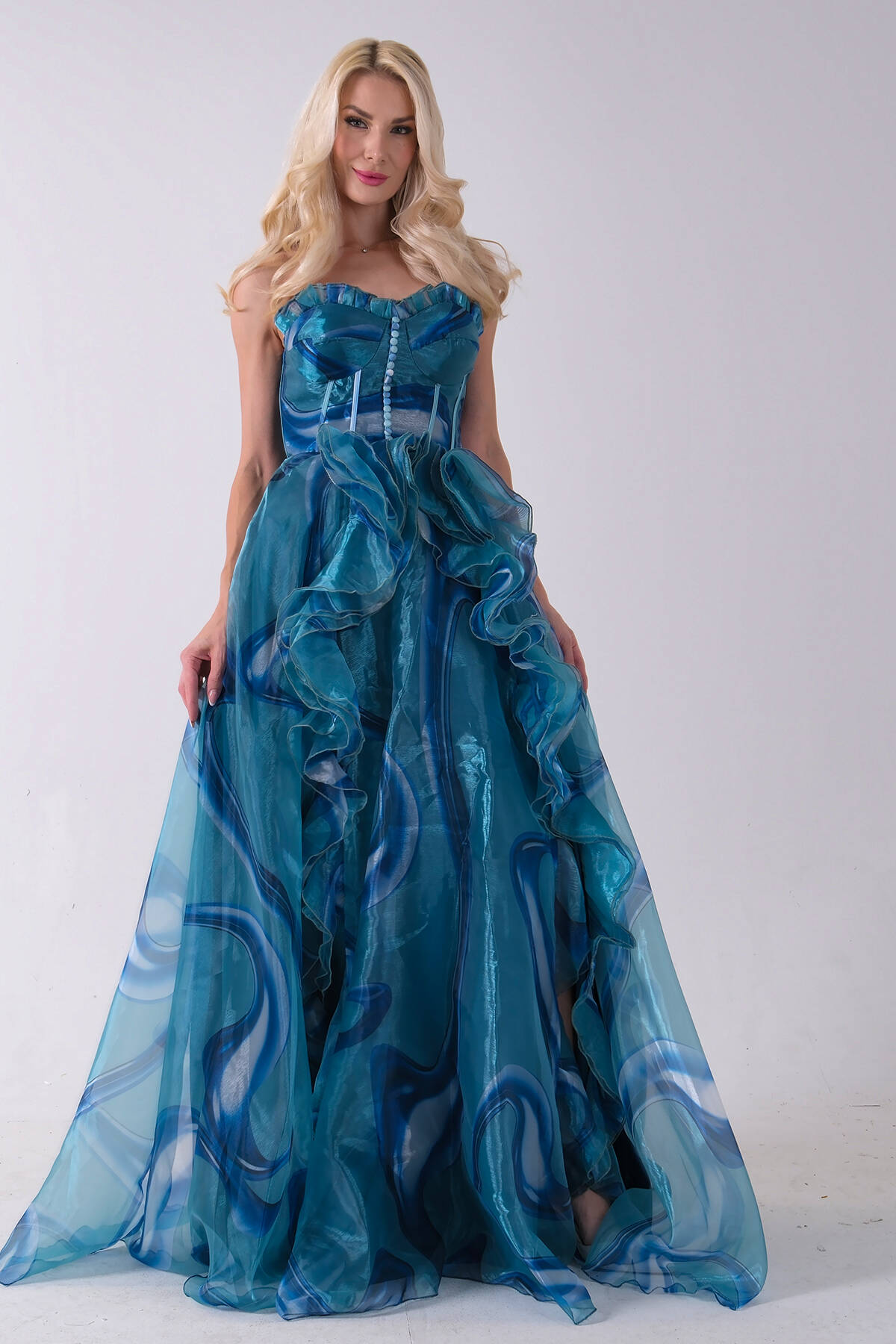Mavi Straplez Yaka Önü Düğme Detaylı Desenli Fırfırlı Abiye 9705680.16
