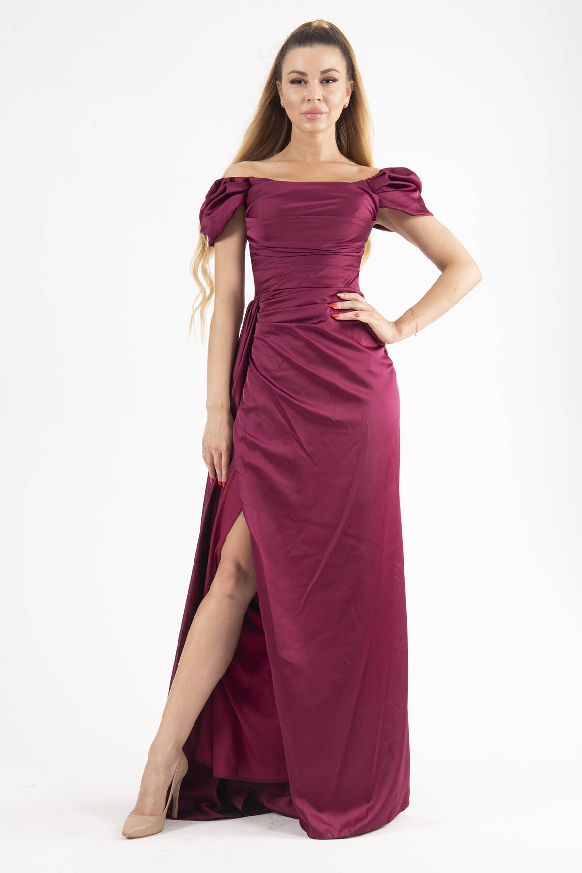 Ürün Özellikleri: Kayık yaka, prenses kollu, göğüs drapeli ve gloplu, kuyruklu, içi rengine uyumlu astarlı, kadın uzun abiye elbise