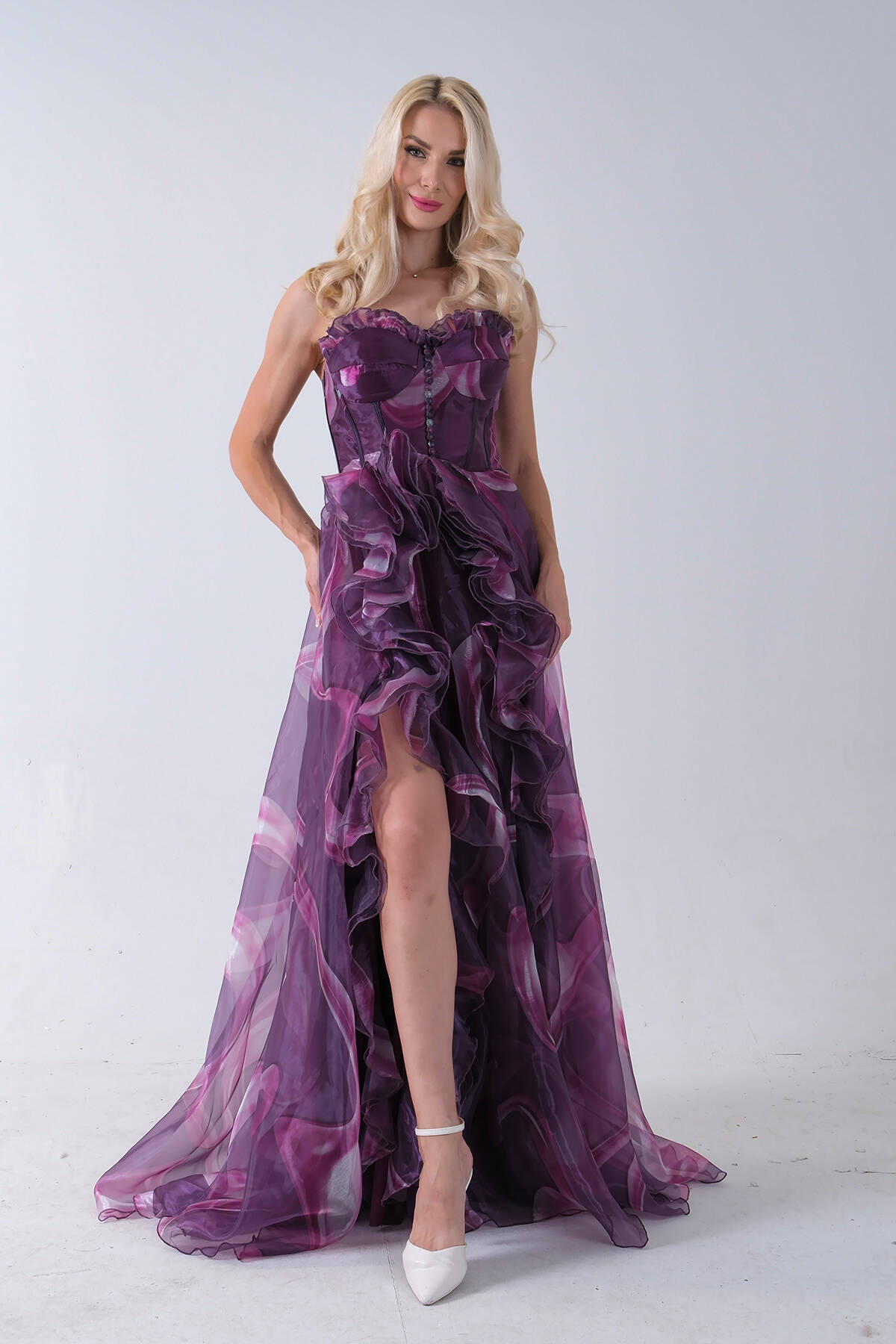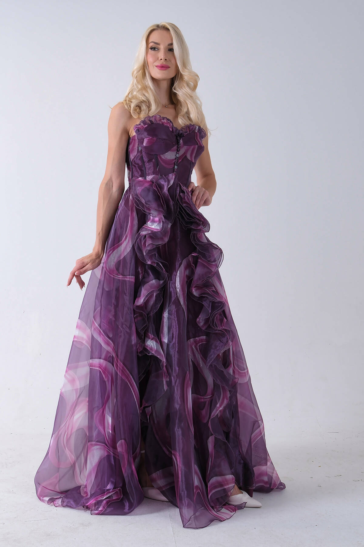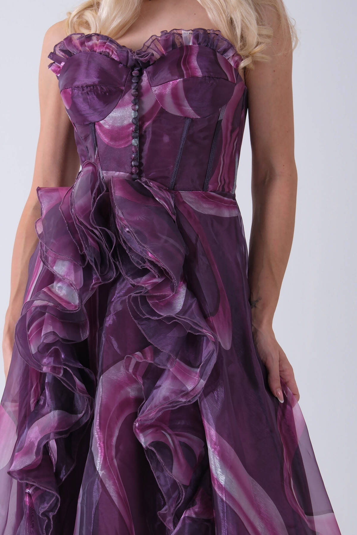 Mürdüm Straplez Yaka Önü Düğme Detaylı Desenli Fırfırlı Abiye 9705680.21