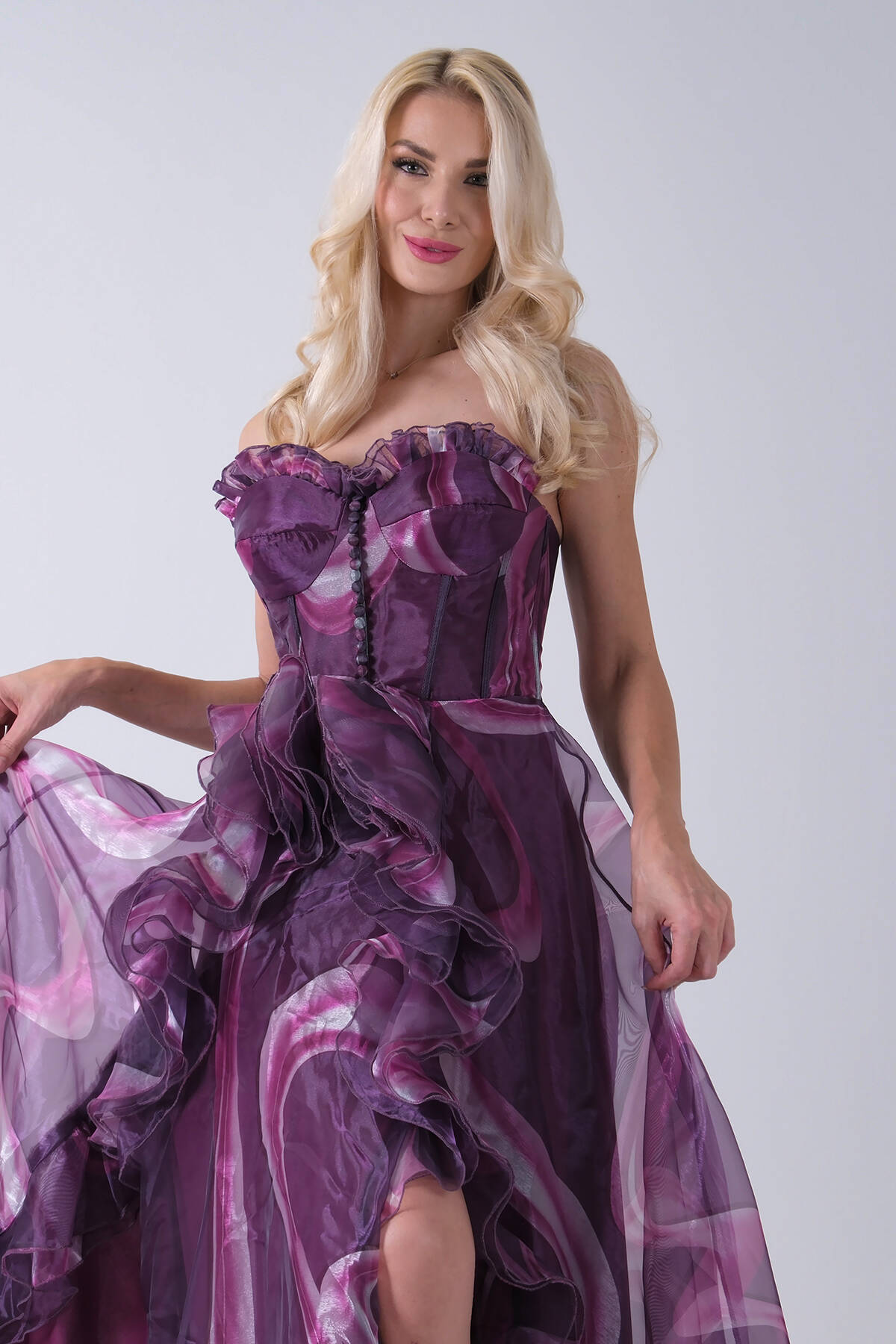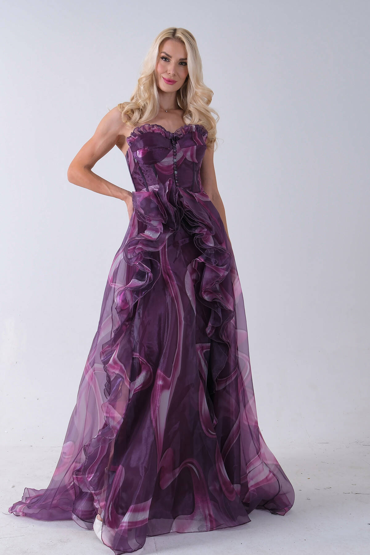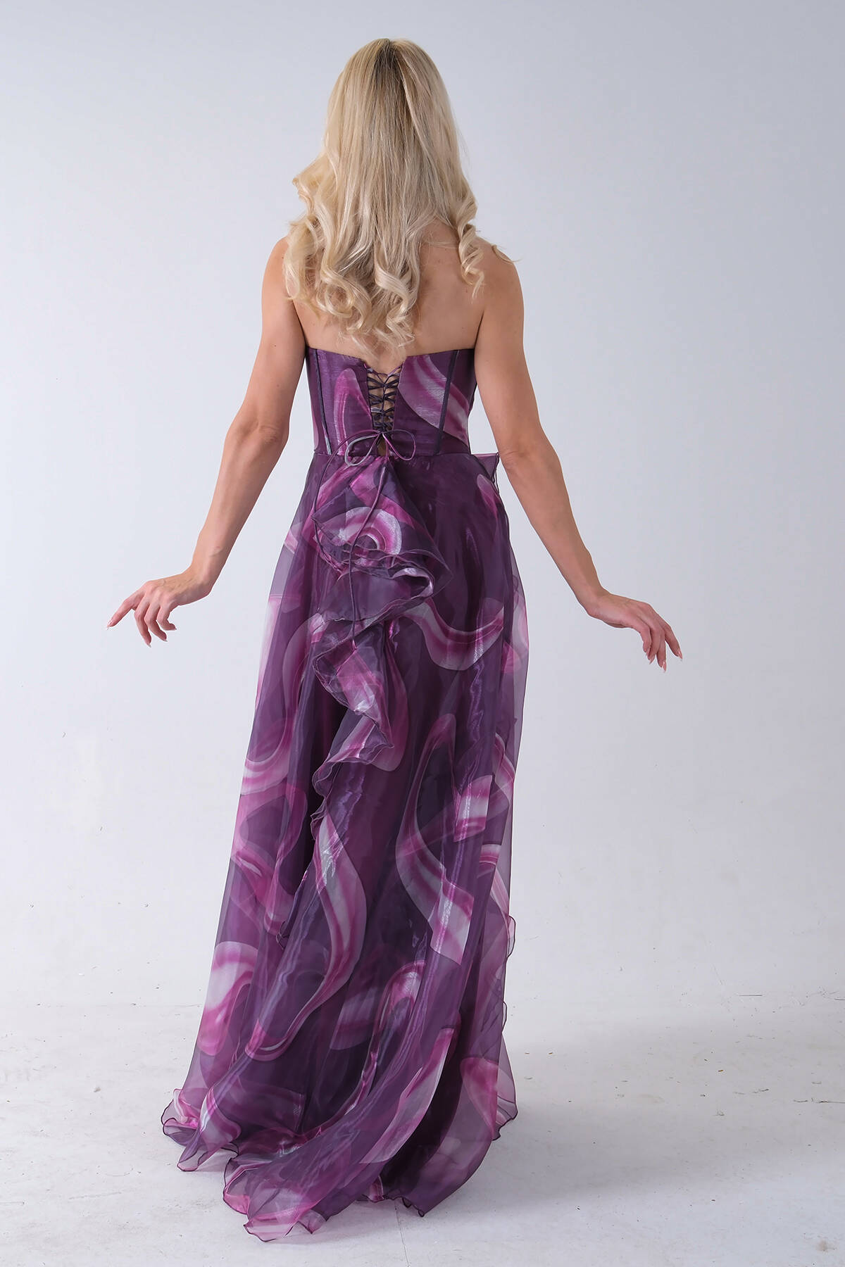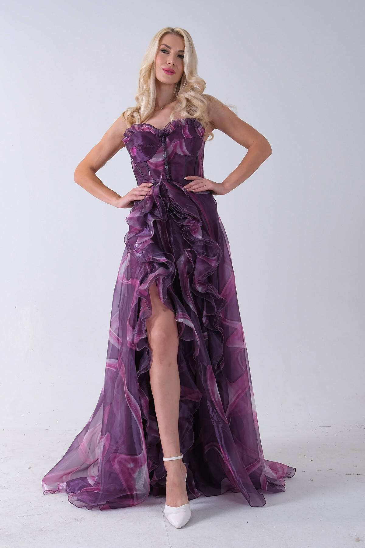 Mürdüm Straplez Yaka Önü Düğme Detaylı Desenli Fırfırlı Abiye 9705680.21