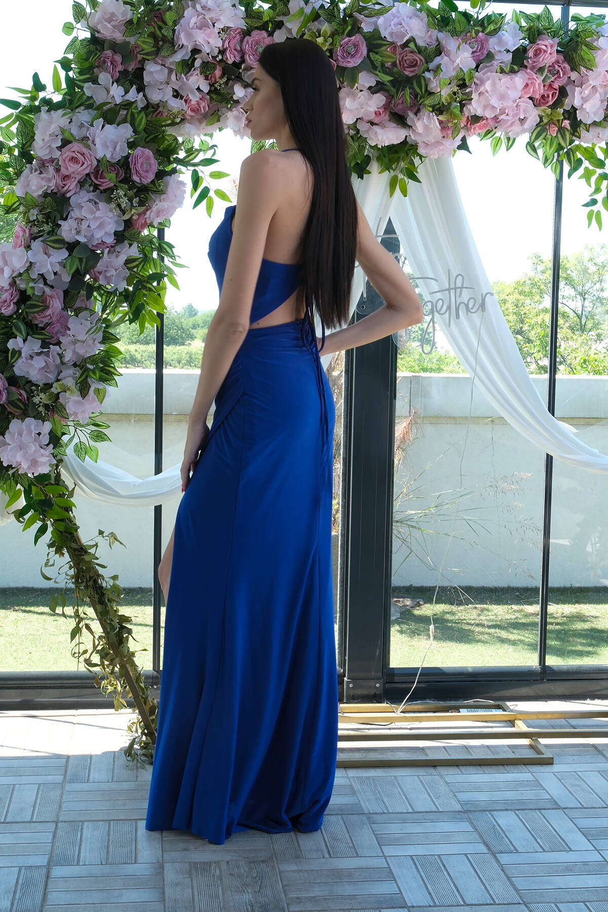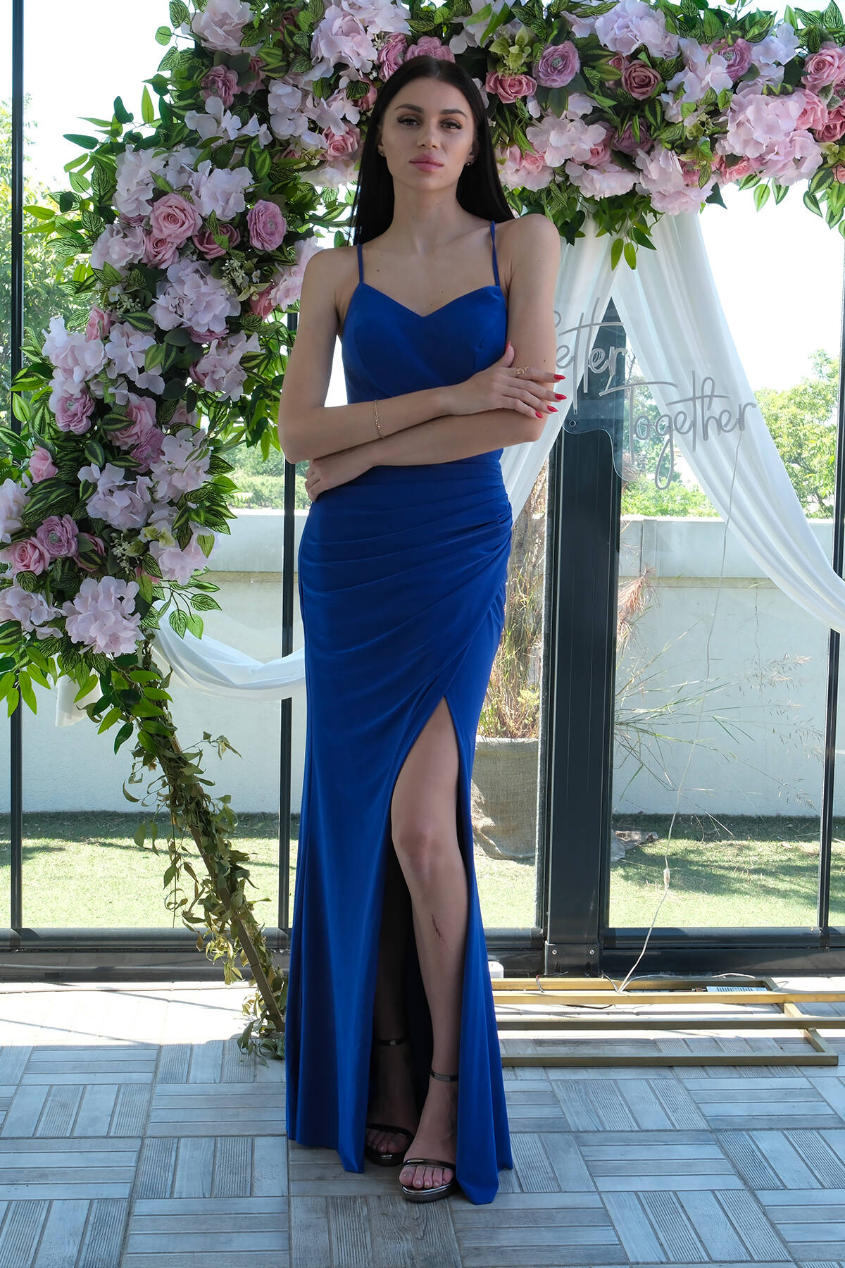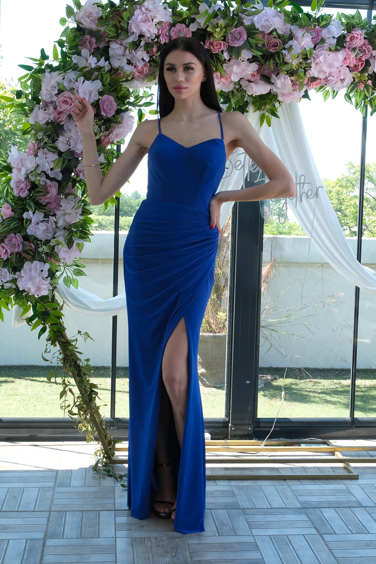 Saks Askılı Yırtmaç Detaylı Drapeli Abiye 9705289.26