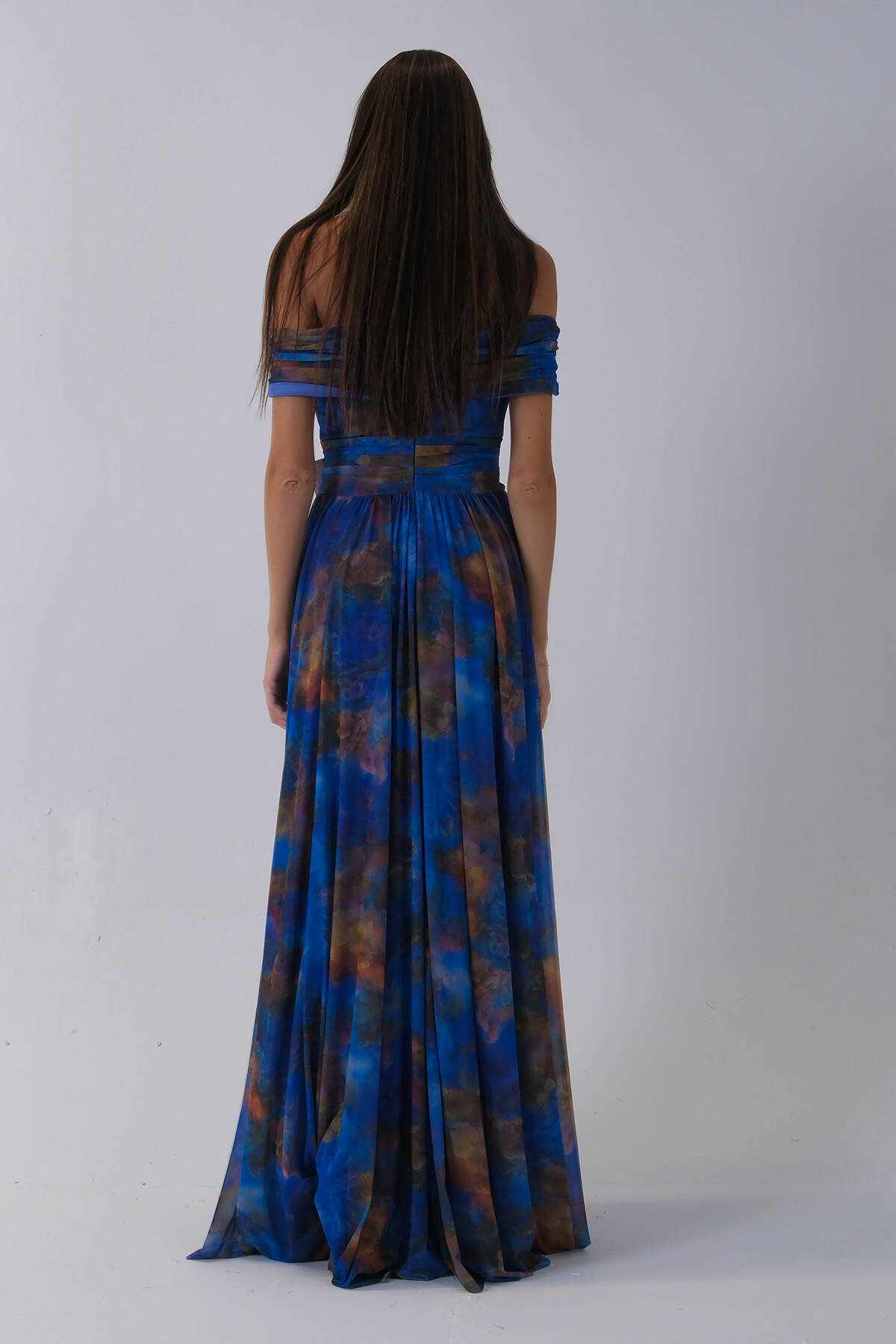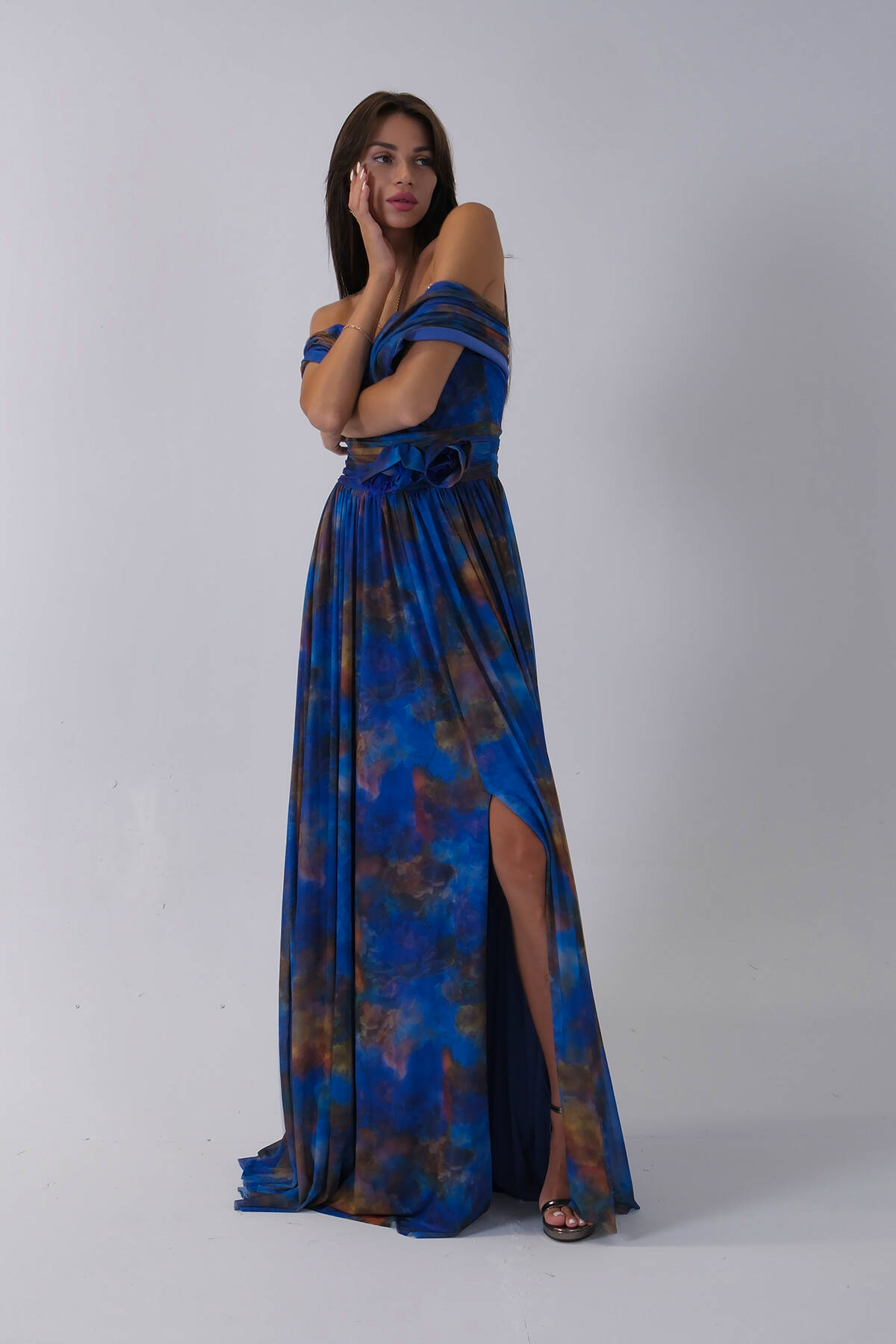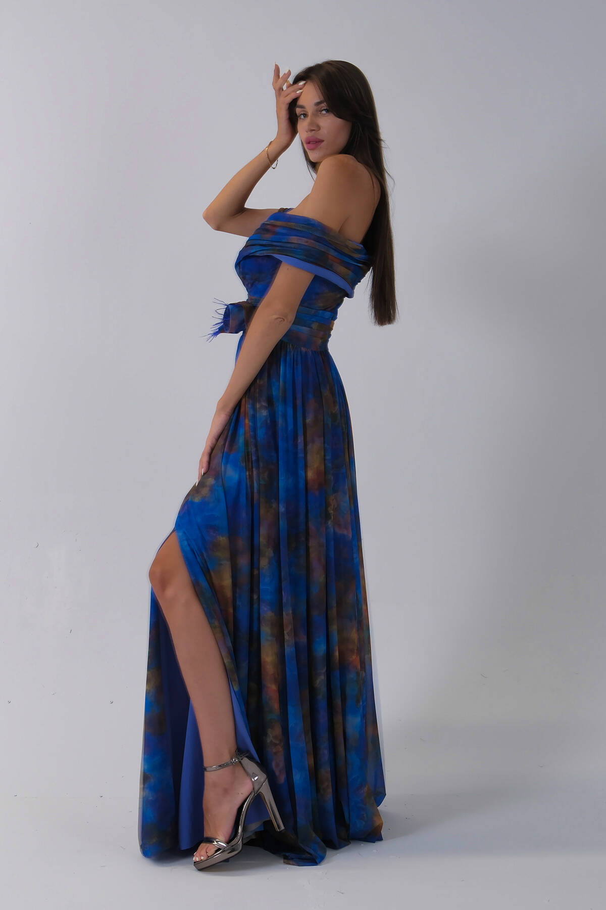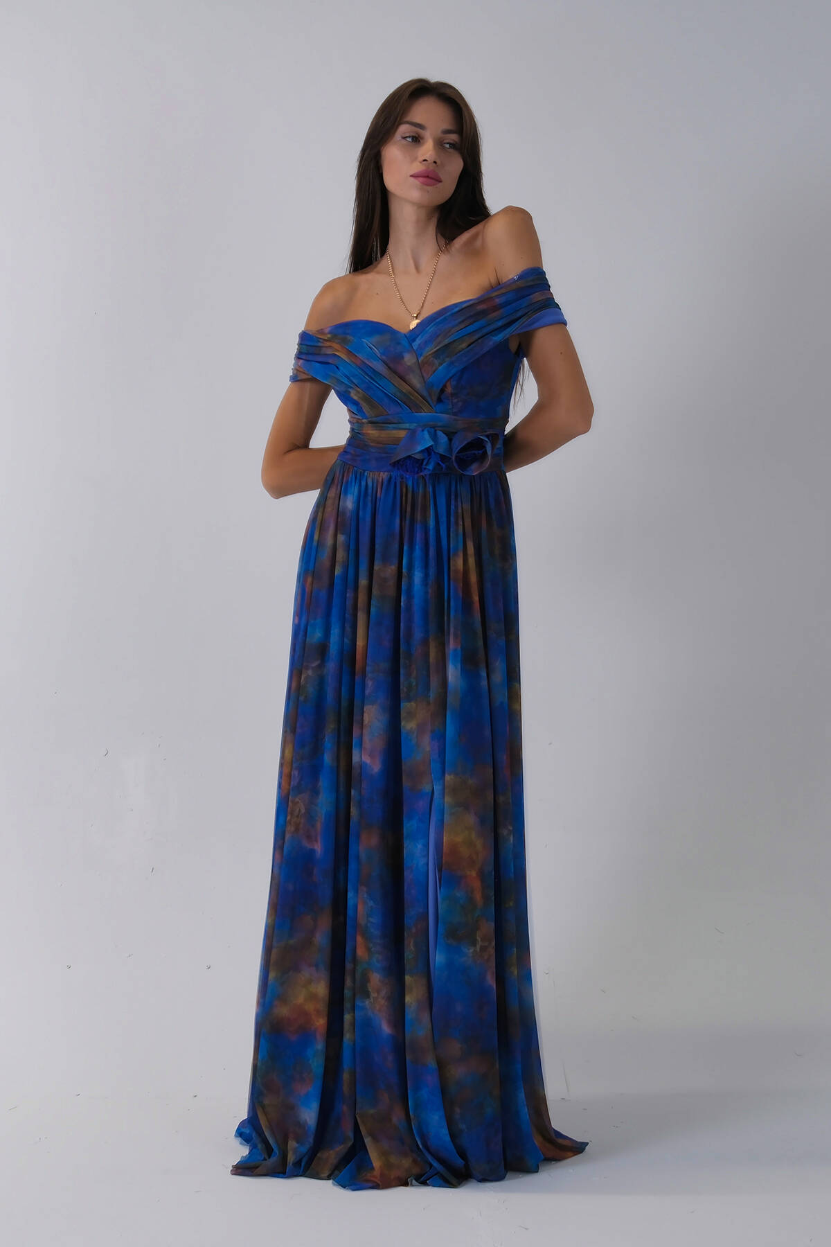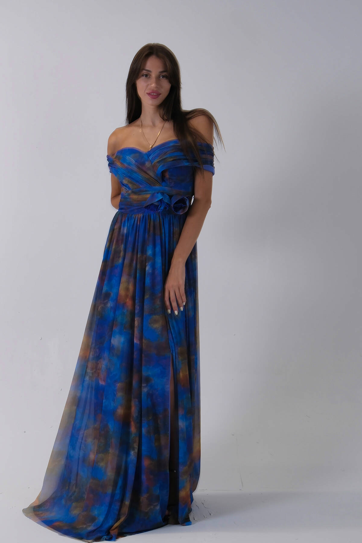 Saks Beli Çiçek Detaylı Desenli Şifon Abiye 0801102.26