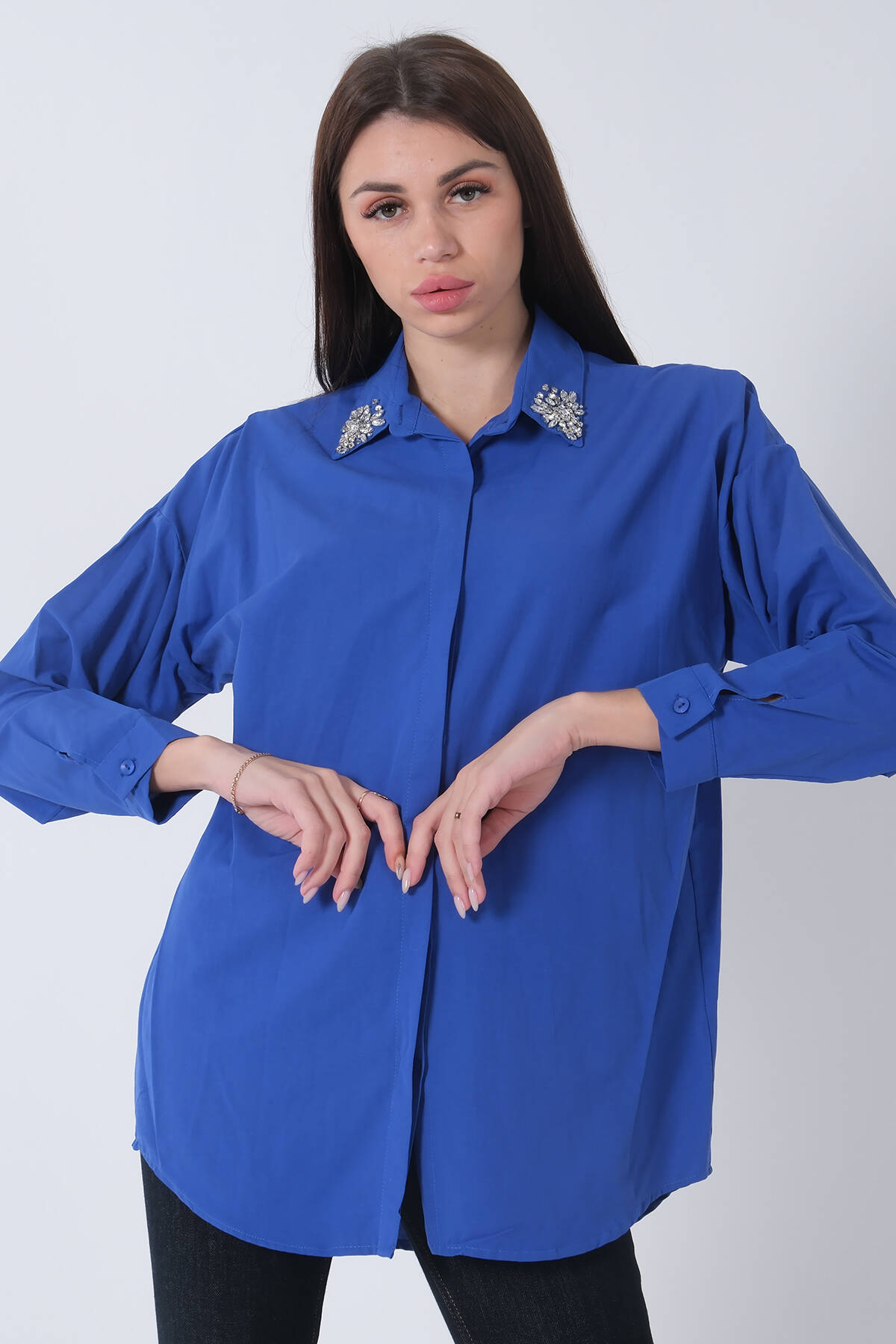 Uzun Kol Düşük Omuz Yakası Taşlı Önden Düğmeli Gömlek