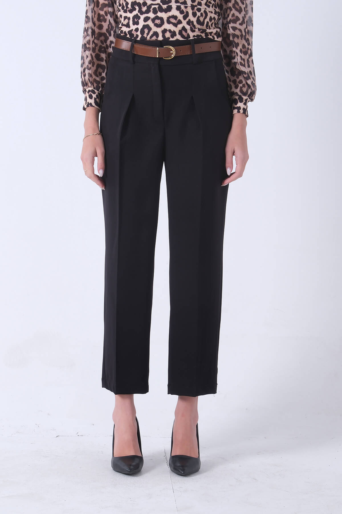 Siyah İnce Kemerli Cepsiz Bol Paça Uzun Pantolon 03030306.01