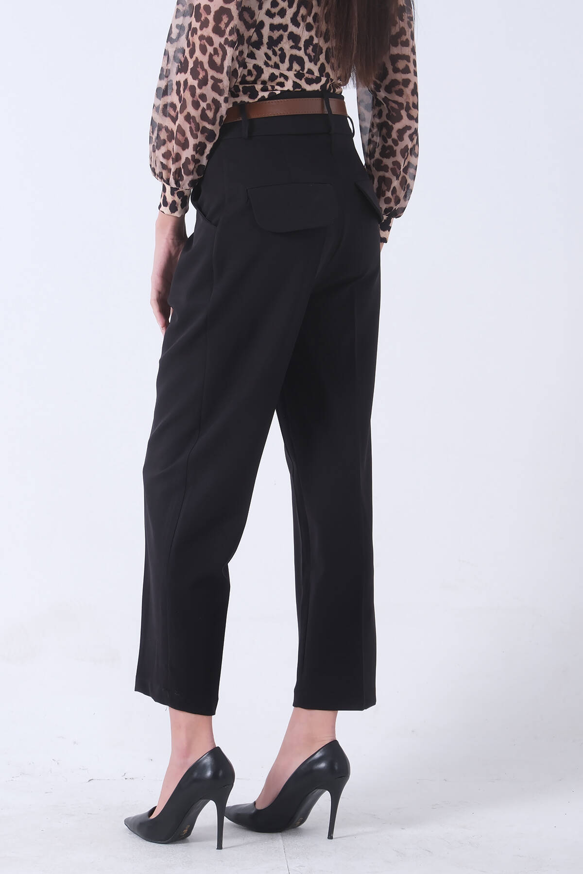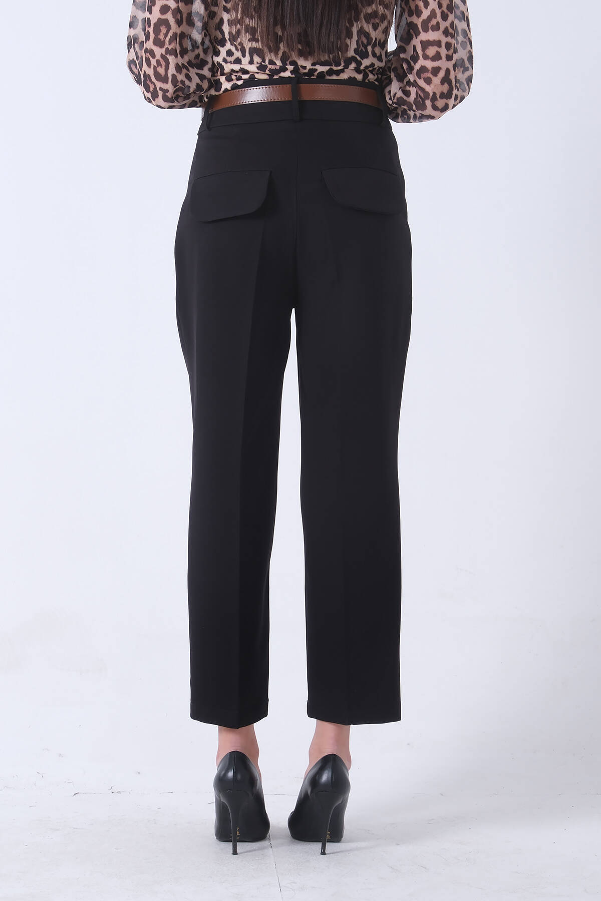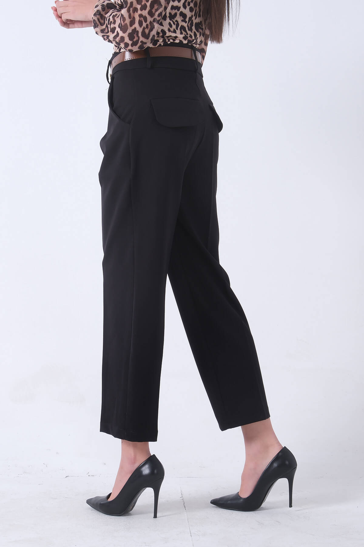 Siyah Arka Cep Kapaklı 2 Yan Cepli Kemerli Pantolon 3974164.01