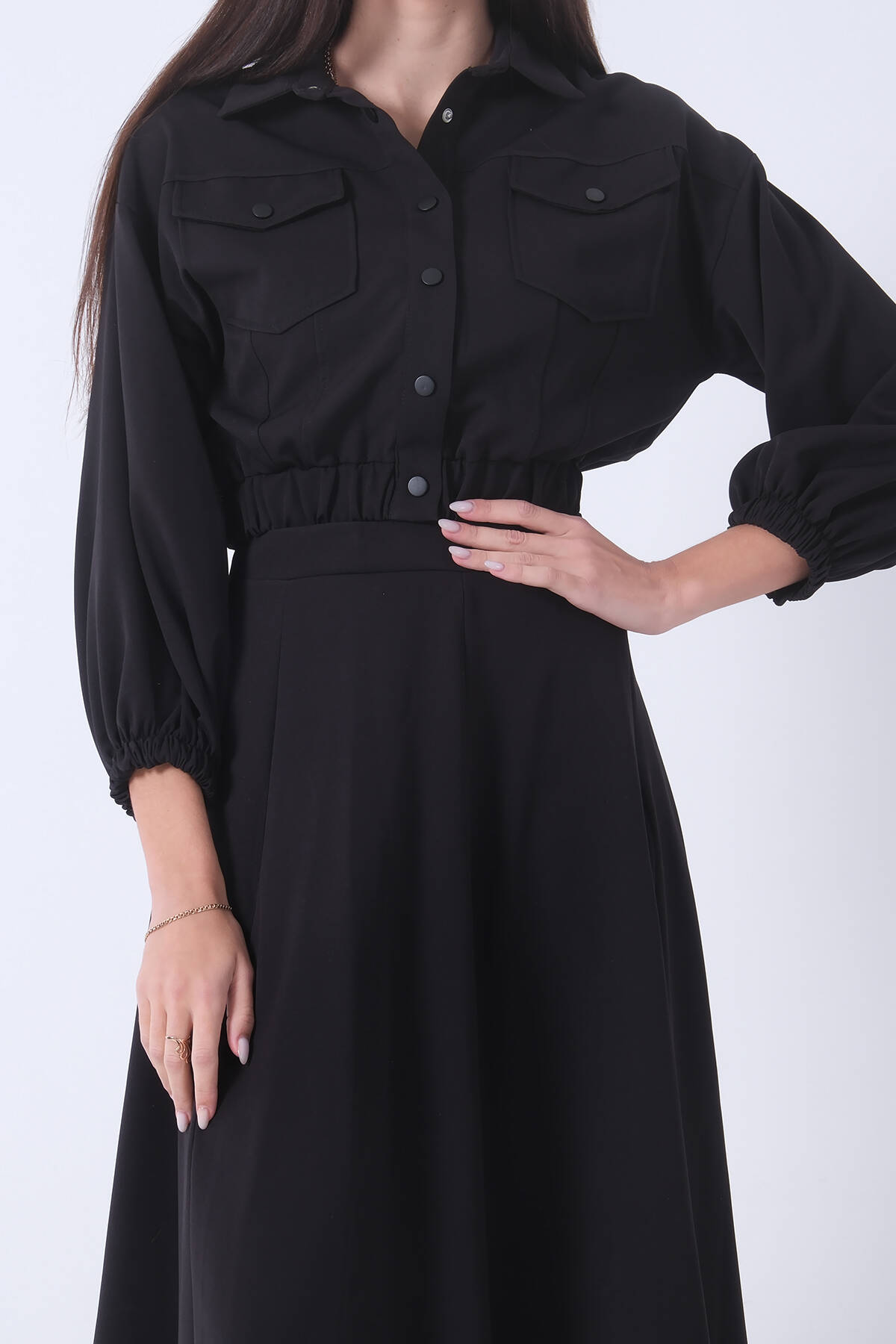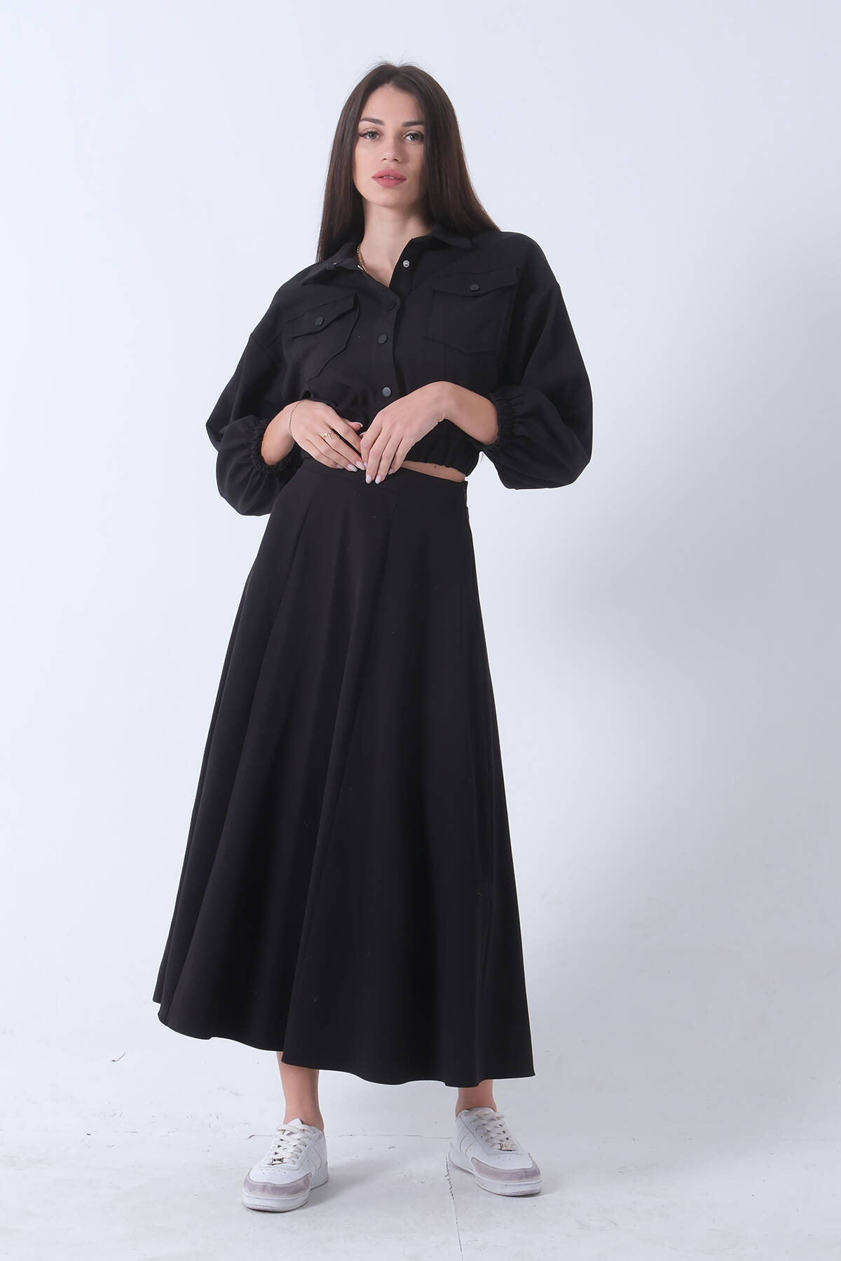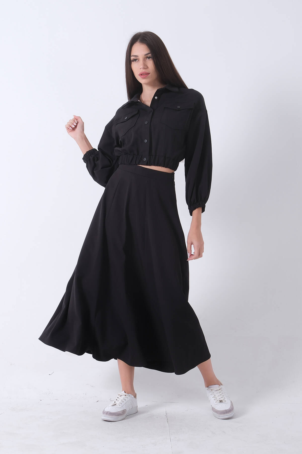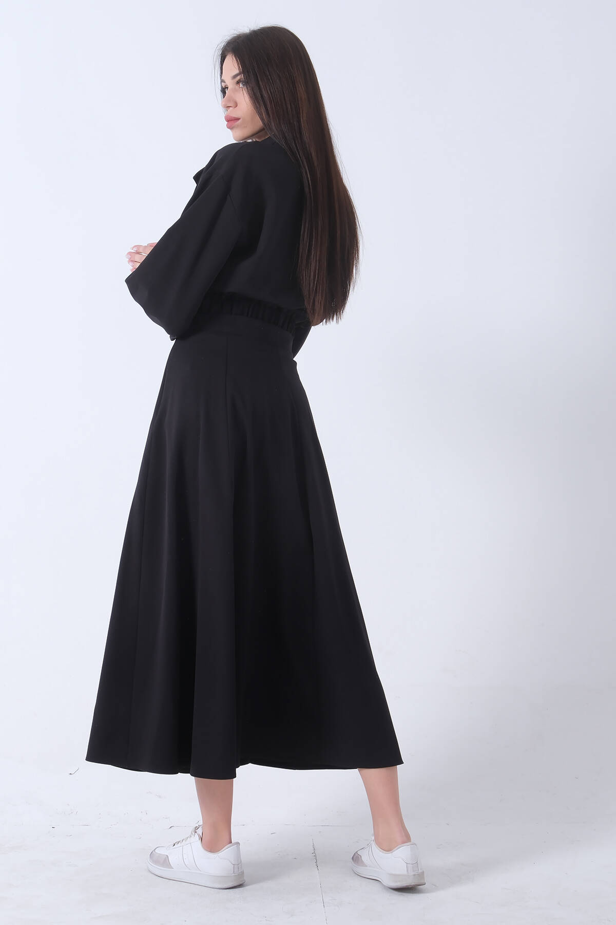 Siyah Beli Lastikli Cepli Ceket ve Etek İkili Takım 4595053.01