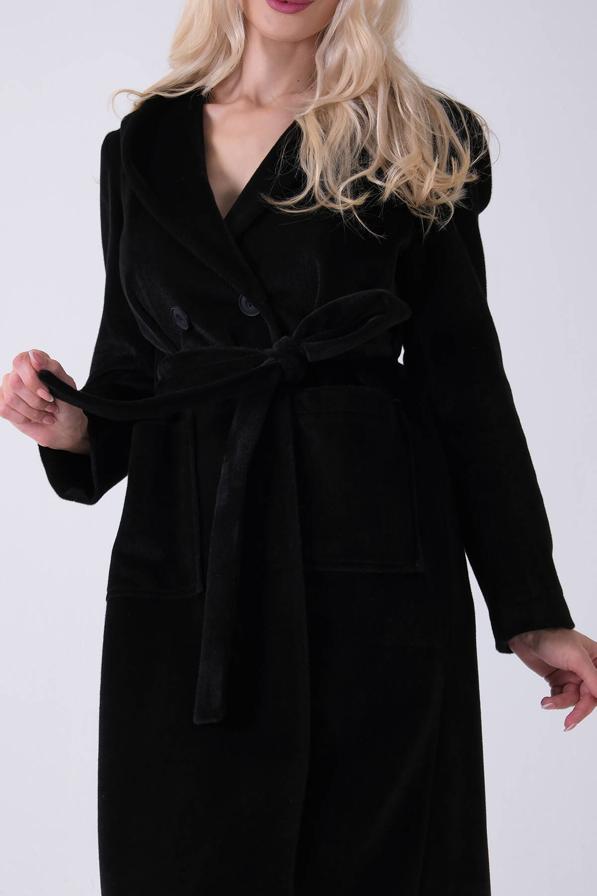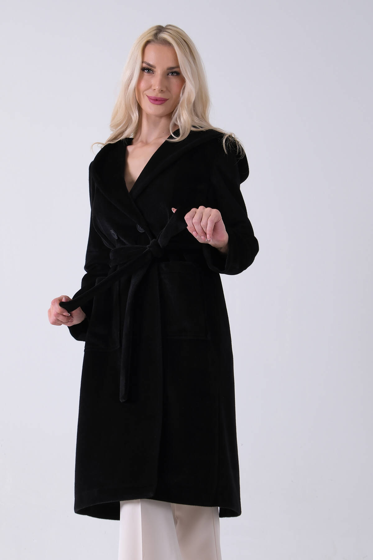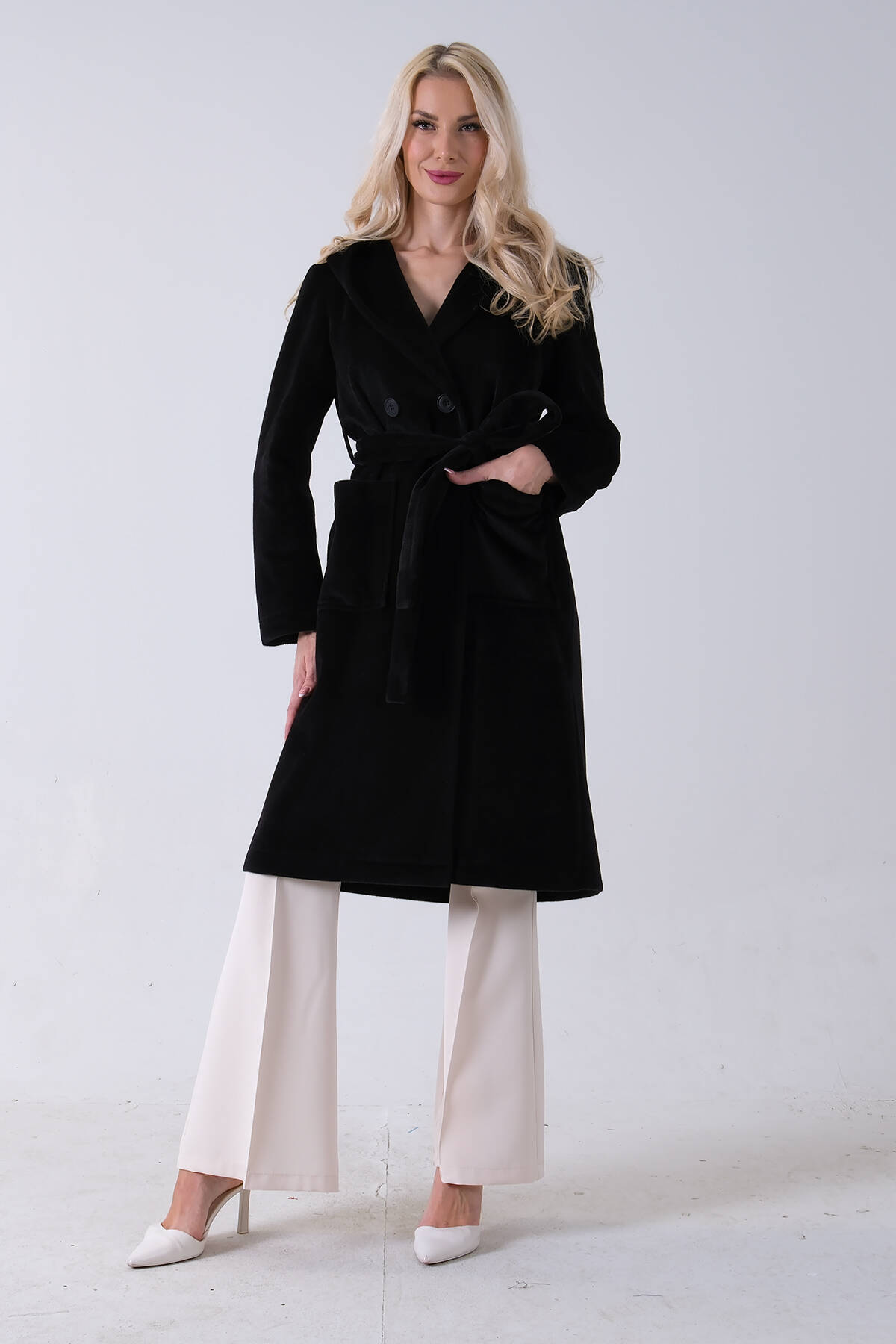 Siyah Çift Cepli Kemer Bağlamalı Kapüşonlu Yün Kaban 0108089.01