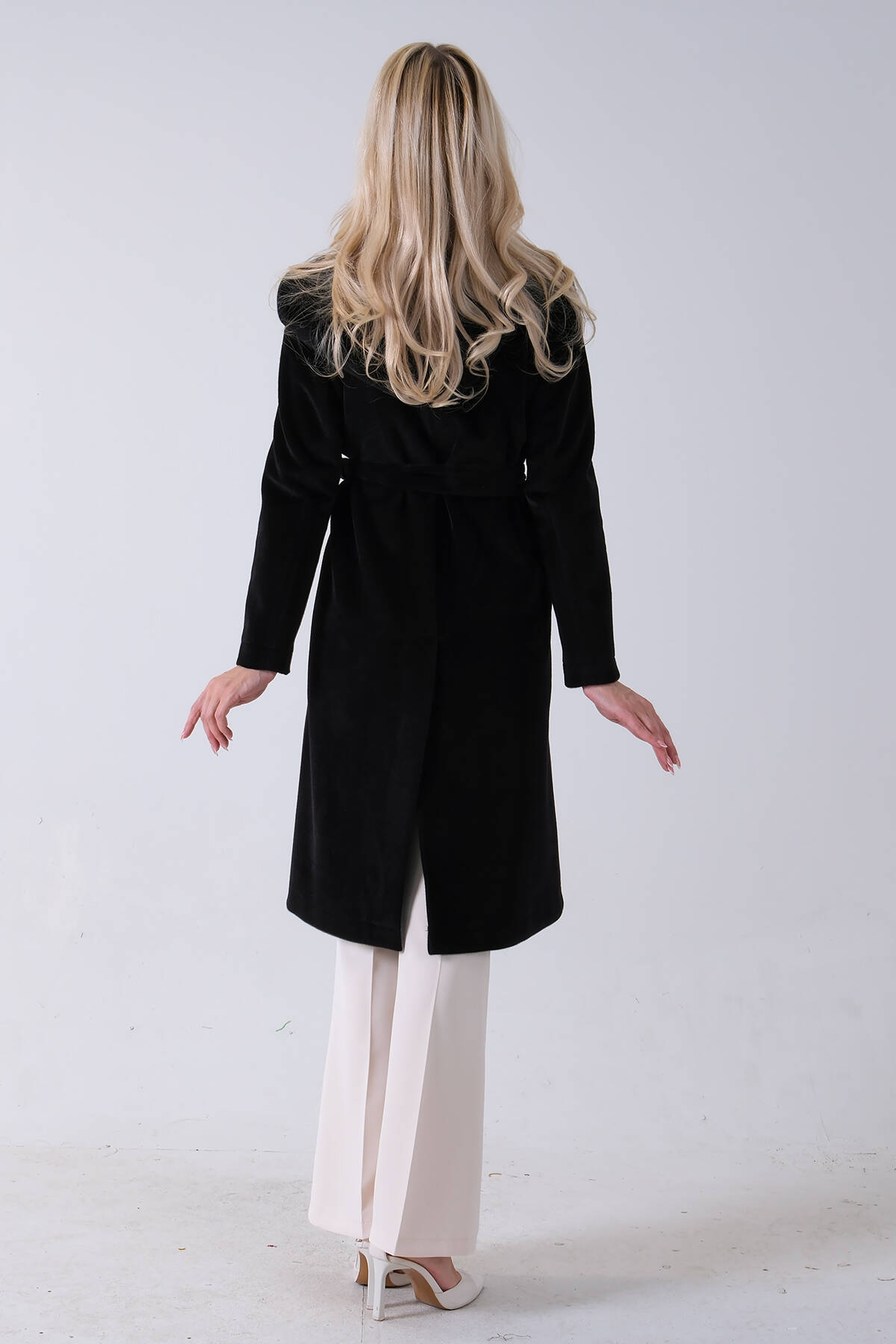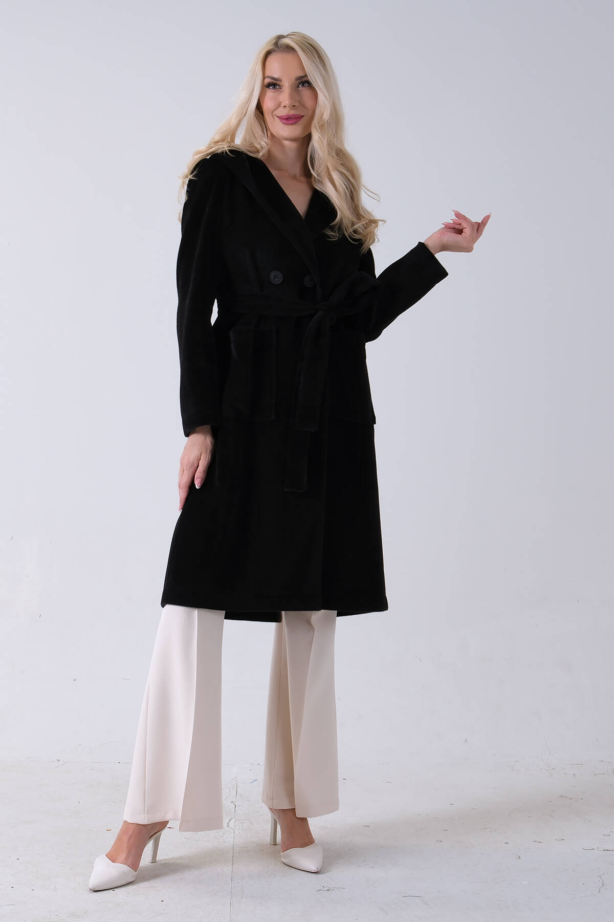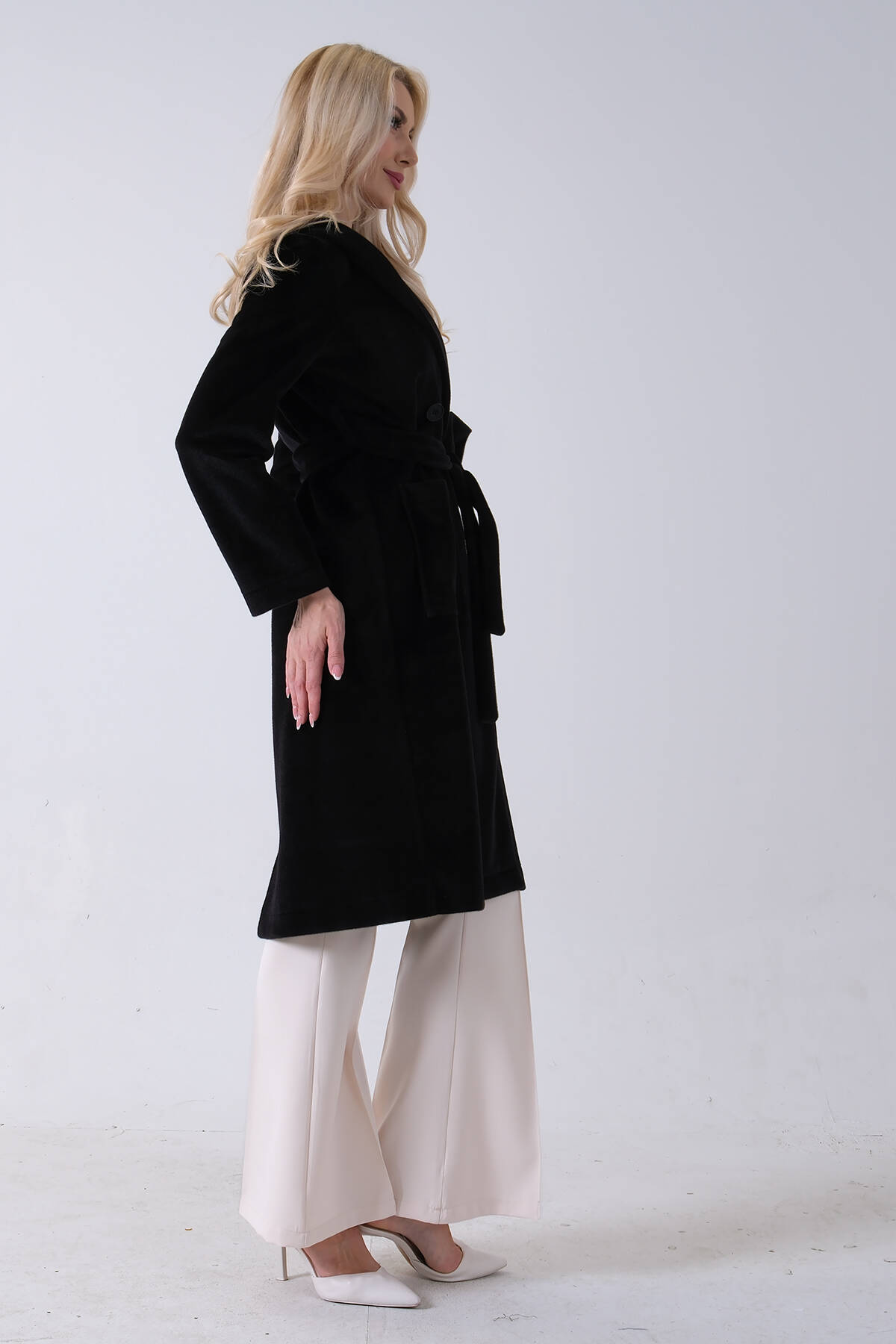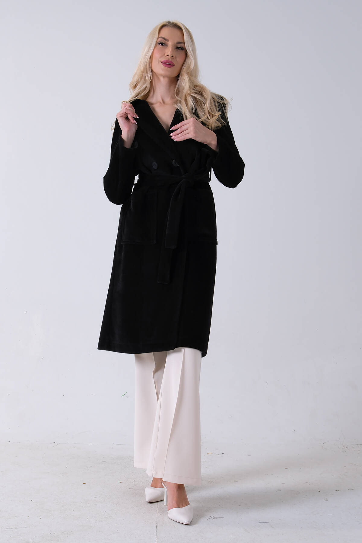 Siyah Çift Cepli Kemer Bağlamalı Kapüşonlu Yün Kaban 0108089.01