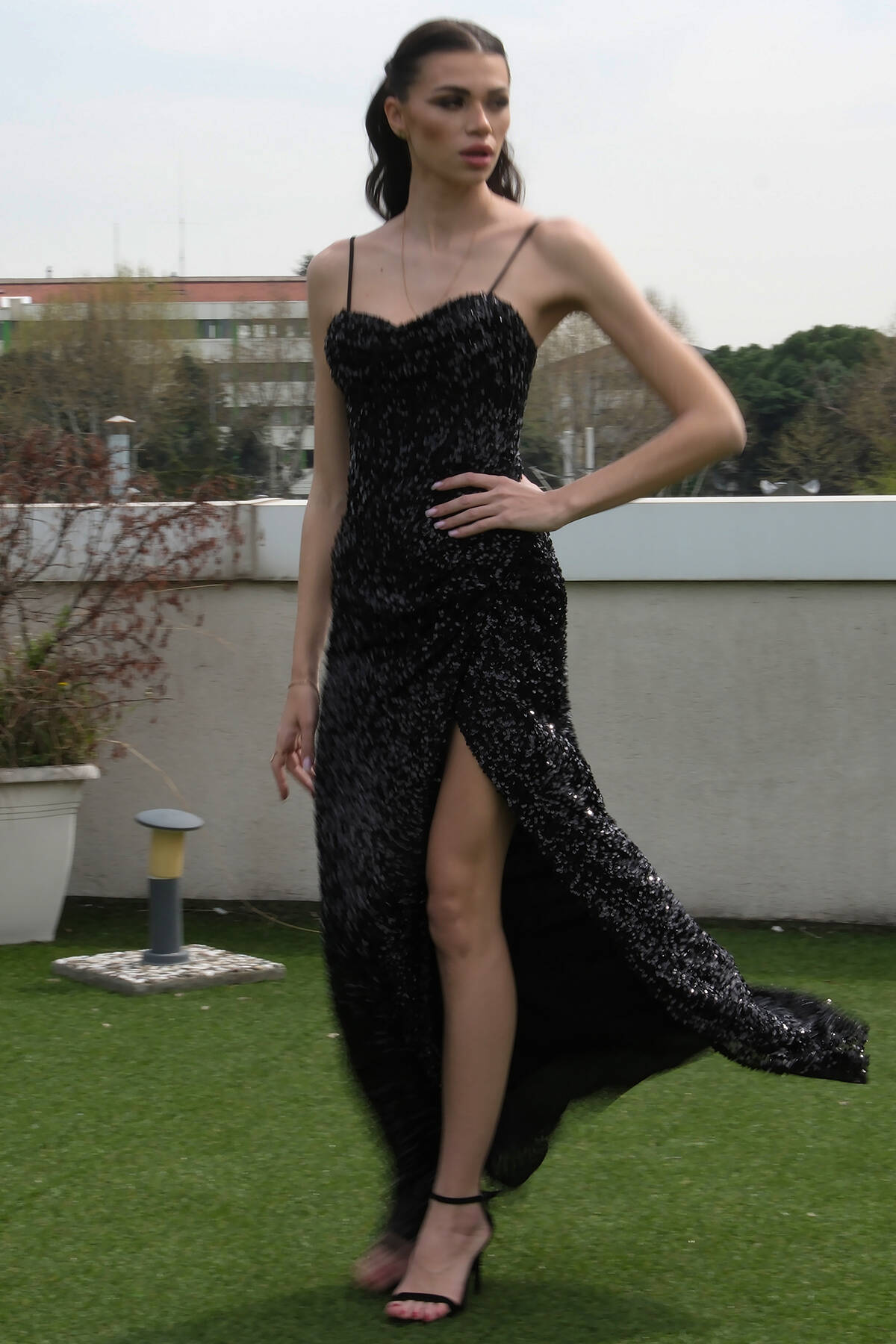Siyah Drapeli Parlak Pul Payetli Askılı Abiye 9705539.01