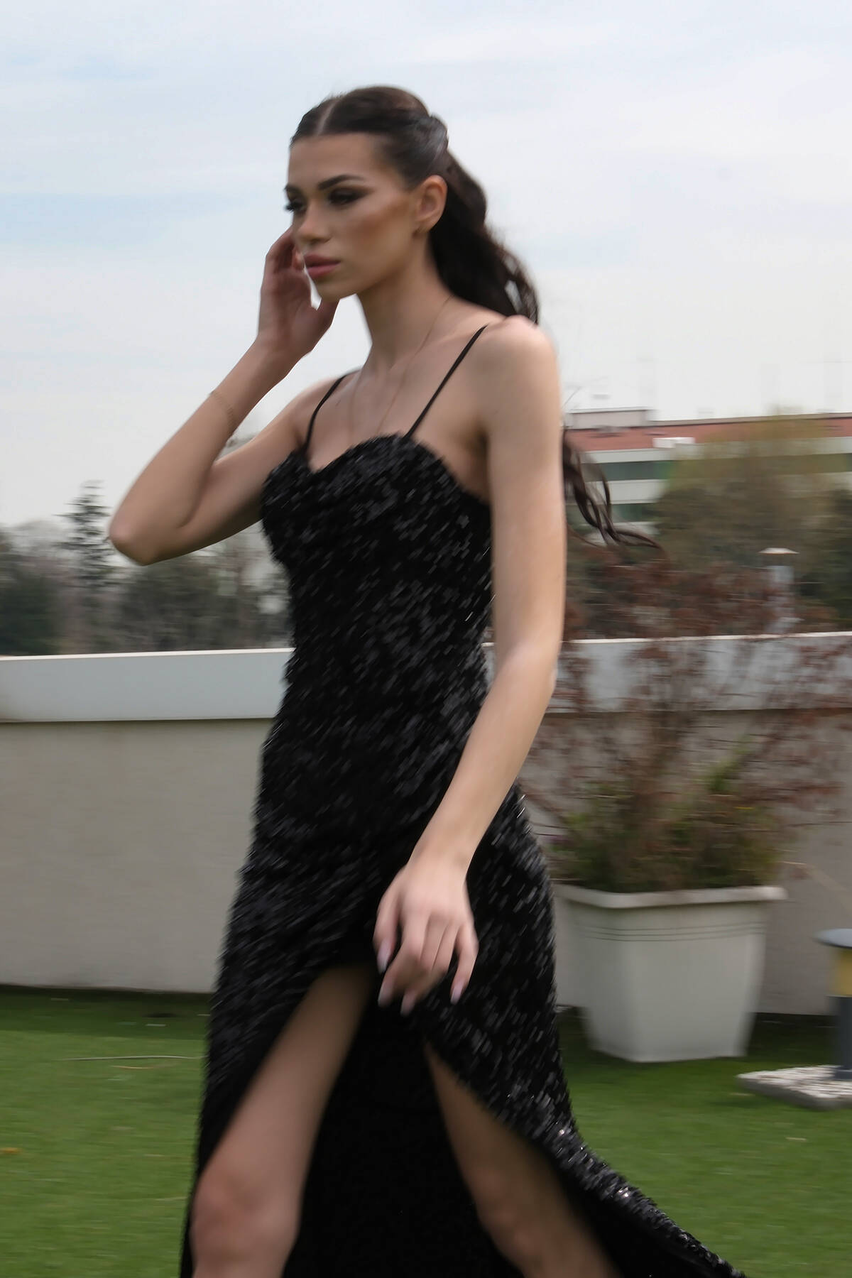 Siyah Çiçek Detaylı Pul Boncuk İşlemeli Kuyruklu Abiye 9705650.01