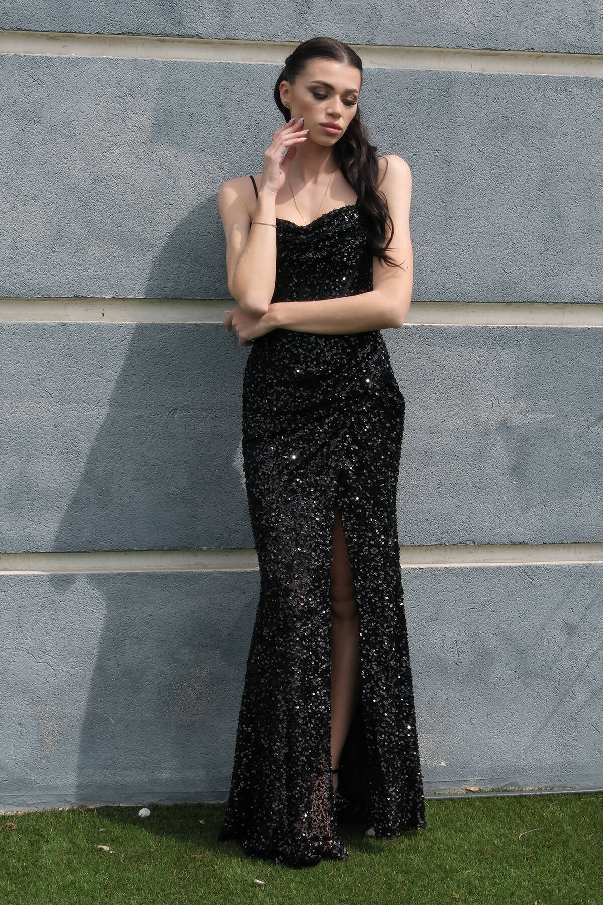 Gri Önü Taş Detaylı Yırtmaçlı Pul Payet Straplez Abiye 0801163.06