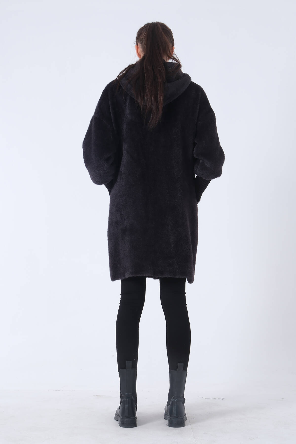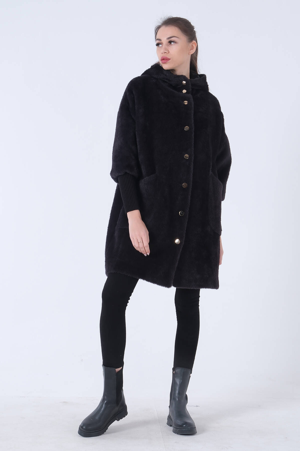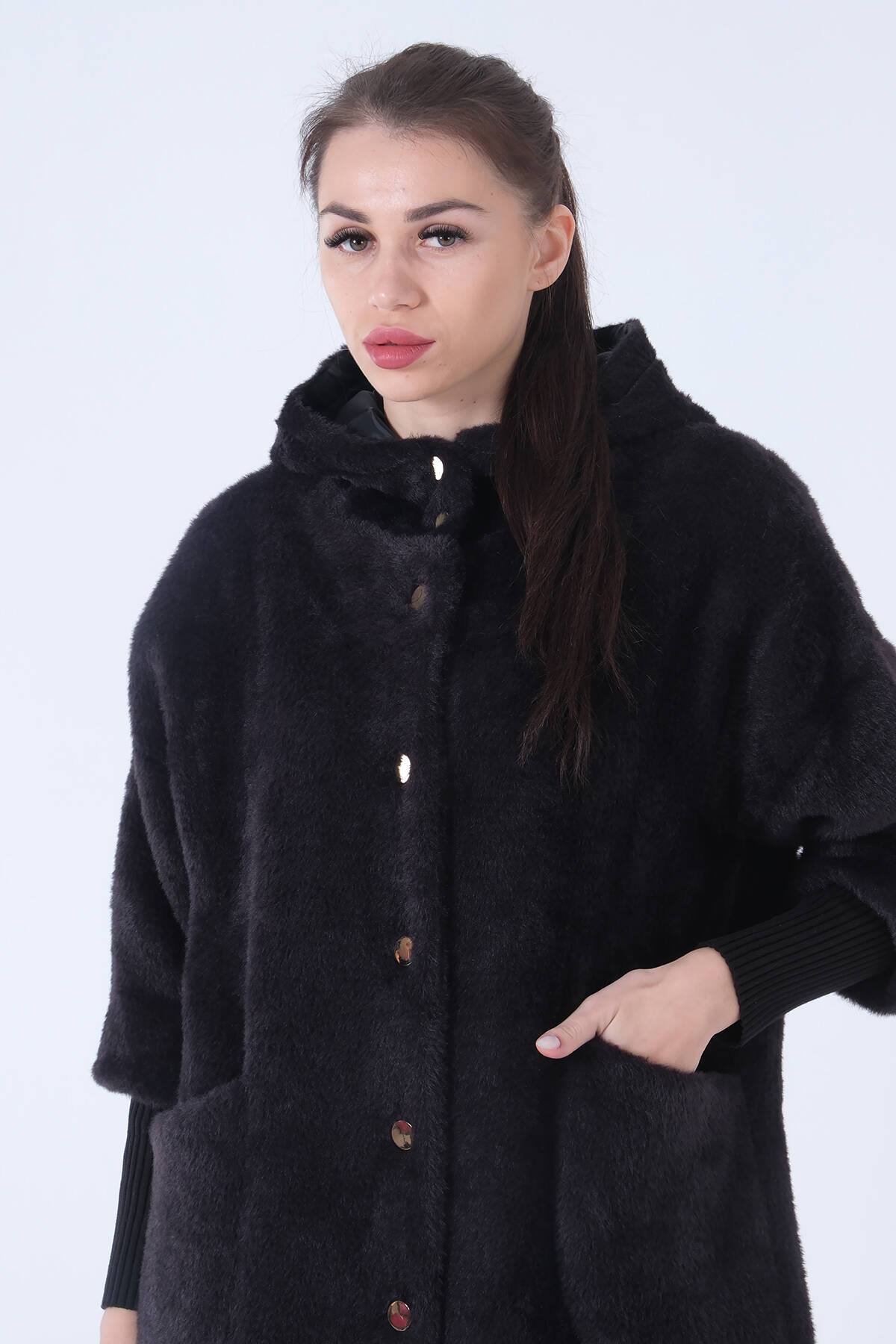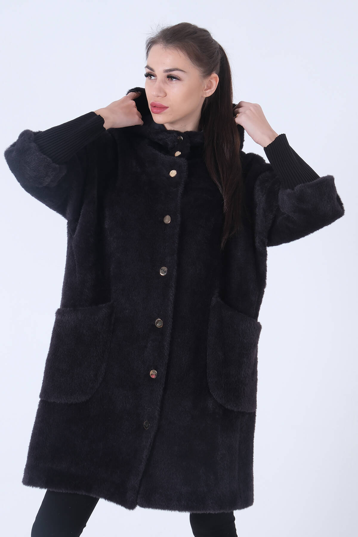 Siyah Gold Düğmeli Kapüşonlu Yün Peluş Kaban 44510388.01