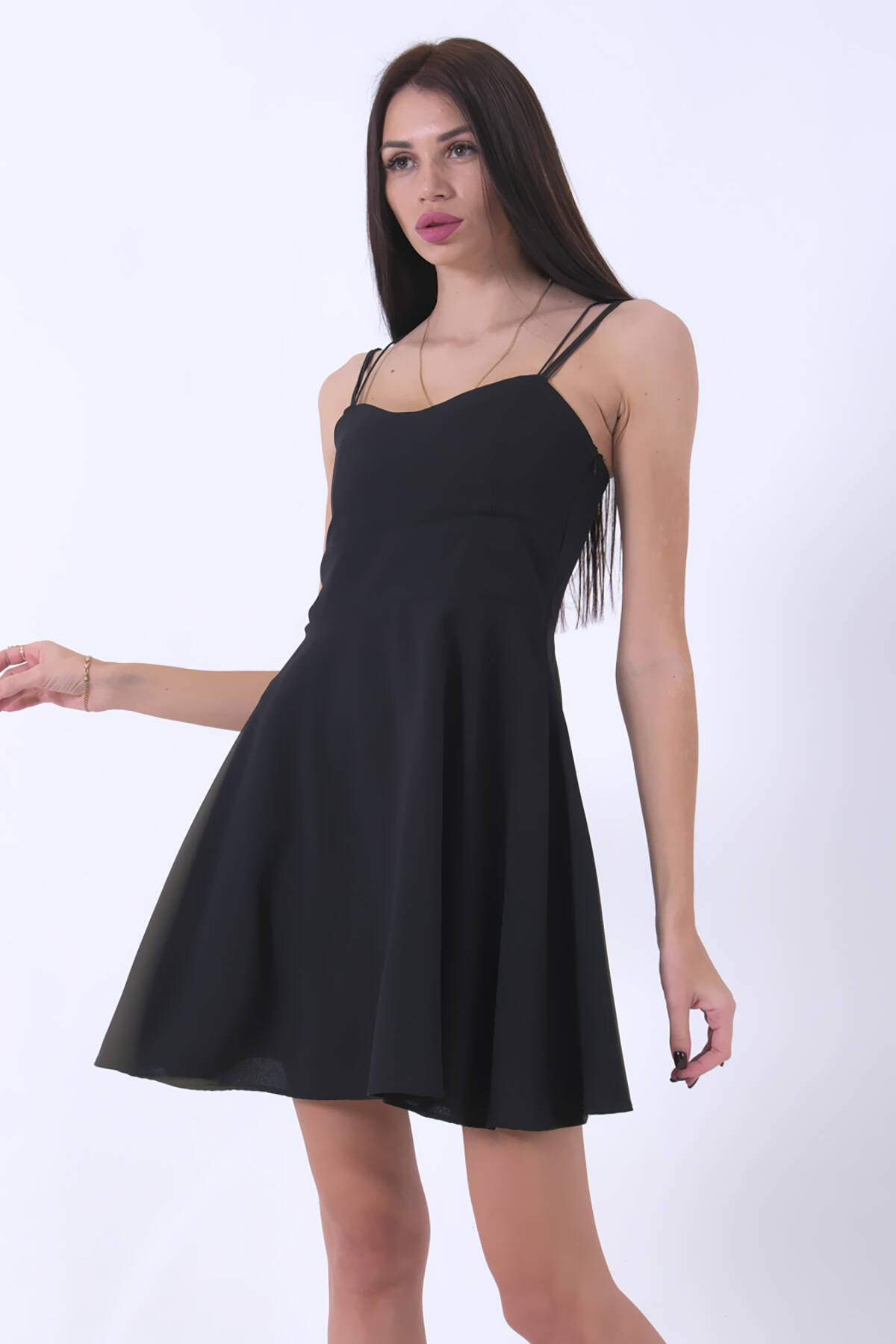 İnce Askılı Sırt Dekolteli V Yaka Kloş Siyah Abiye Elbise & Siyah Mezuniyet Elbisesi