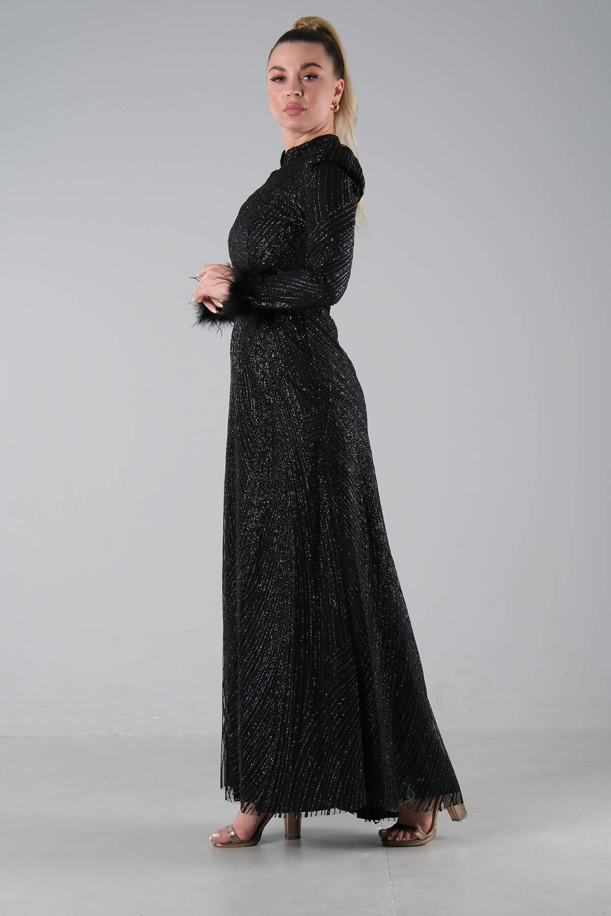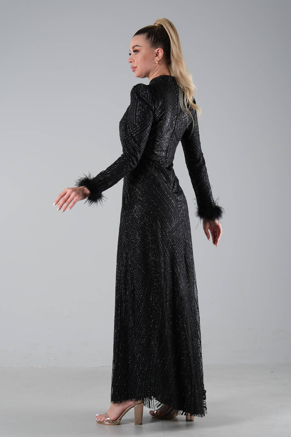 Siyah Kol Uçları Tüylü Abiye Elbise 6502437.01