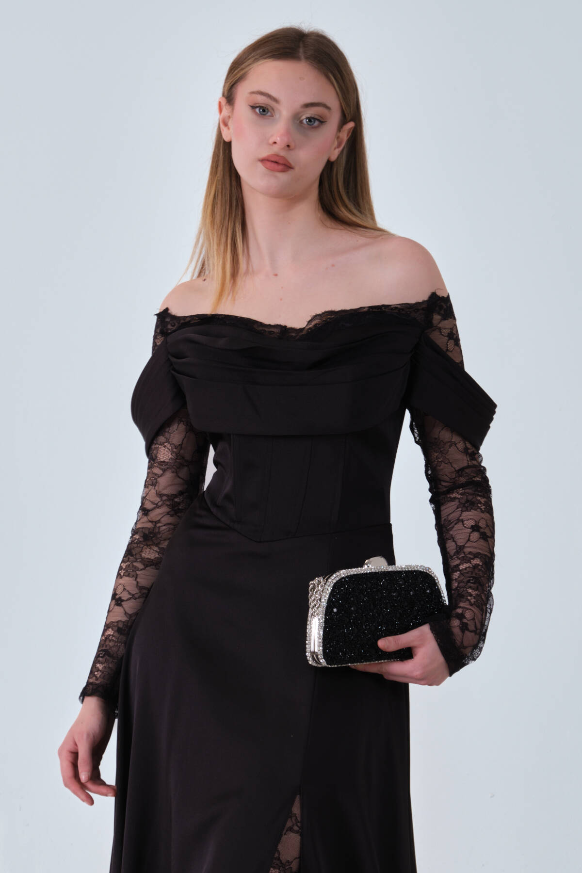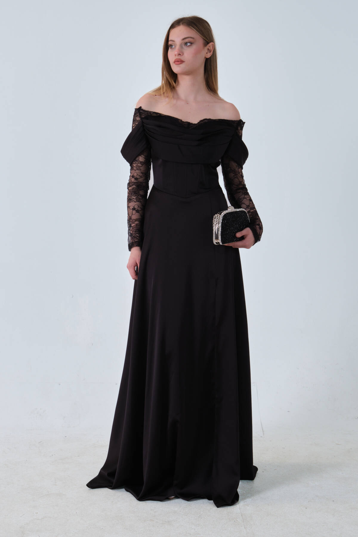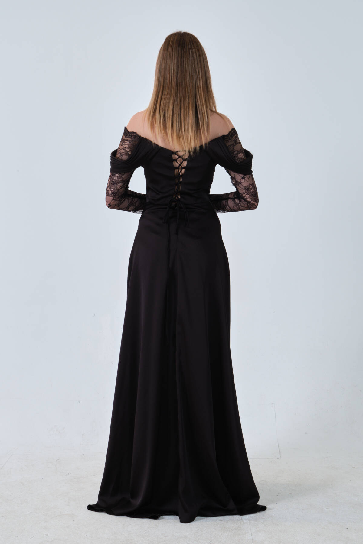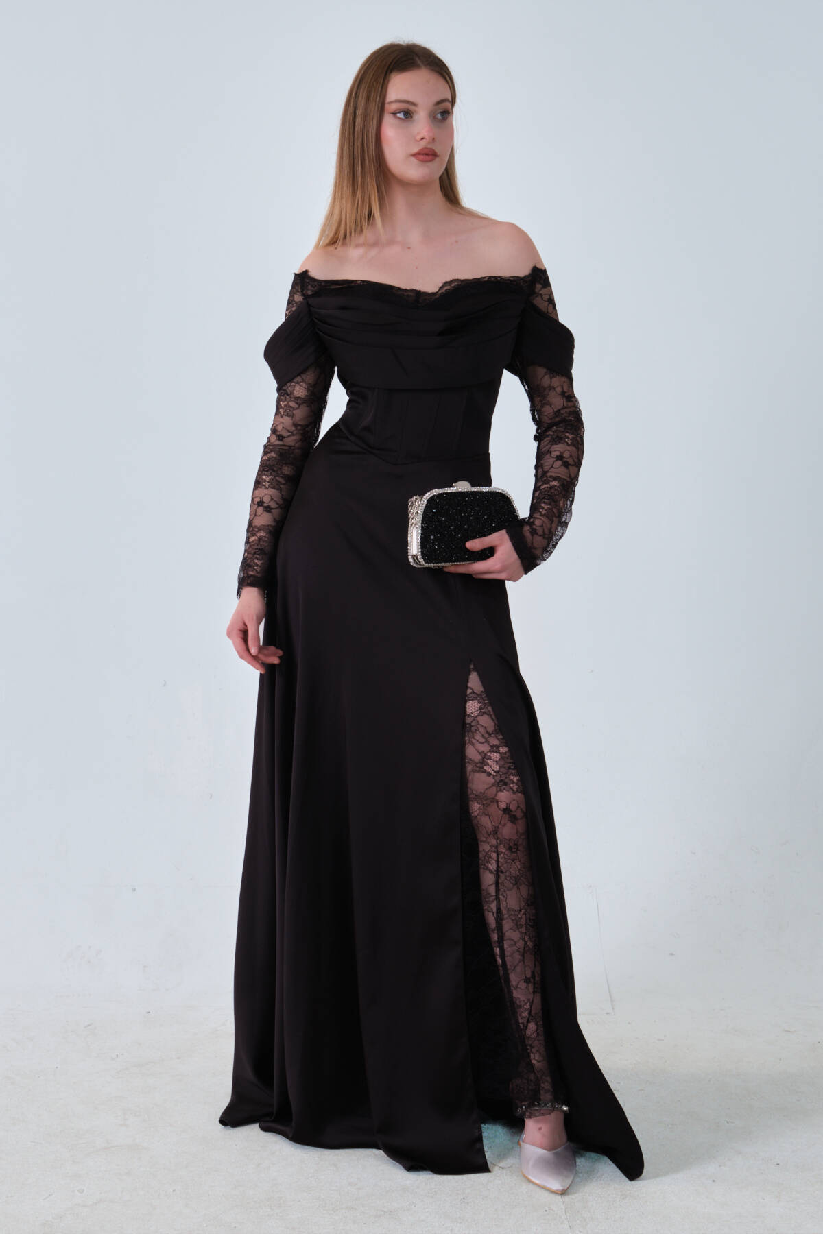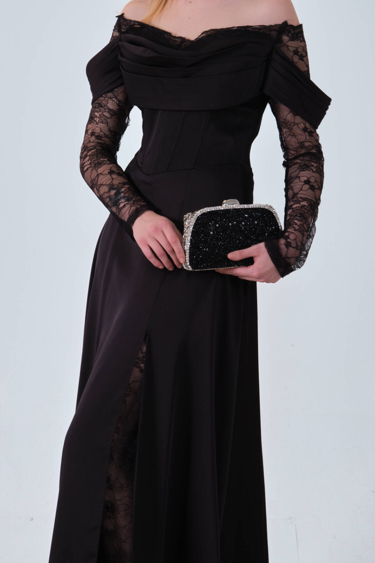 Siyah Kolları Dantel Detaylı Drapeli Abiye 9705561.01