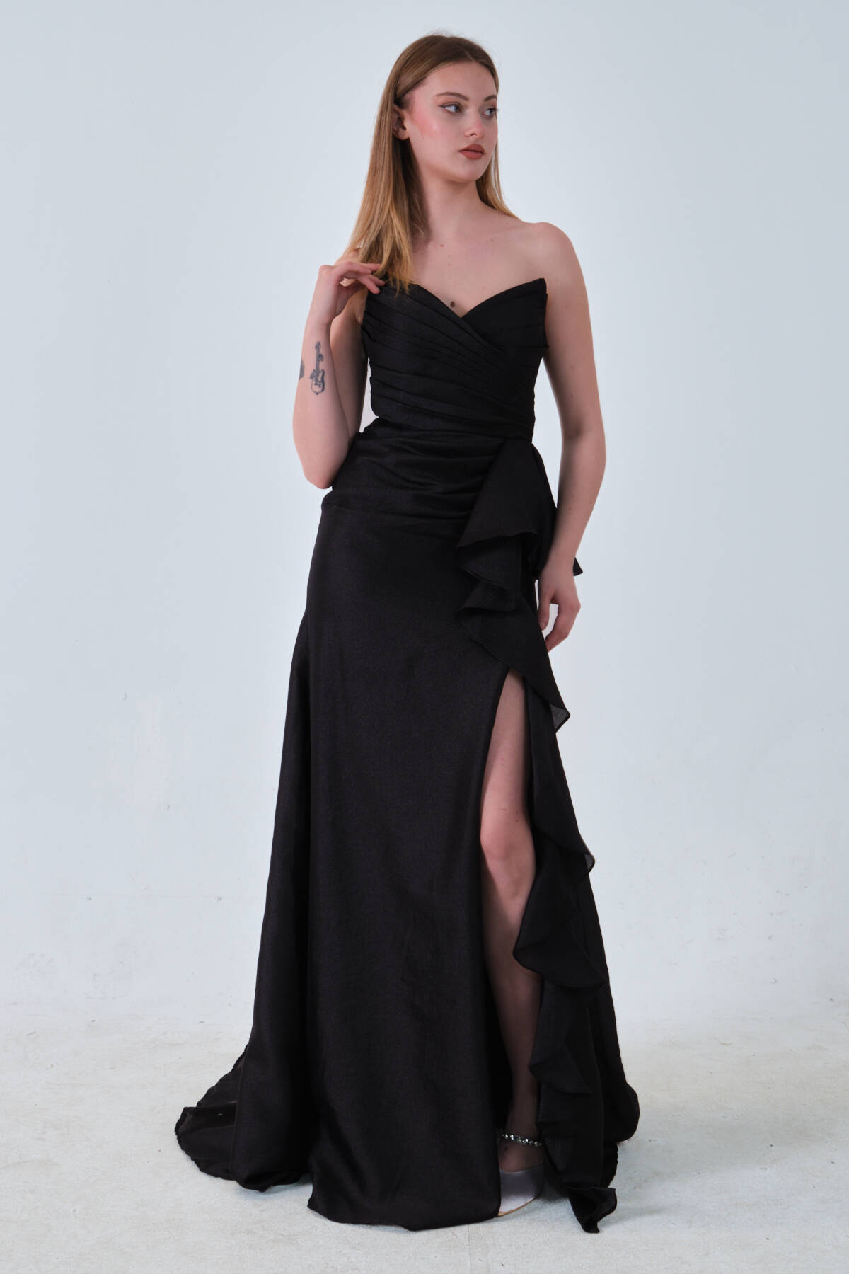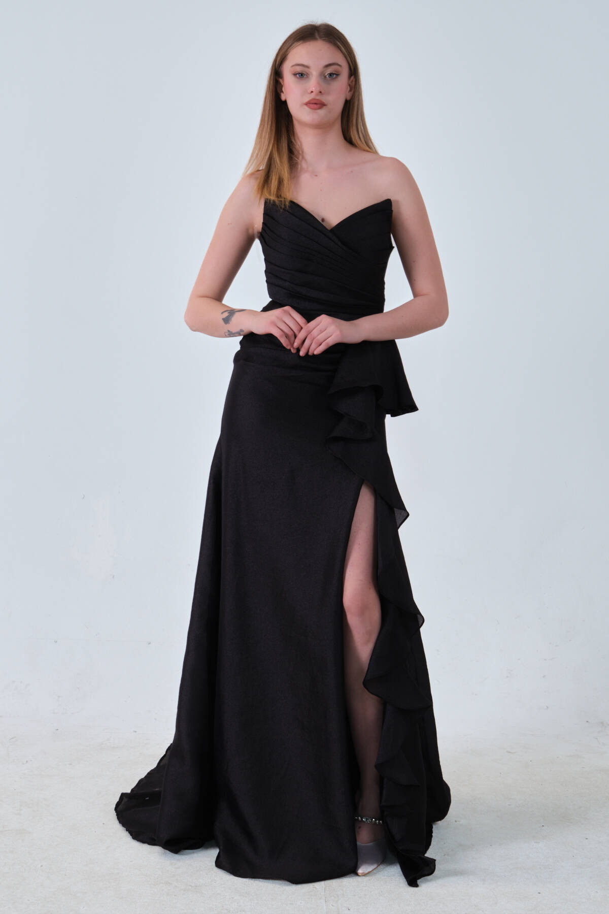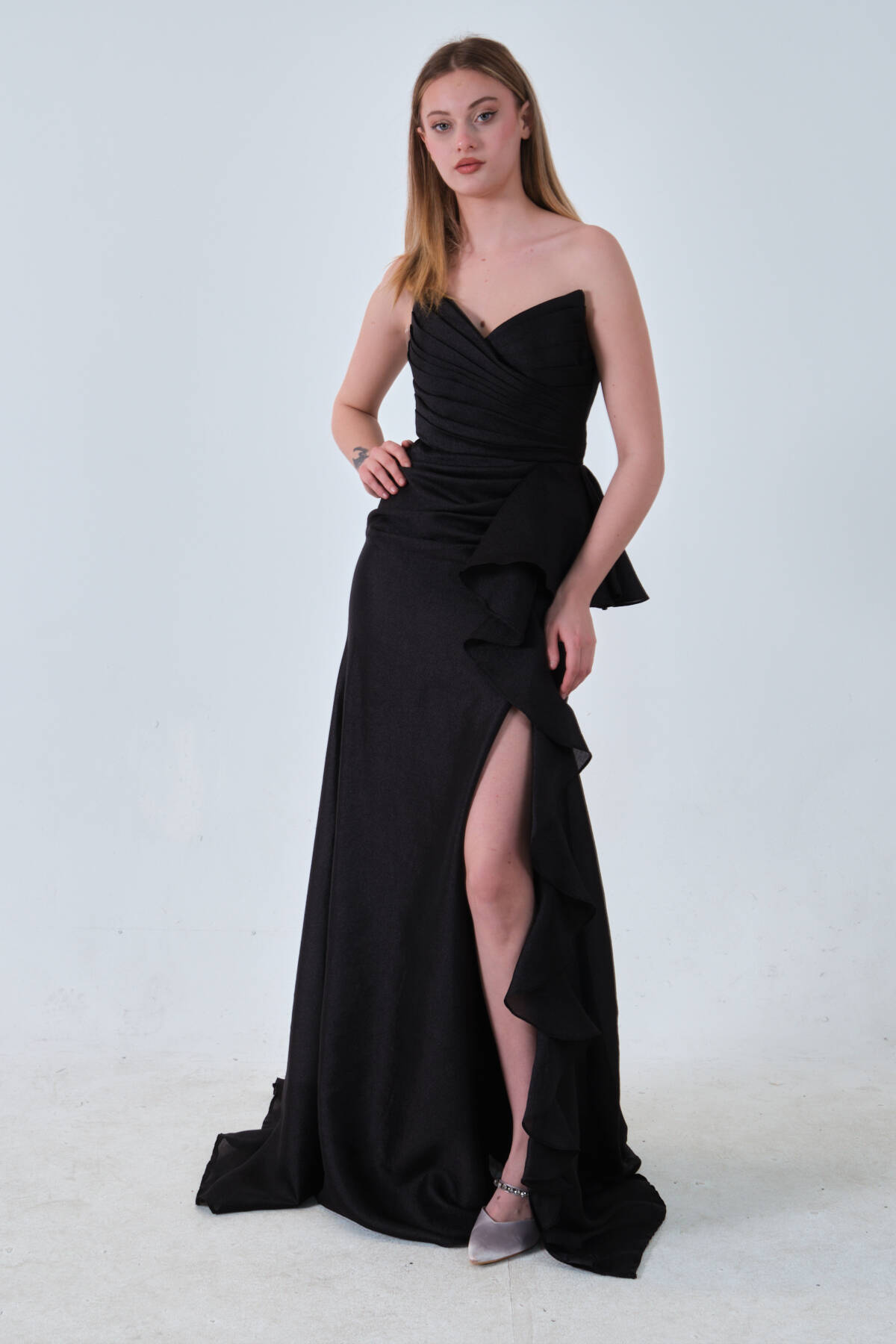Siyah Önü Fırfırlı Straplez Abiye 0801184.01