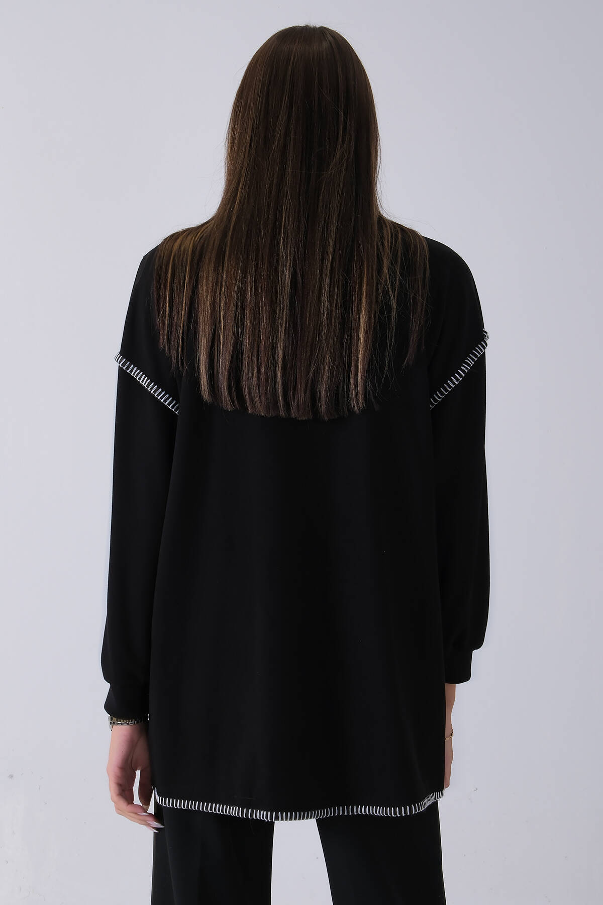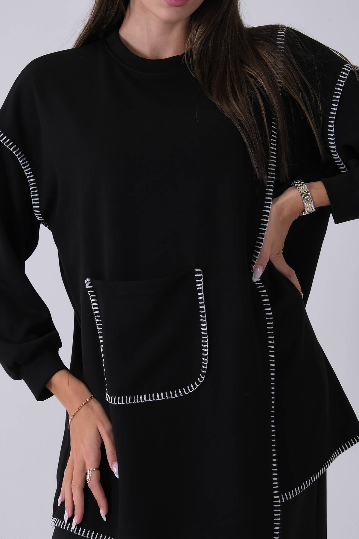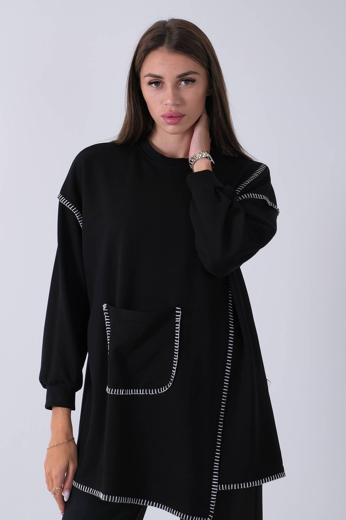 Siyah Önü Kanguru Cep Detaylı Çizgi Dikişli Bisiklet Yaka Tunik 940170263.01
