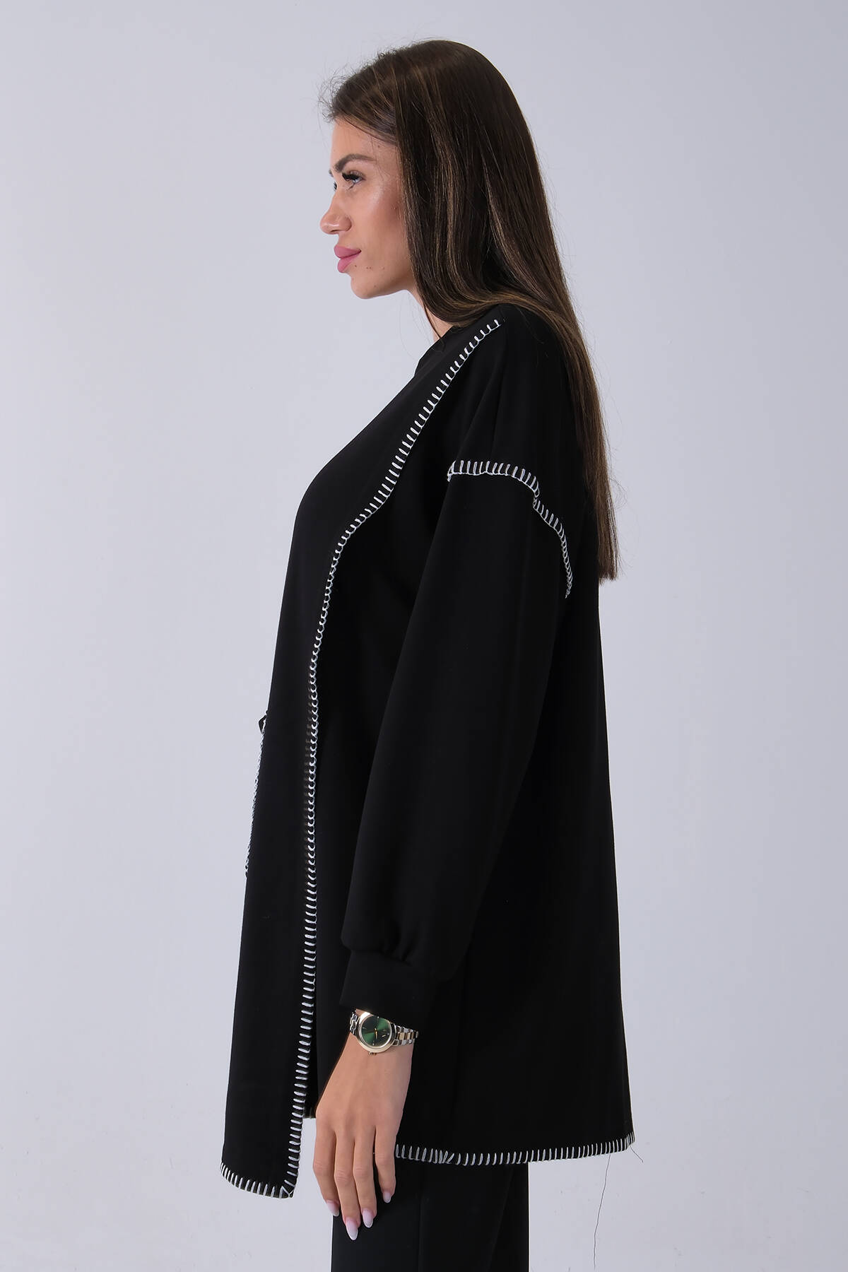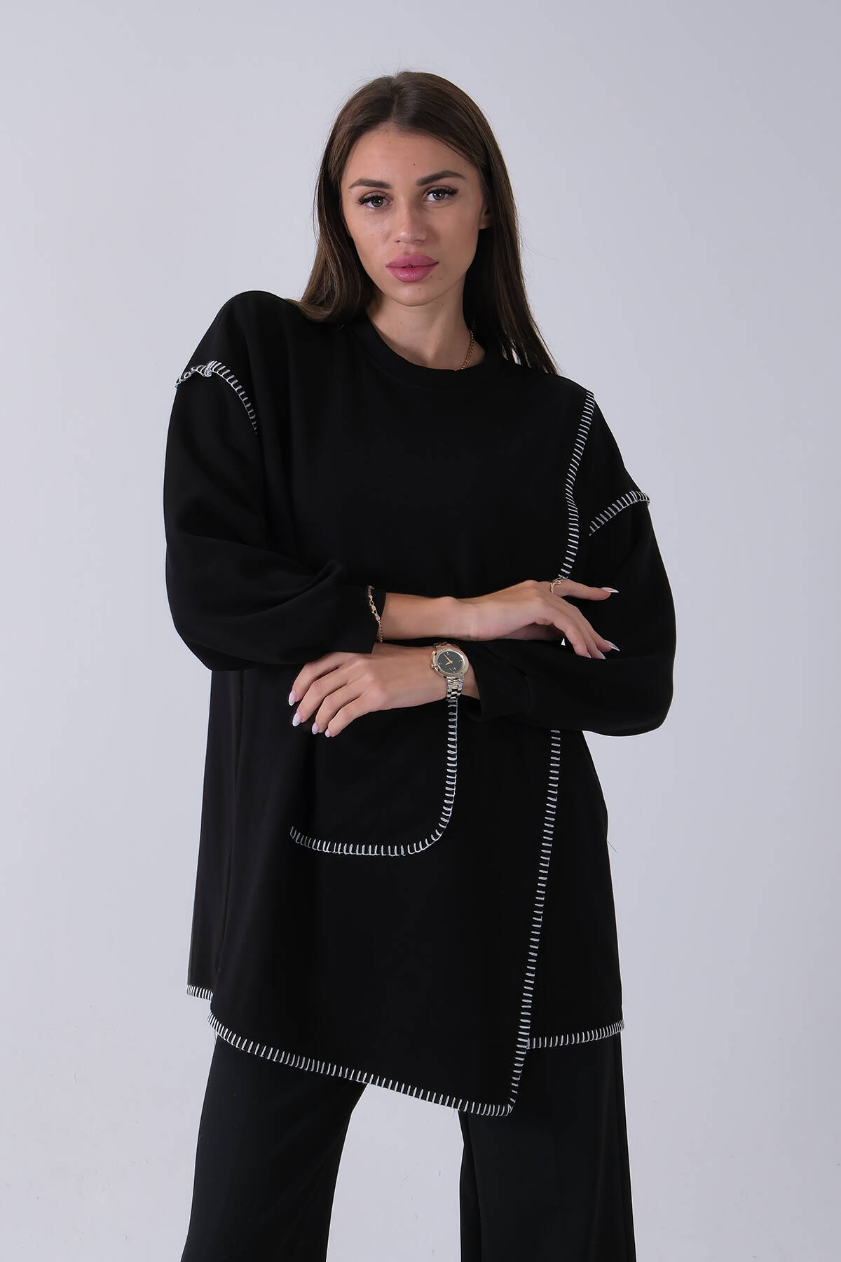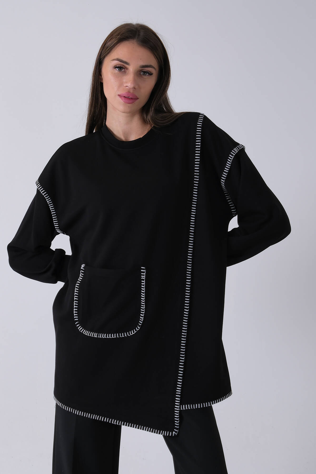 Siyah Önü Kanguru Cep Detaylı Çizgi Dikişli Bisiklet Yaka Tunik 940170263.01