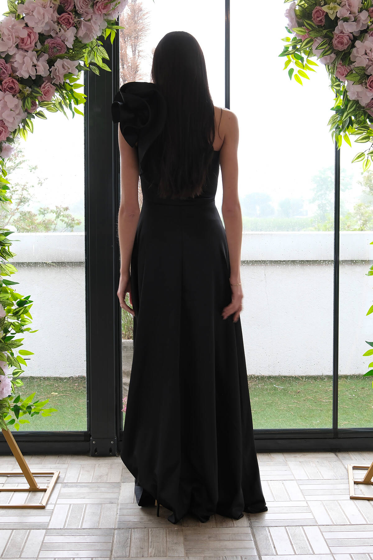 Siyah Çiçek Detaylı Pul Boncuk İşlemeli Kuyruklu Abiye 9705650.01
