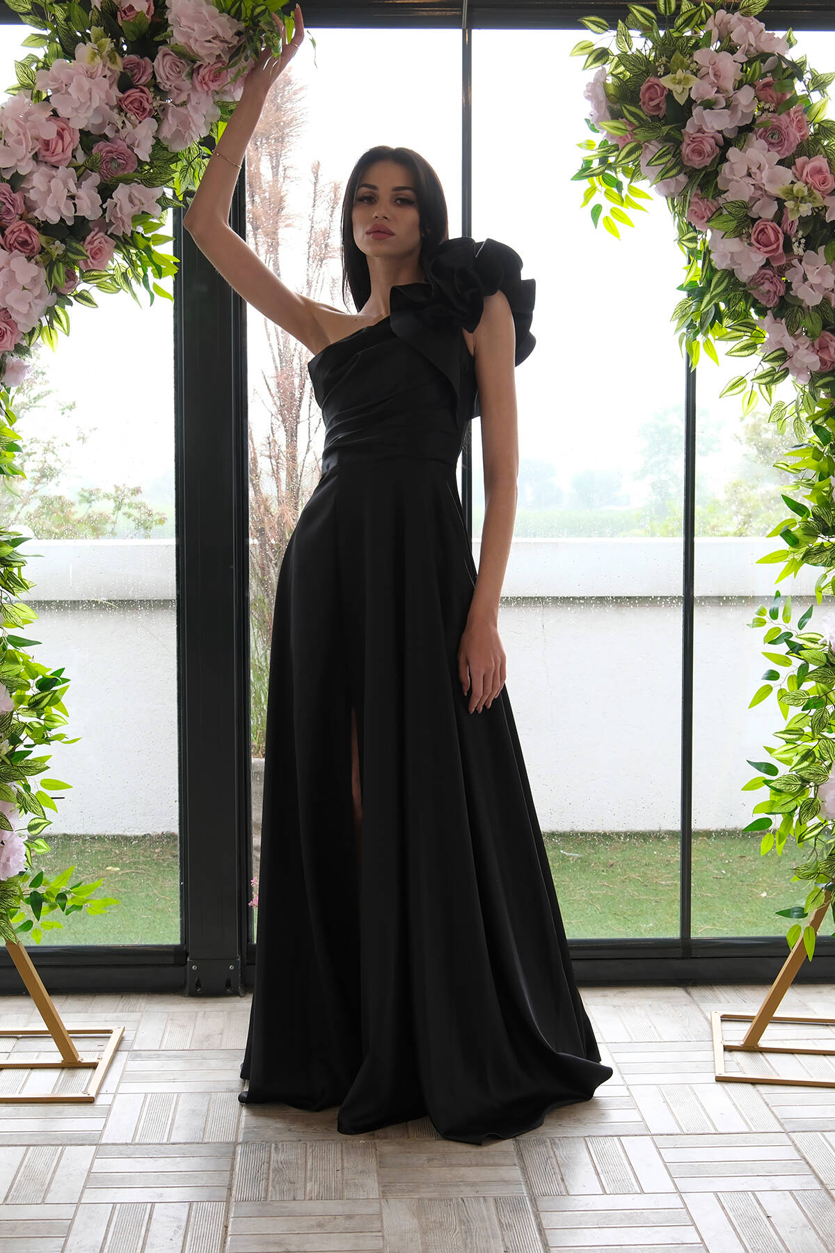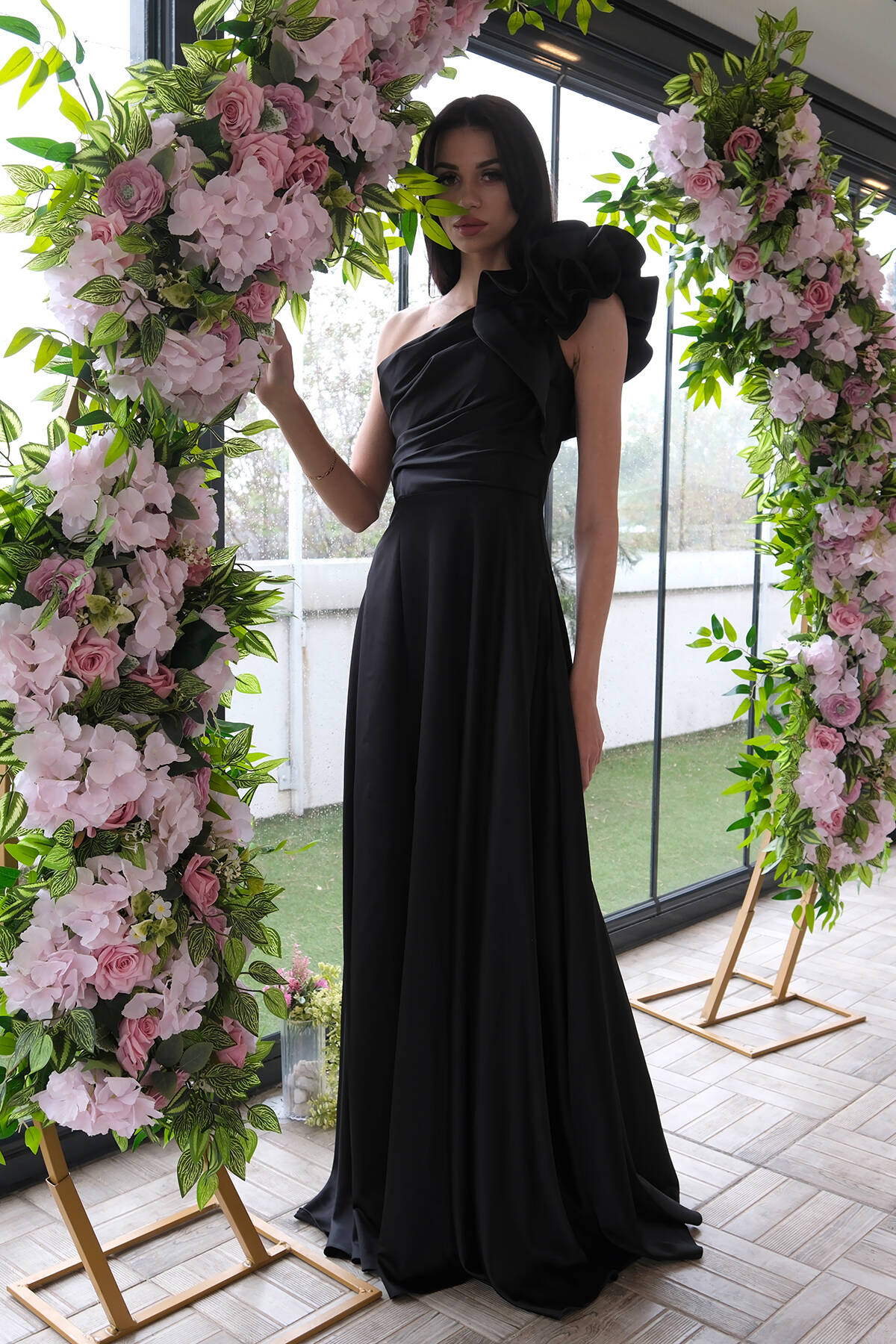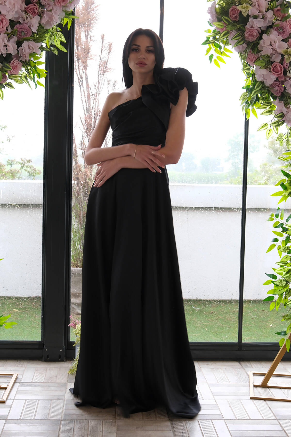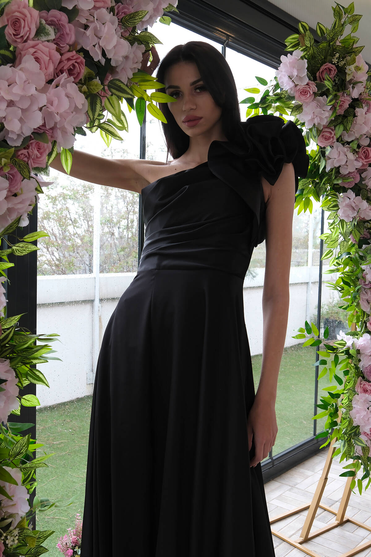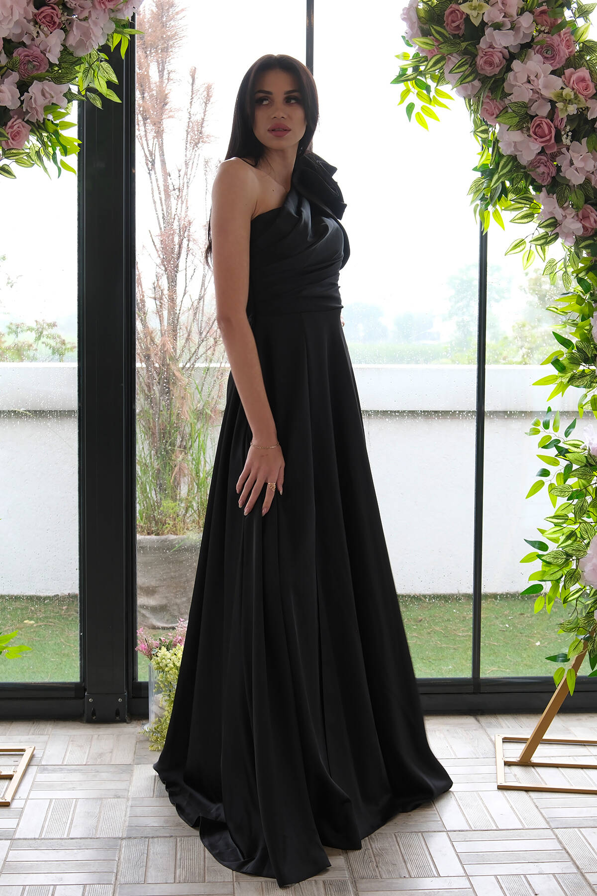 Siyah Saten Omuz Fiyonklu Abiye Elbise 1302192.01