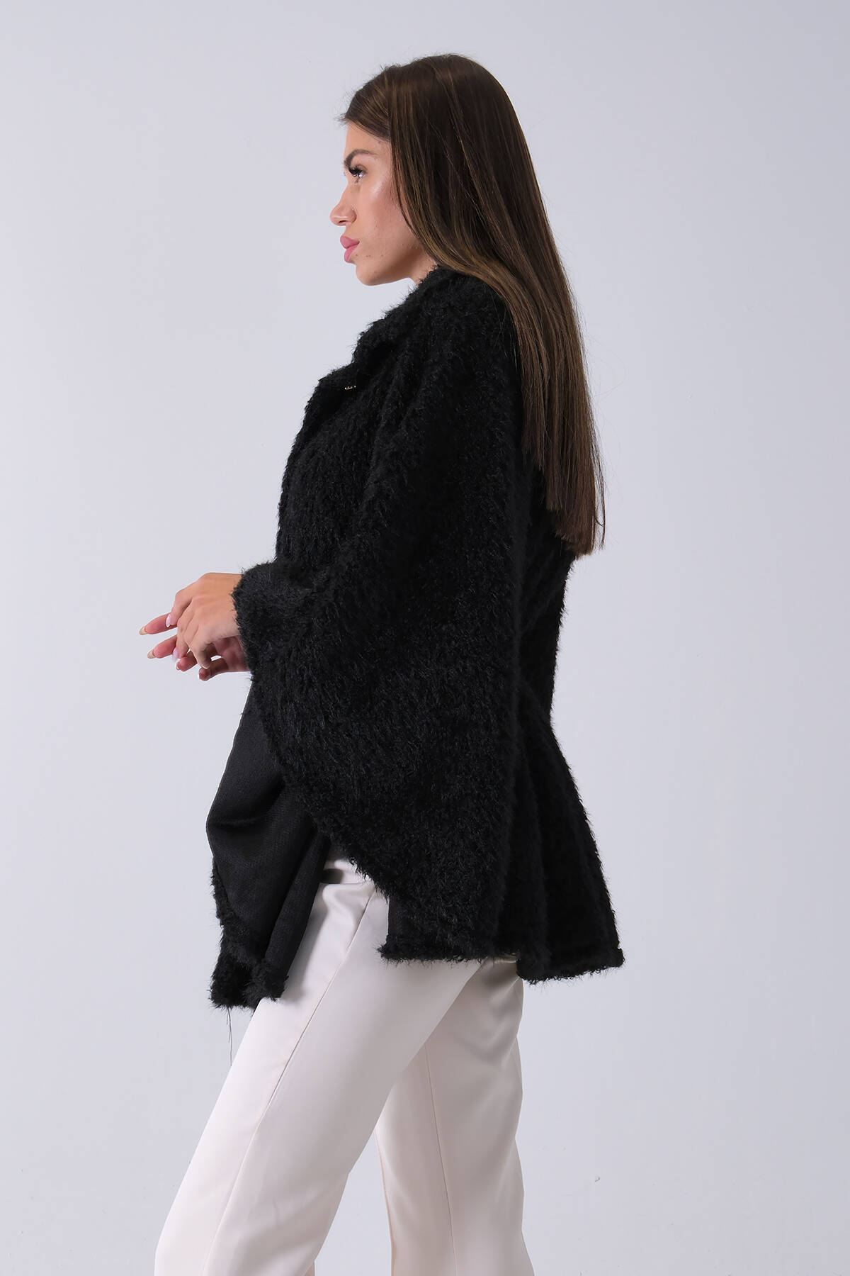 Siyah Tek Düğme Kapamalı Kemerli Yün Peluş Ceket 940140183.01