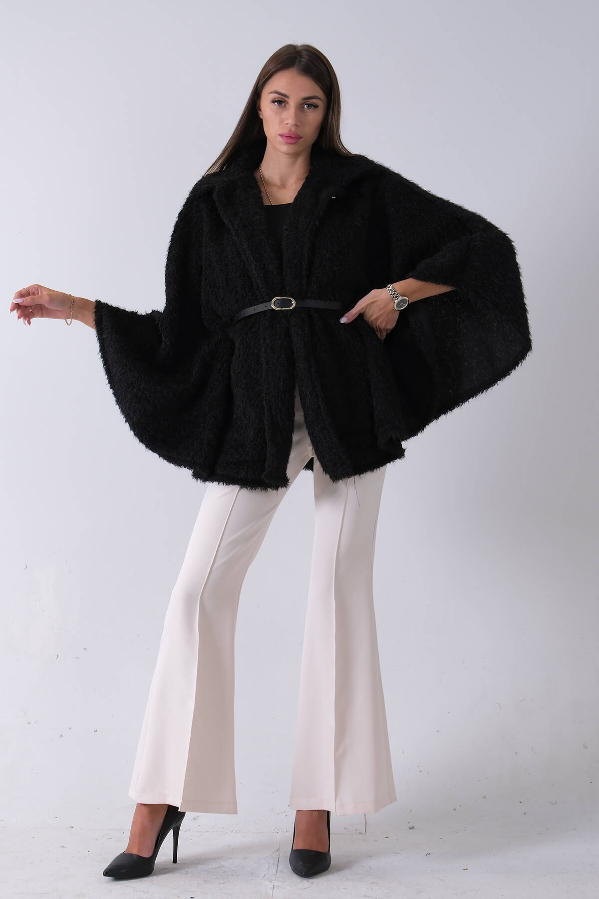 Siyah Yakalı Kendinden Pelerinli Kemerli Deri Ceket 5309366.01
