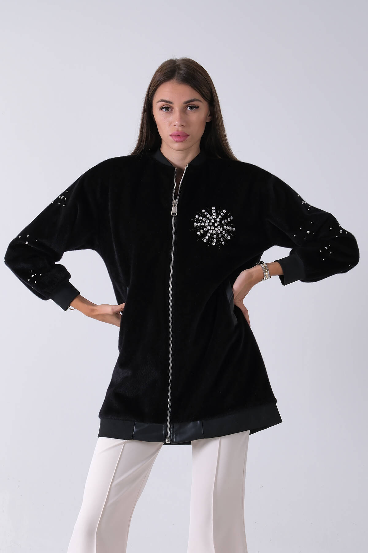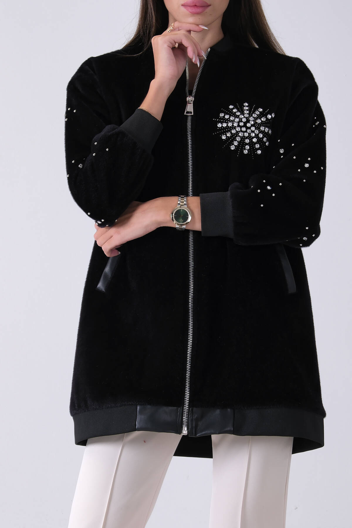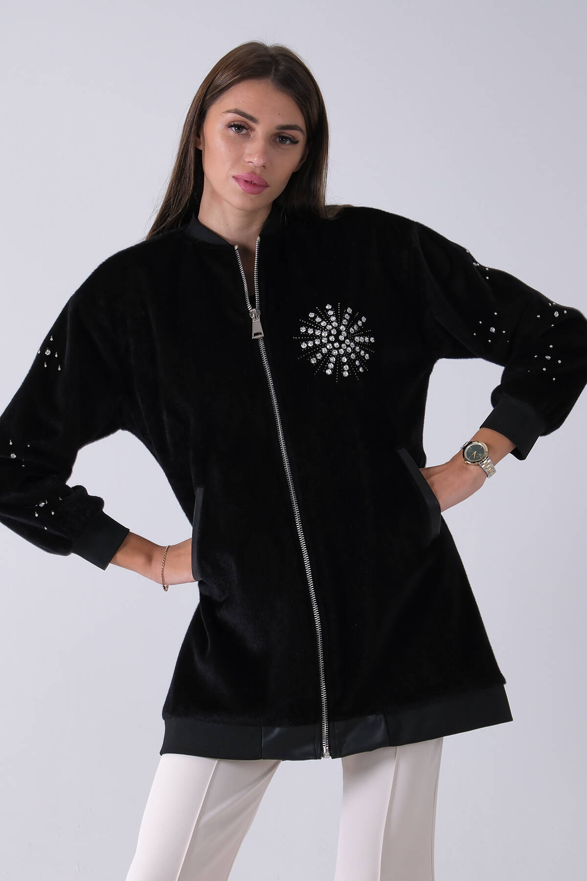 Siyah Üzeri Taş Detaylı Yandan Cepli Peluş Hırka 4701420.01